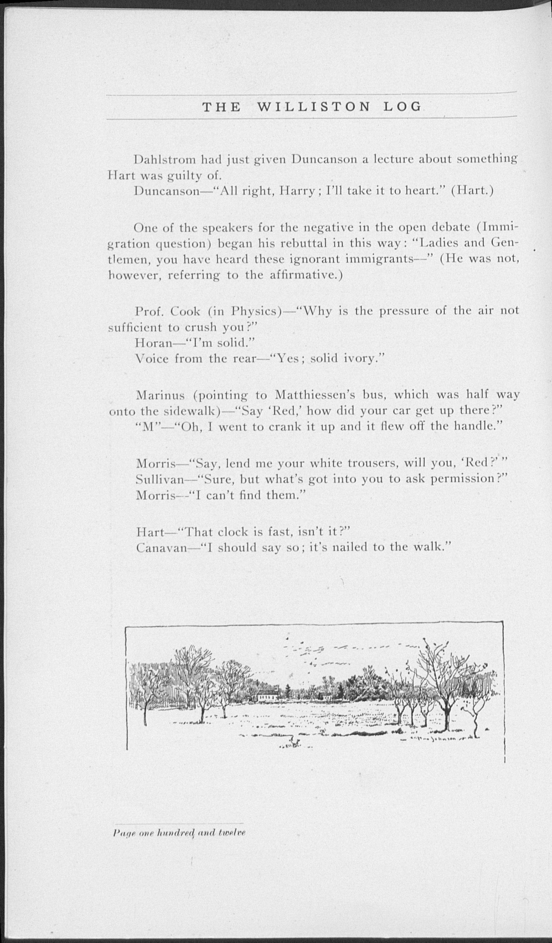 Marinus (pointing to Matthiessen's bus, which was half way onto the sidewalk)—"Say 'Red,' how did your car get up there?" "M"—"Oh, I went to crank it up and it flew off the handle."