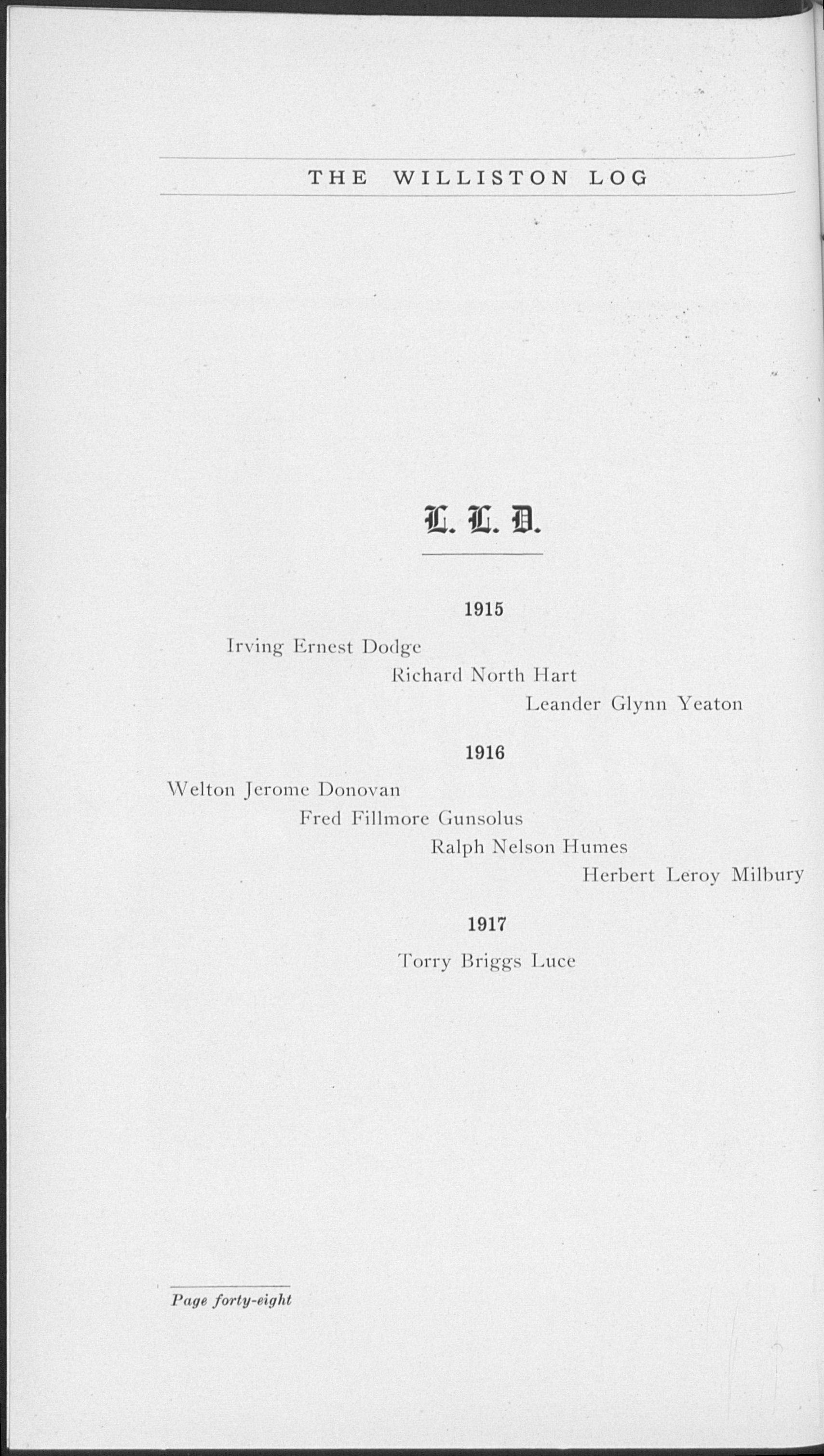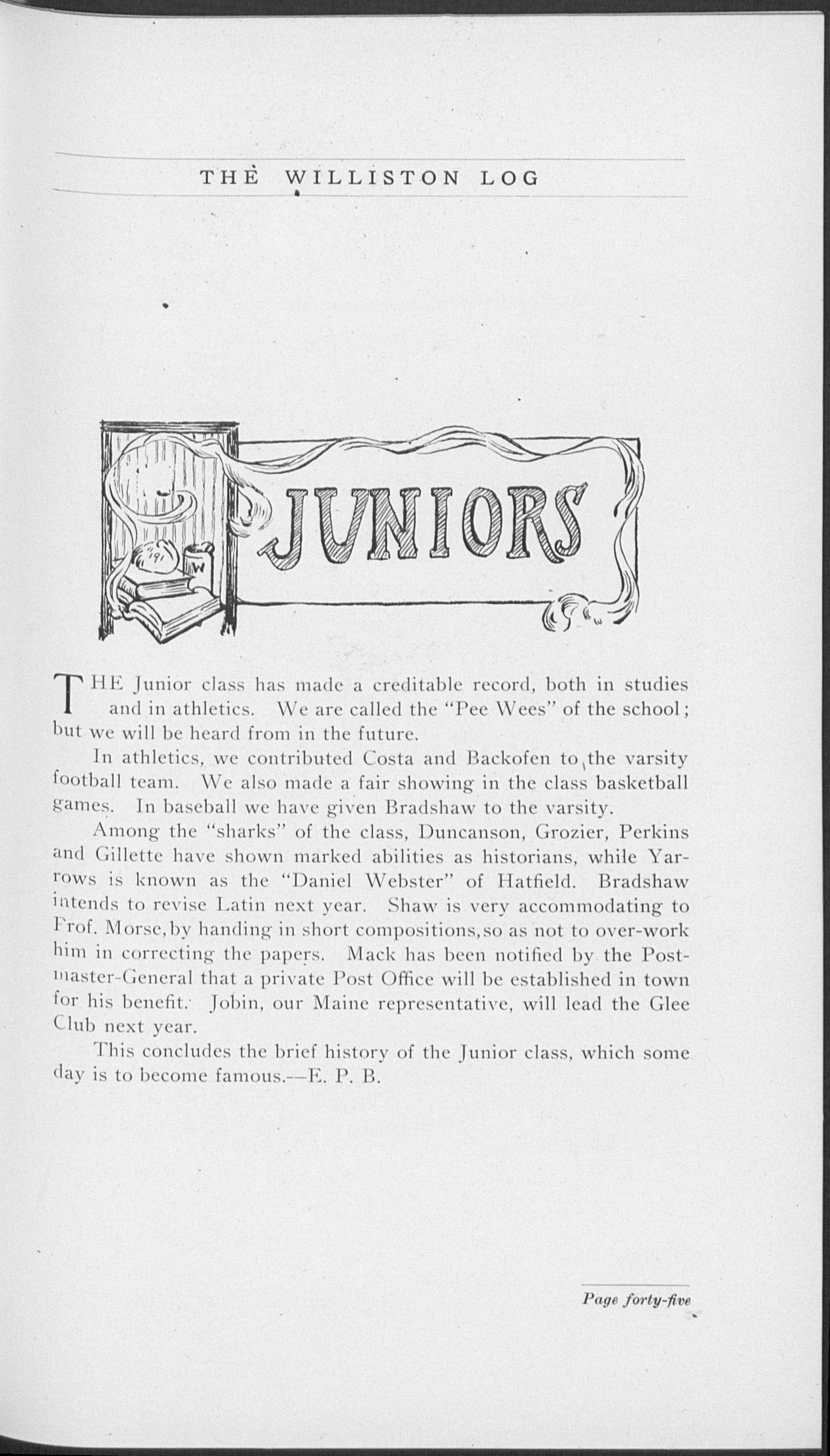 N the presentation • of this "Log," the fourteenth annual publica. tion of school activities at Williston, the Editors have introduced a few radical changes and have endeavored to conform to the size of the Senior Class. These changes it is hoped will be acceptable to the school and will furnish a pleasing contrast to former Publications. We have endeavored to represent not only the Senior Class, but school activities of every nature.