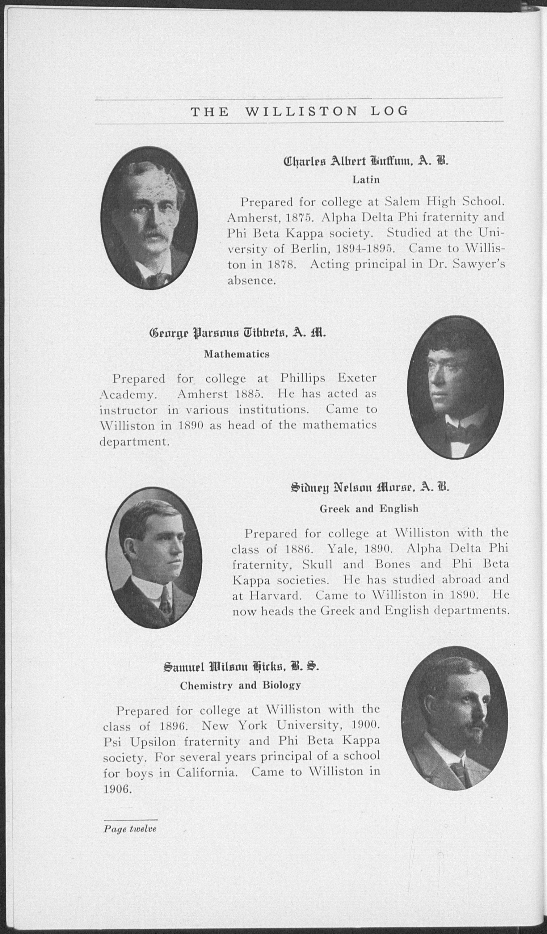 Prepared for college at Salem High School. Amherst, 1875. Alpha Delta Phi fraternity and Phi Beta Kappa society. Studied at the University of Berlin, 1894-1895. Came to Williston in 1878. Acting principal in Dr. Sawyer's absence.
