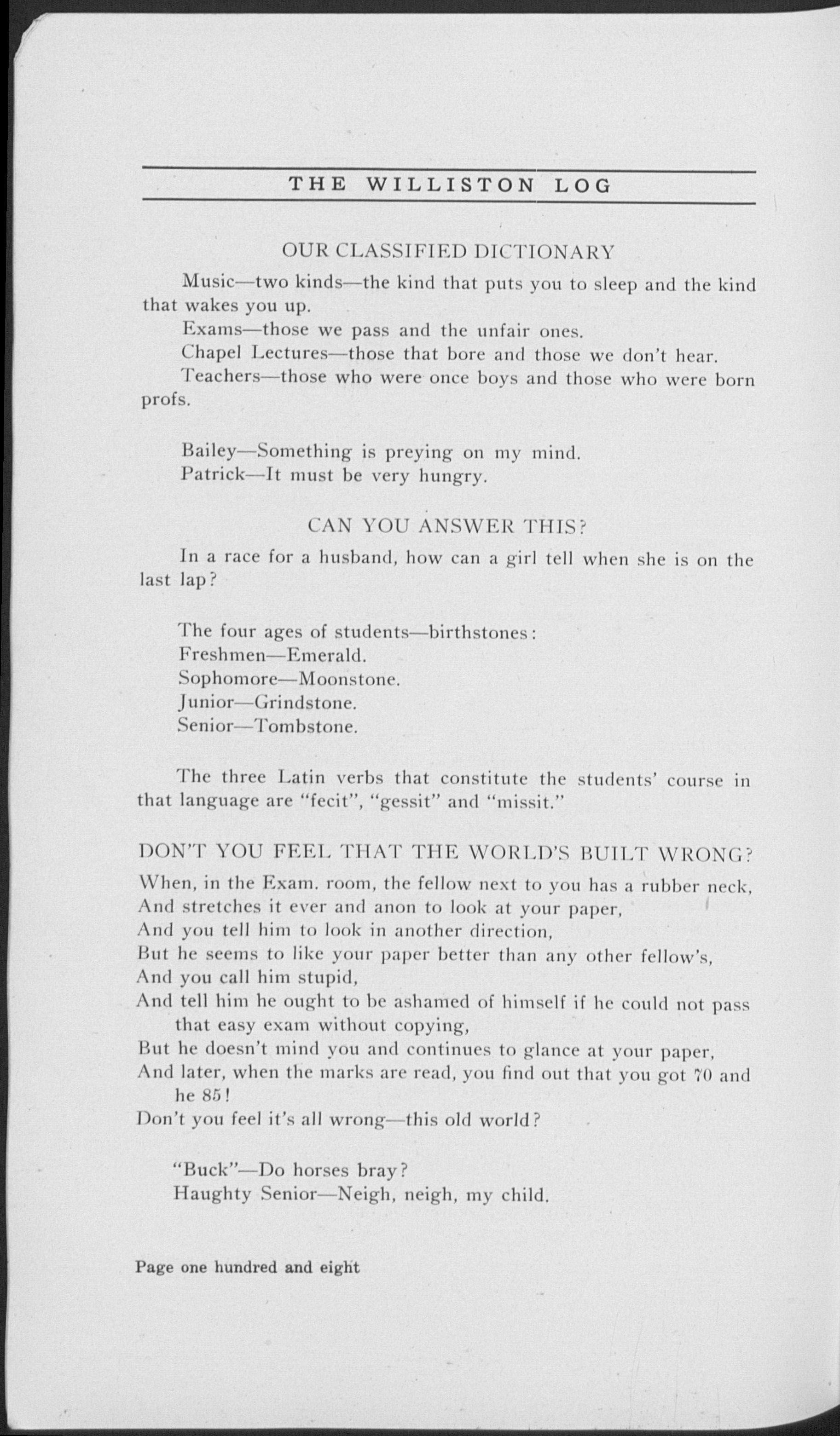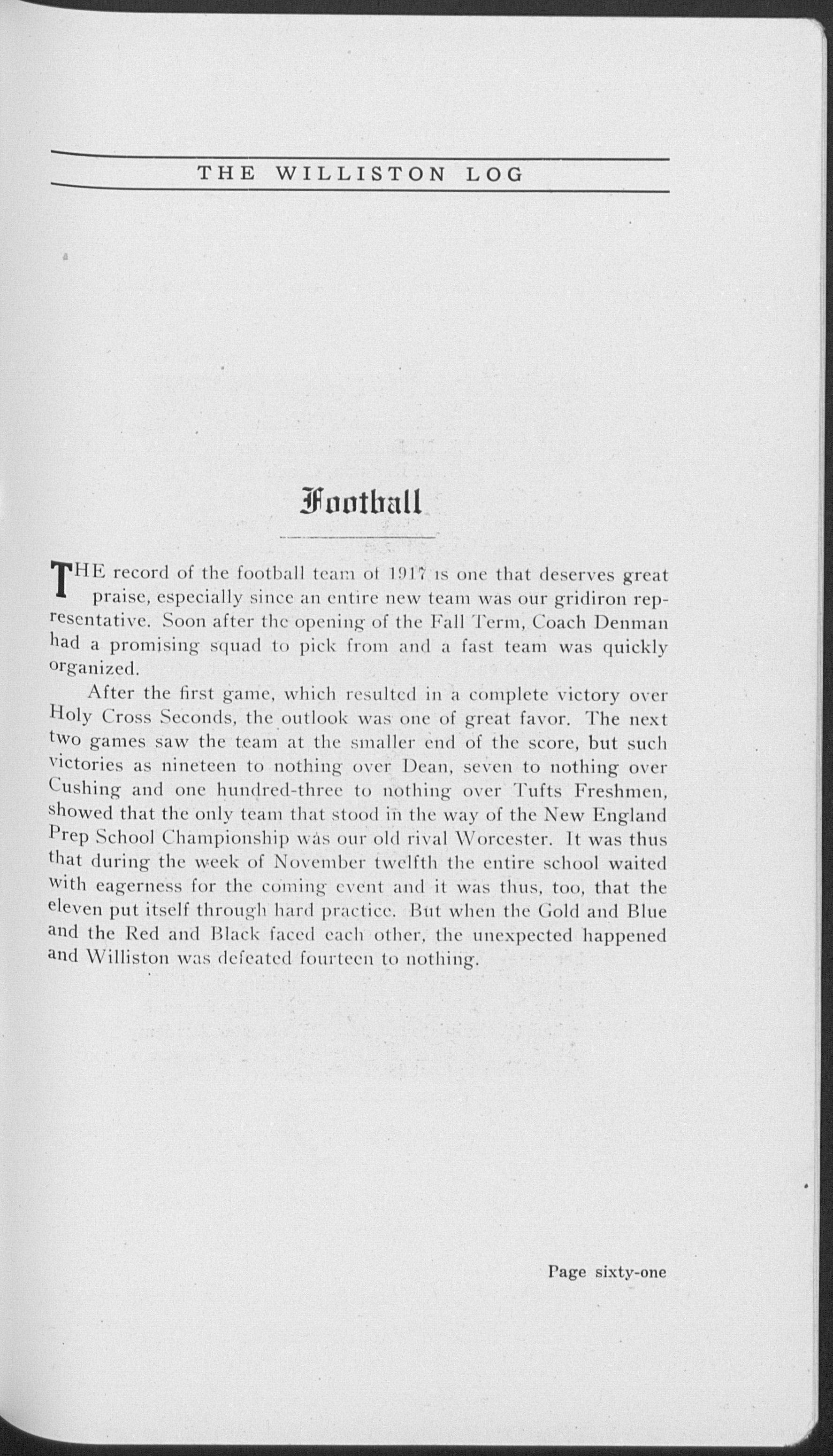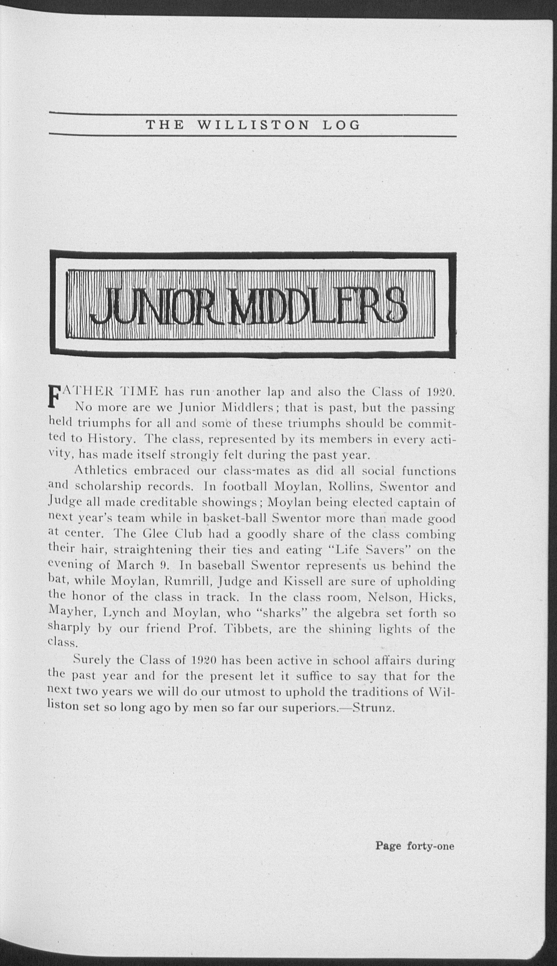 NI presenting this publication, the editors have endeavored to make it purely and simply what its name indicates, a "Log", a faithful and detailed record of the: past year and one which every Williston man would be glad to own. No time or work has been spared in order to have the articles interesting and true to life—no expense that would make the illustrations better has been avoidea ; but "write ups" cannot give the whole story of life at Williston, and pictures do not always show our class mates as we remember them. Take this volume, therefore, as a souvenir; value it, not for itself, but for the memories it will later call to mind,—not for what it is, but for what it stands.—THE BOARD.