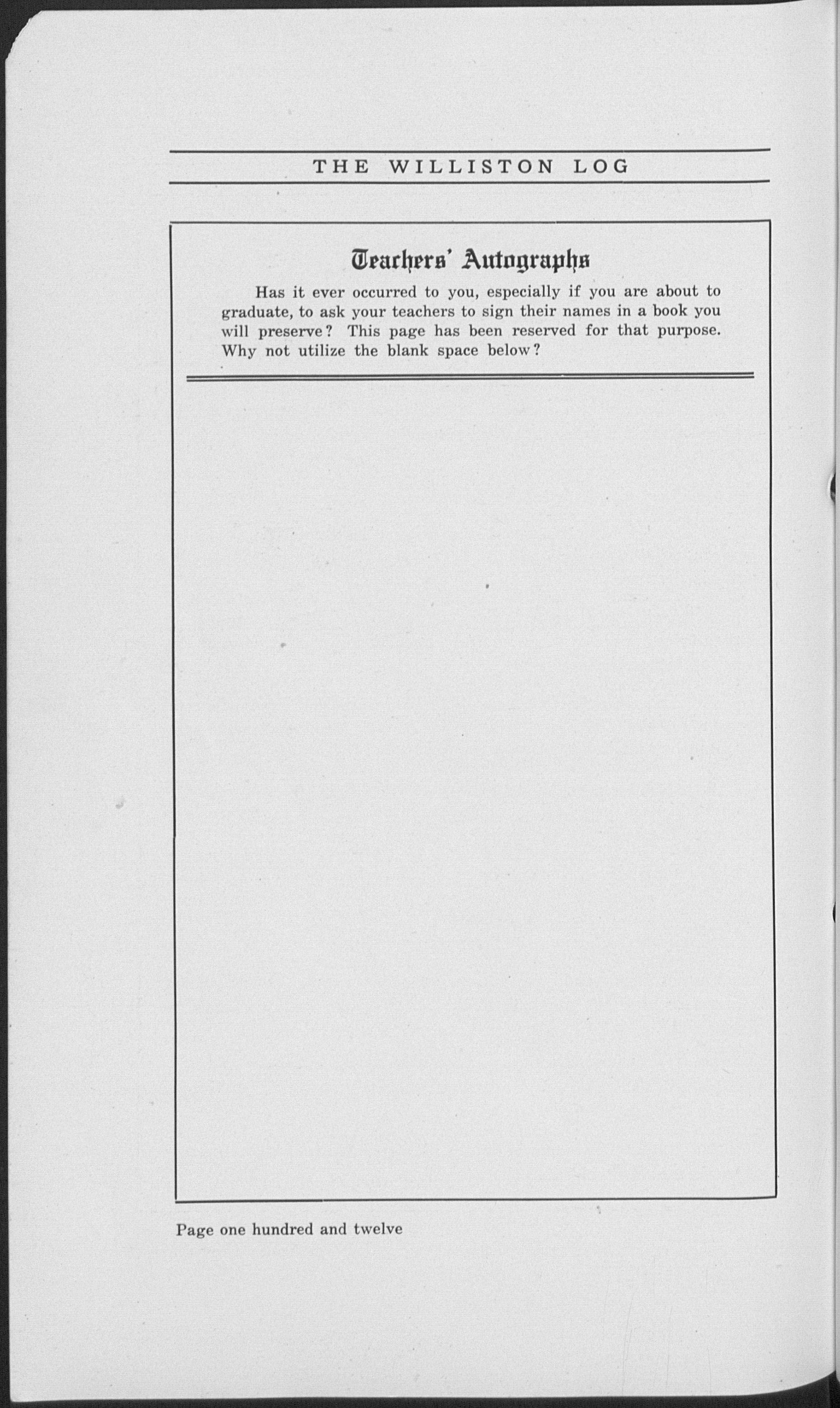 Although the pictures in this book will serve, in later years, to bring back memories of your Williston classmates, a more personal remembrance is to be desired. Can you think of anything better than your friends' signatures?