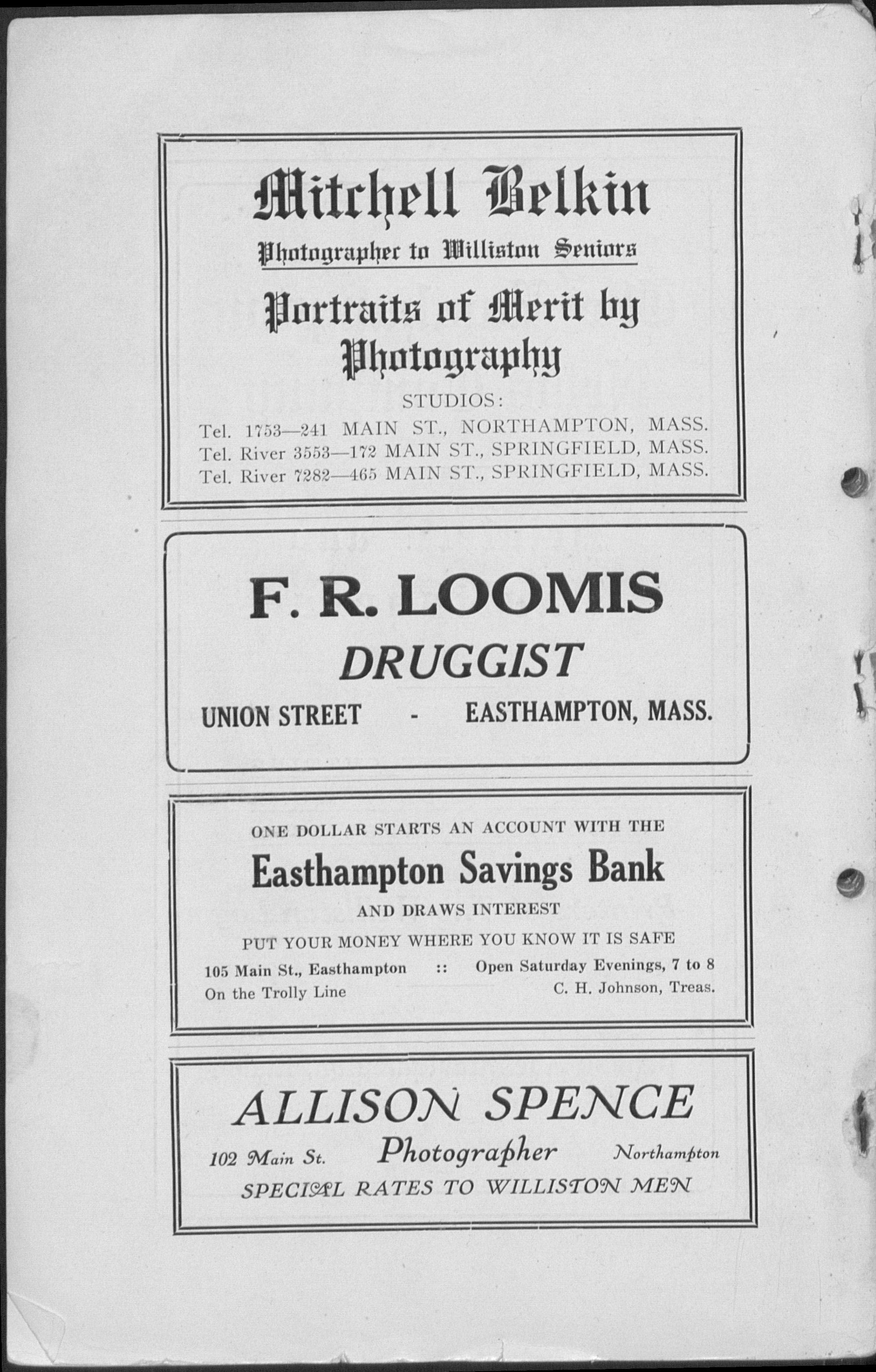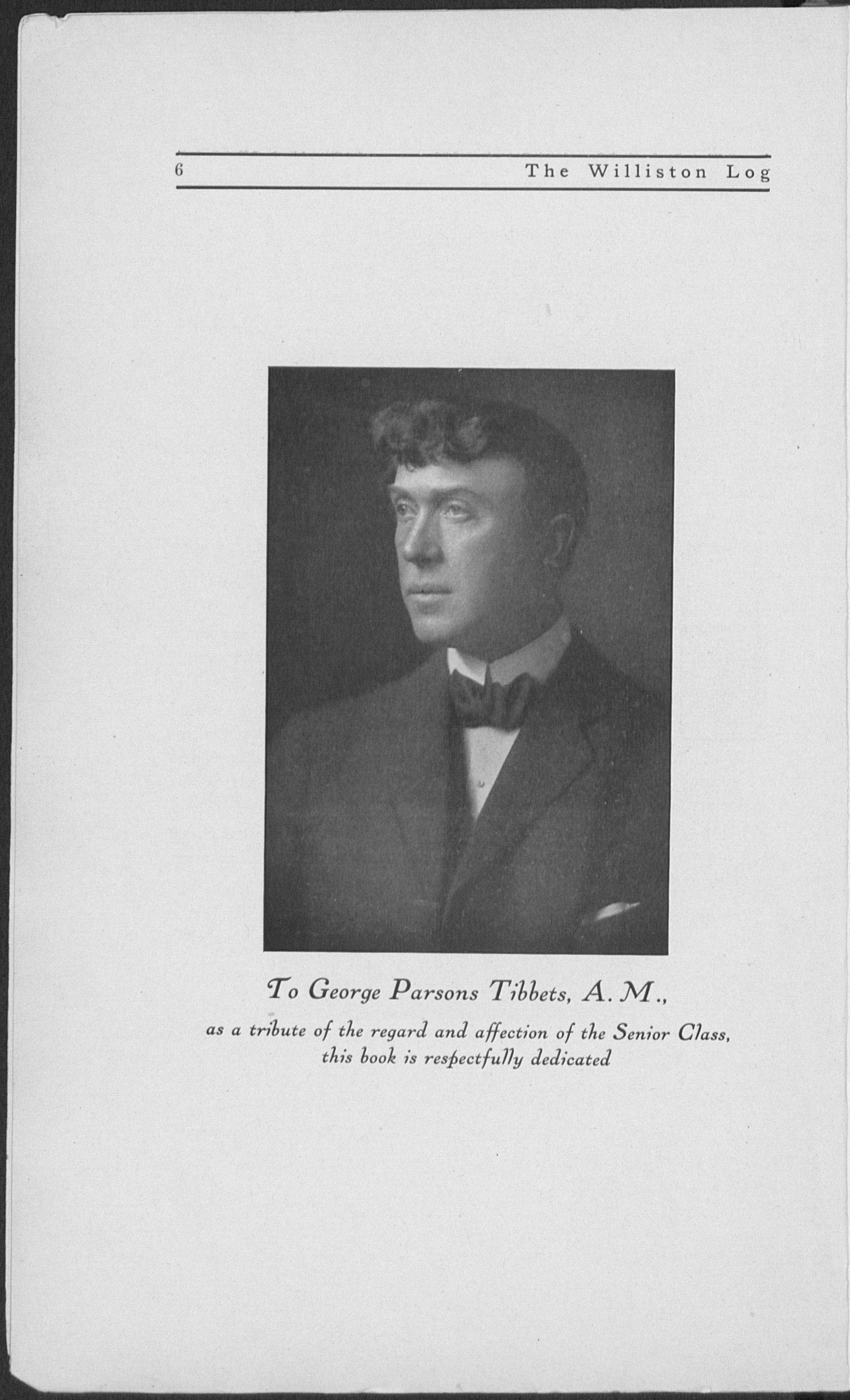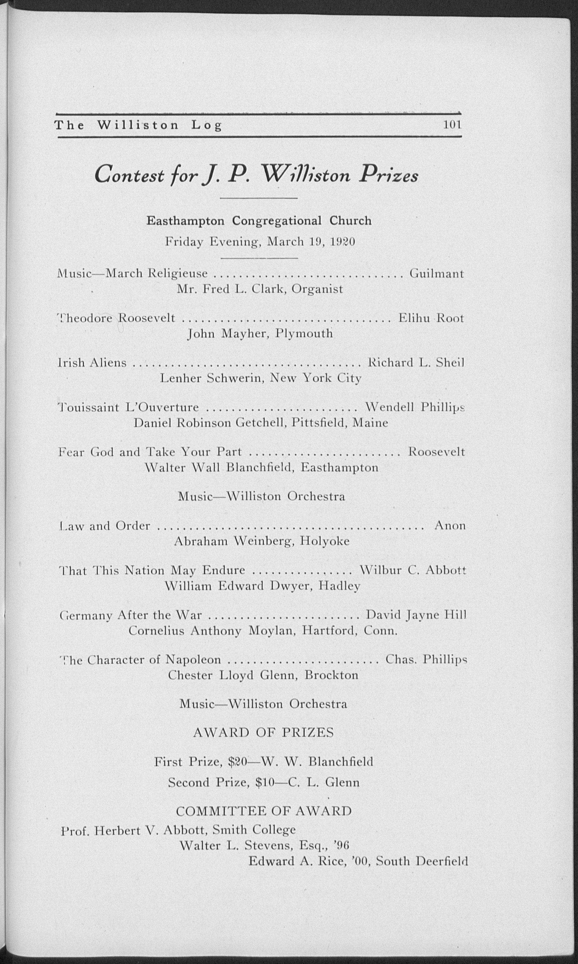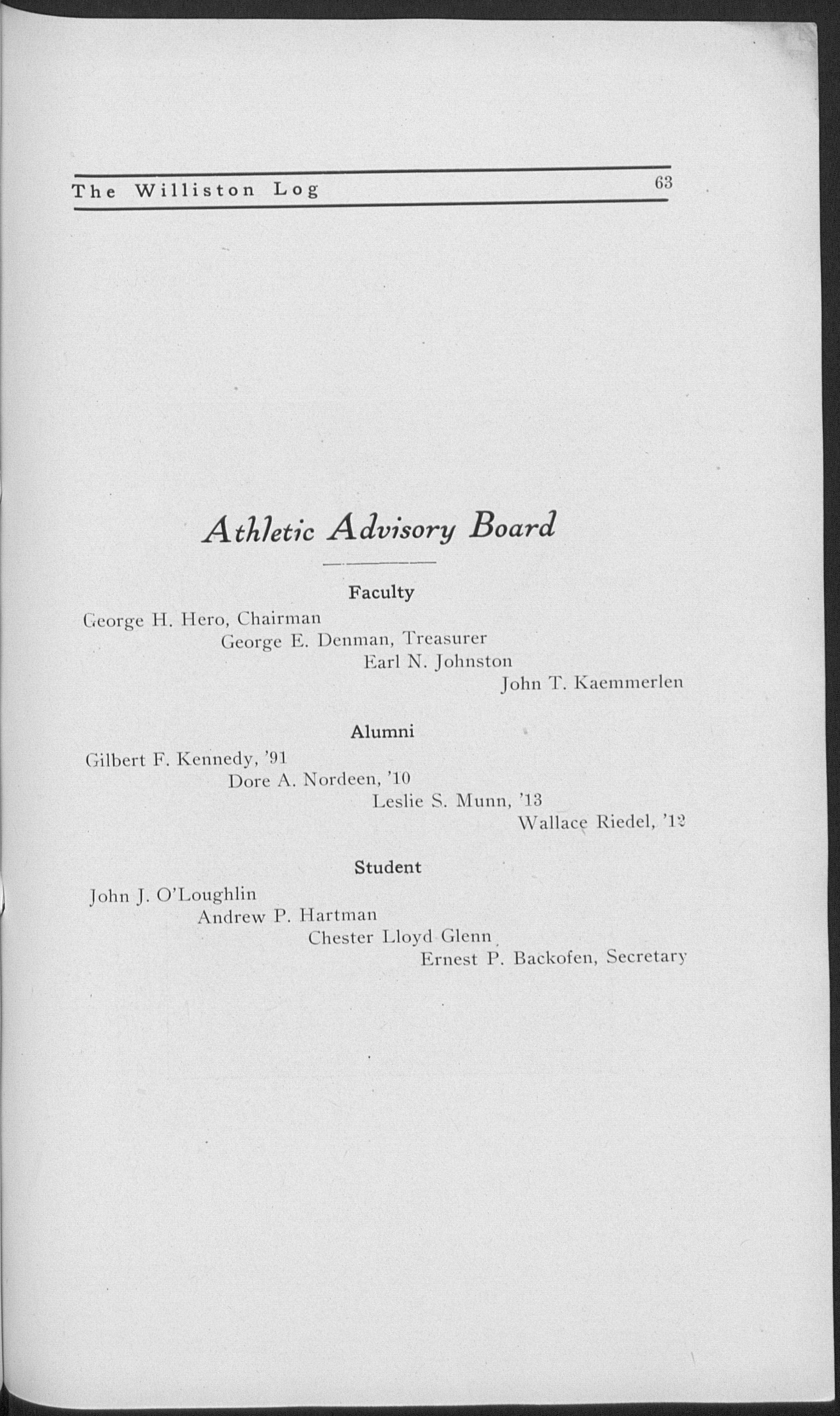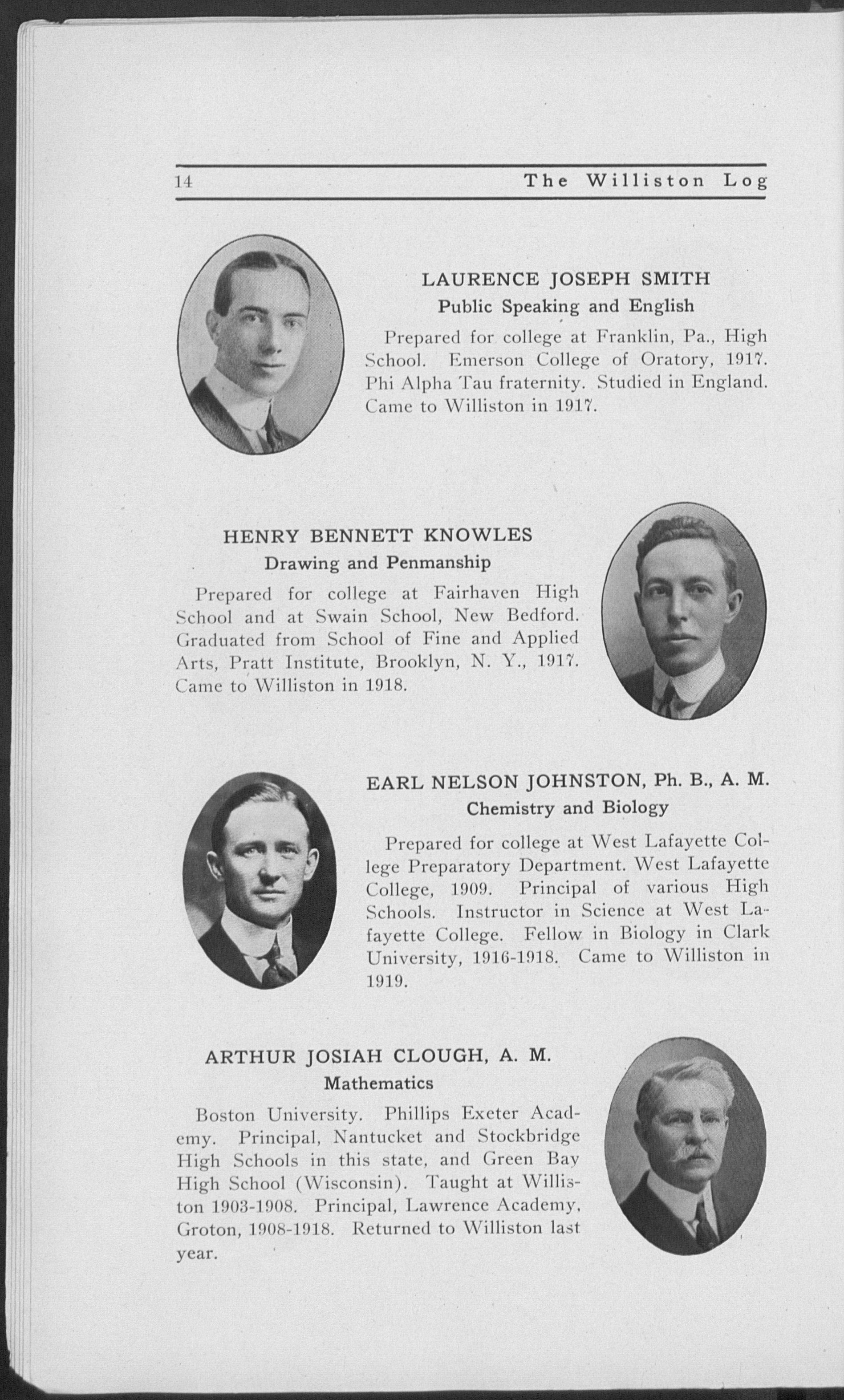 Boston University. Phillips Exeter Academy. Principal, Nantucket and Stockbridge High Schools in this state, and Green Bay High School (Wisconsin). Taught at Williston 1903-1908. Principal, Lawrence Academy, Groton, 1908-1918. Returned to Williston last year.