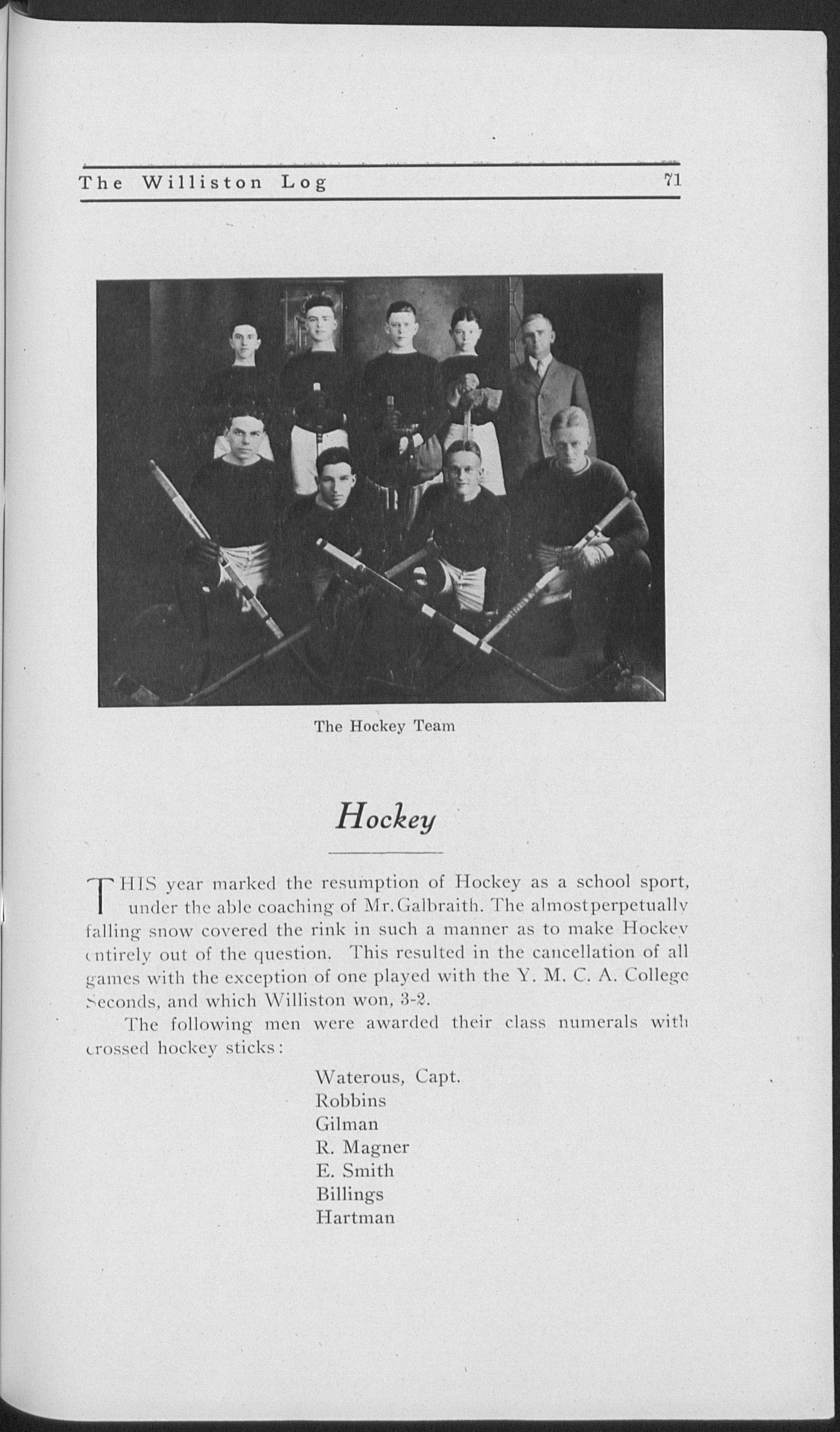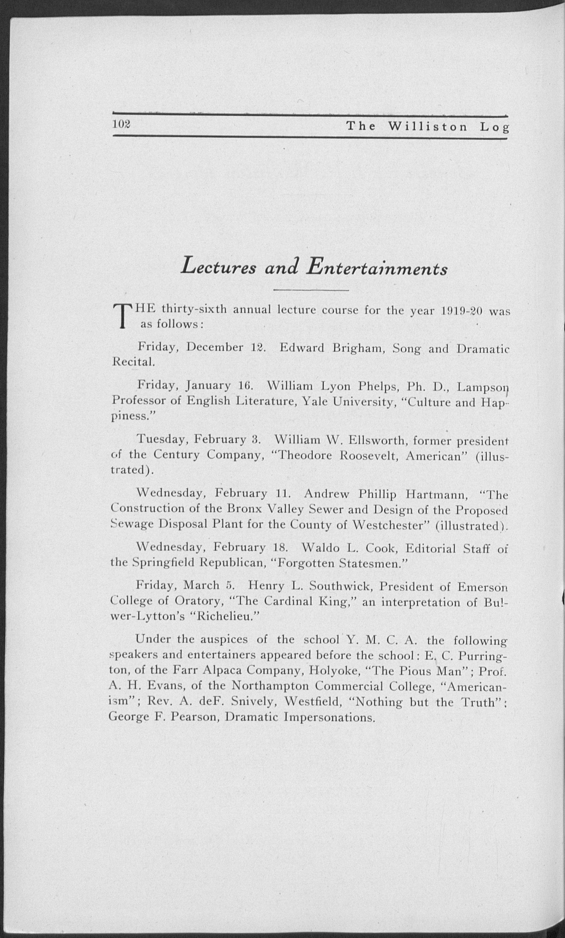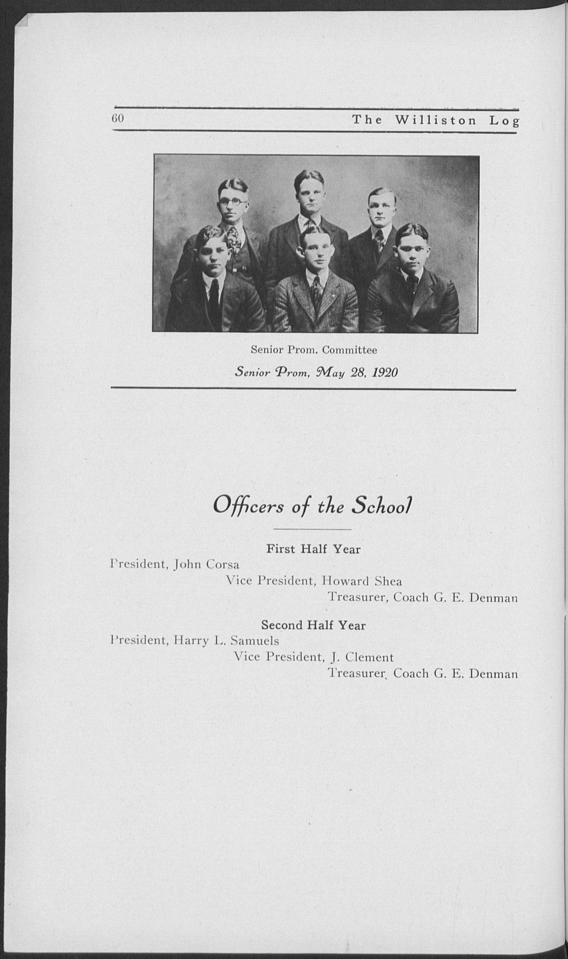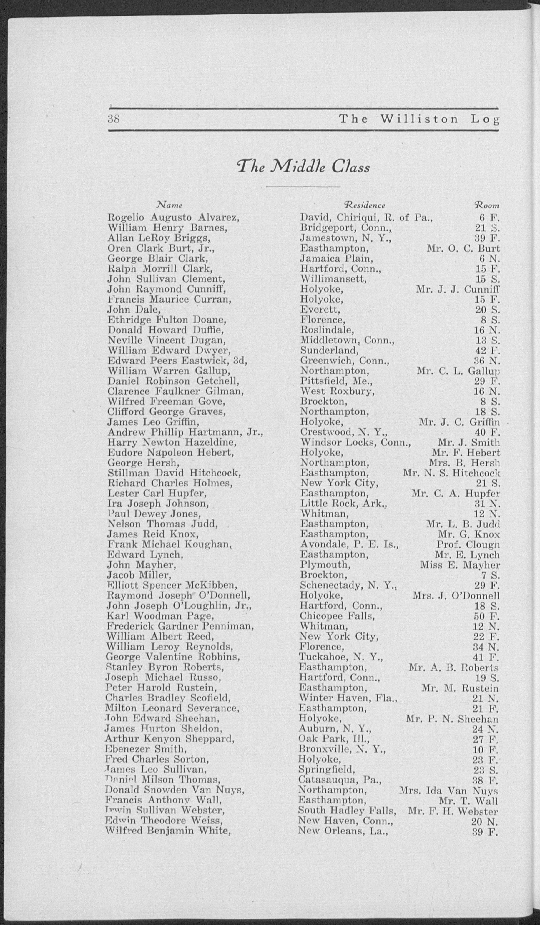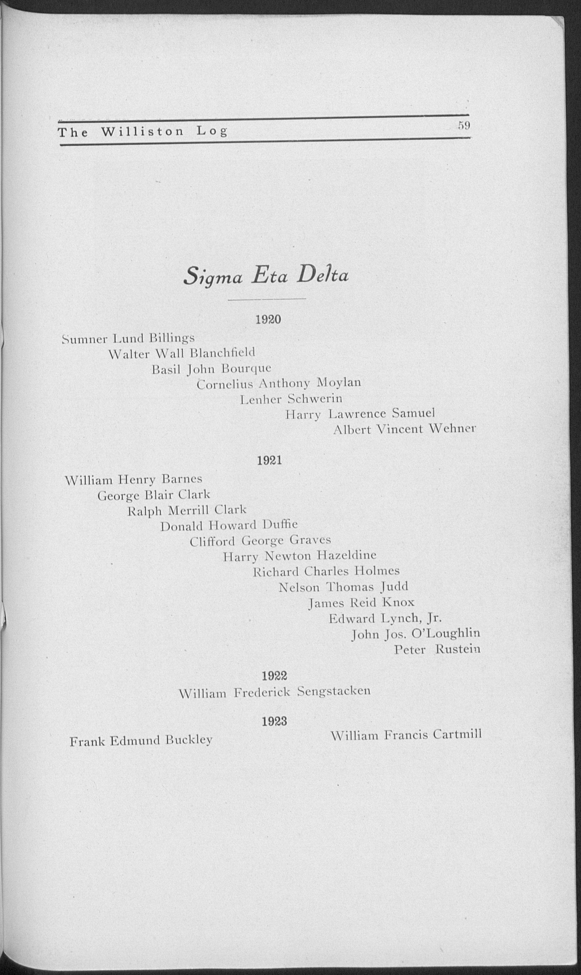 Boston University. Phillips Exeter Academy. Principal, Nantucket and Stockbridge High Schools in this state, and Green Bay High School (Wisconsin). Taught at Williston 1903-1908. Principal, Lawrence Academy, Groton, 1908-1918. Returned to Williston last year.