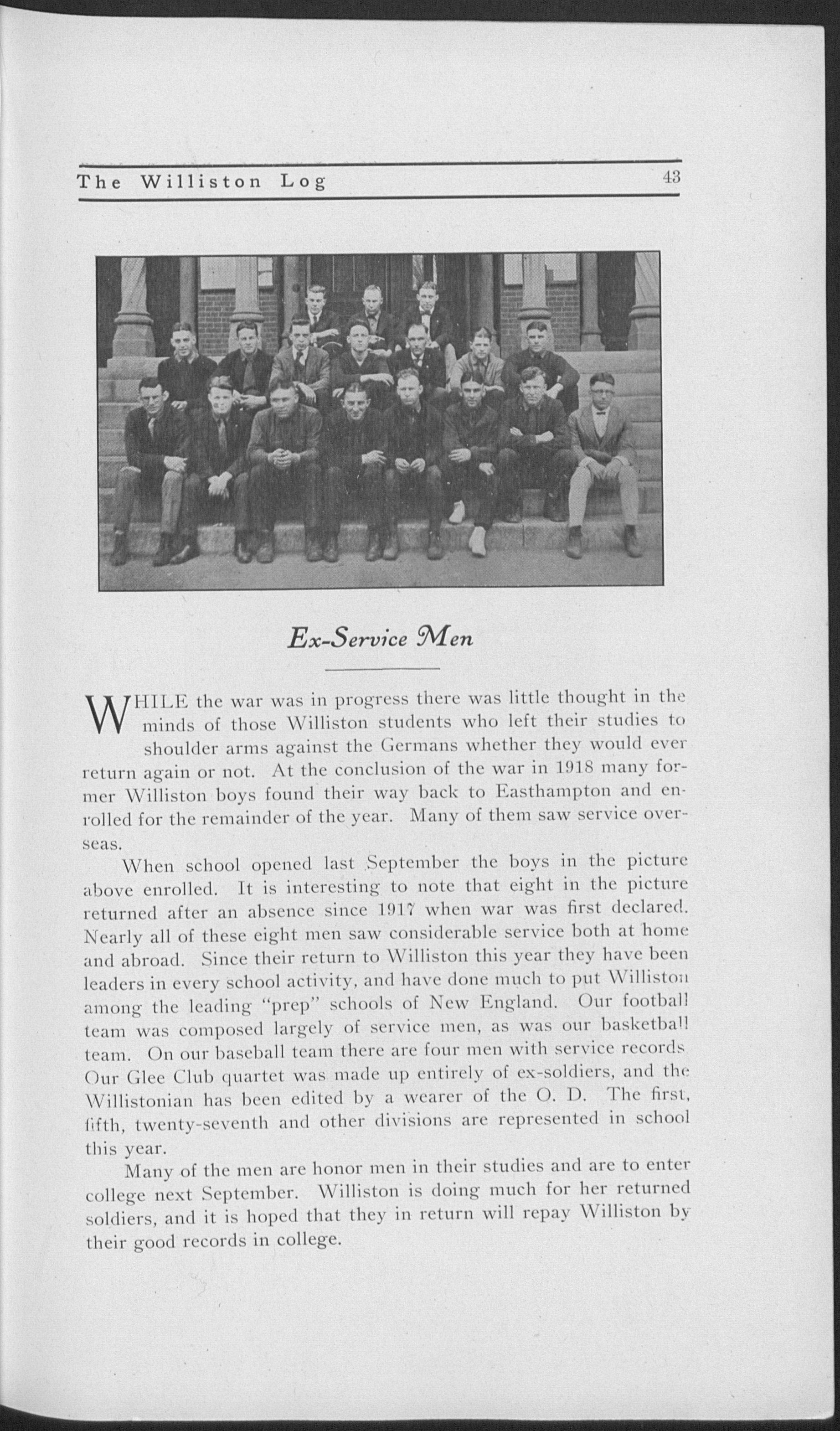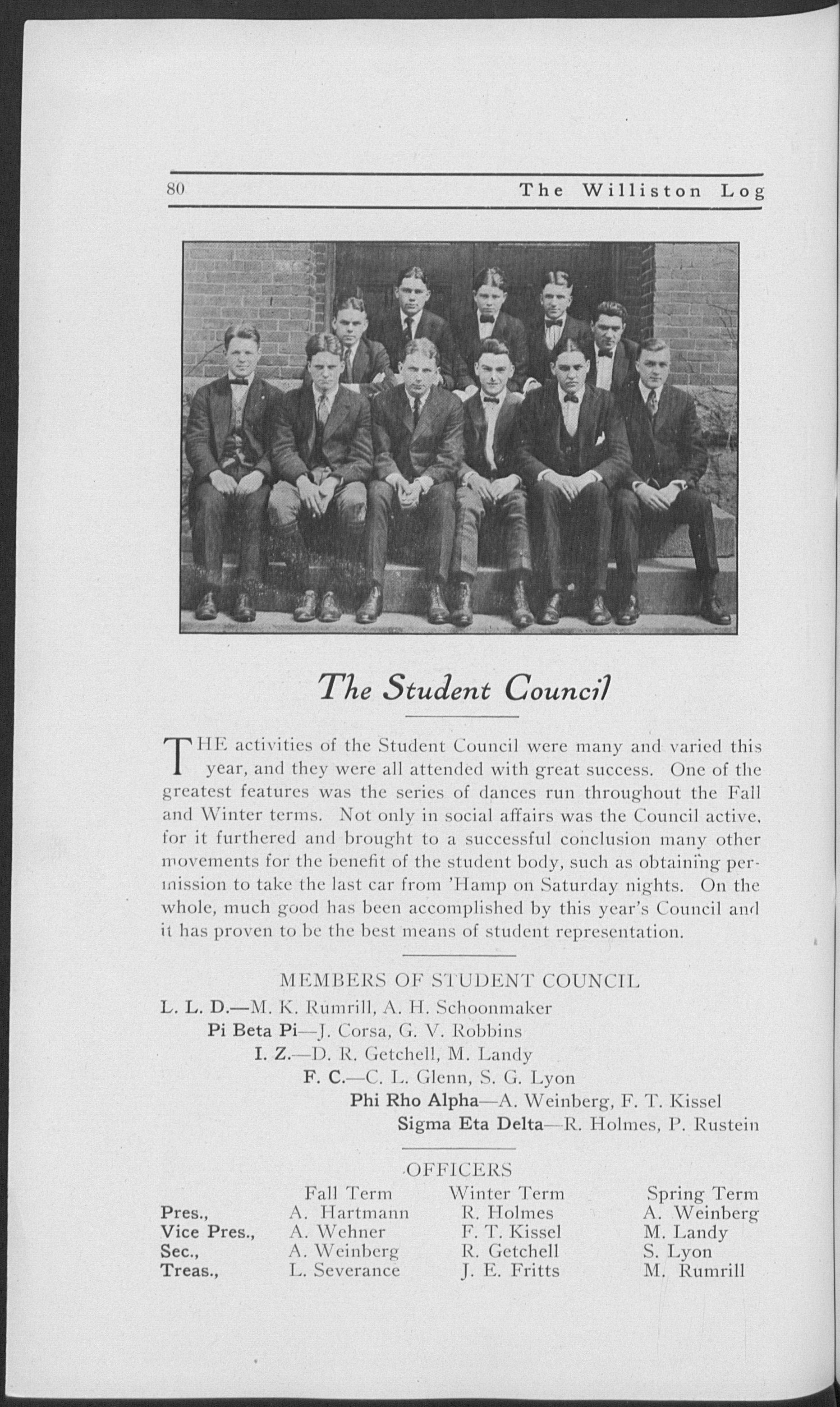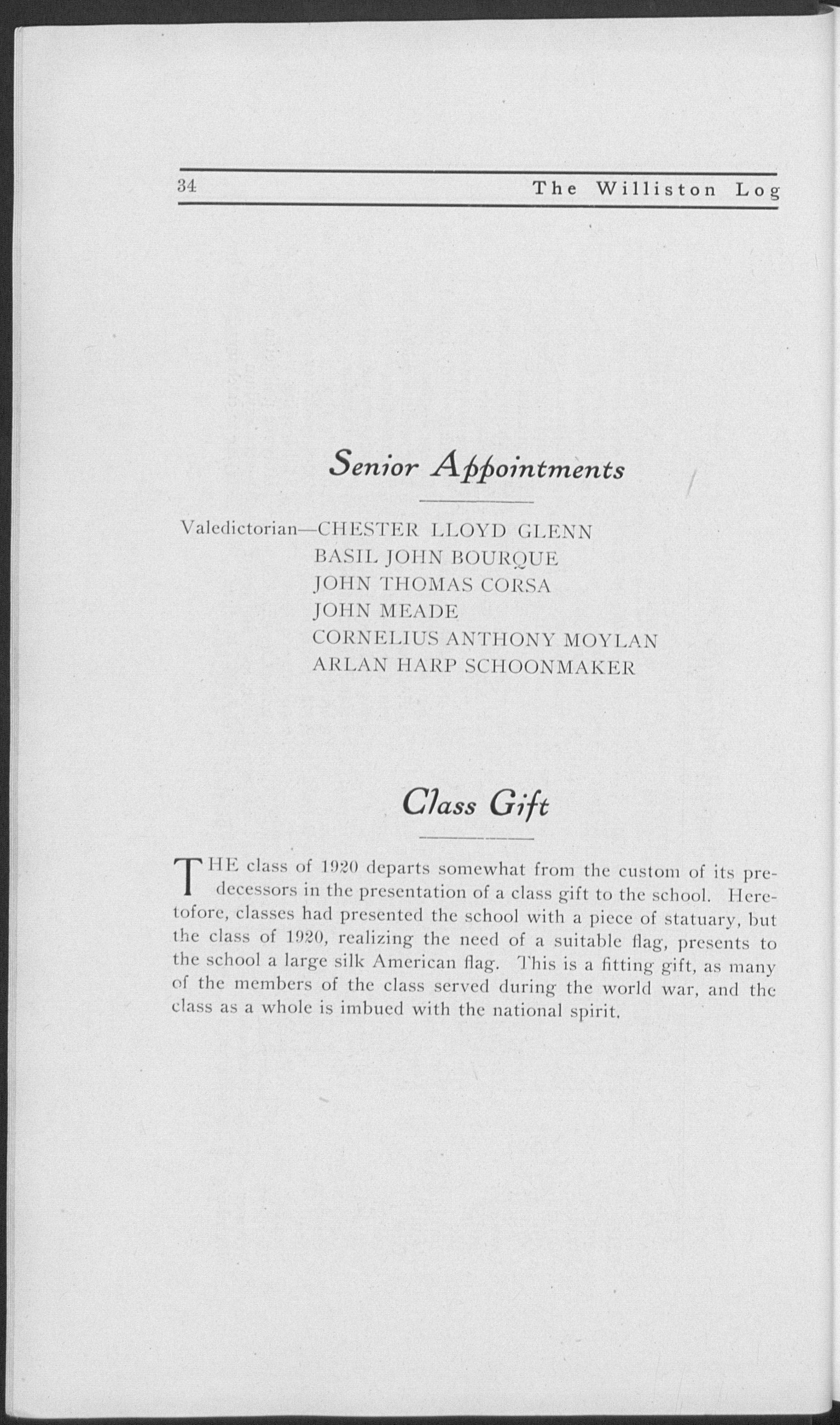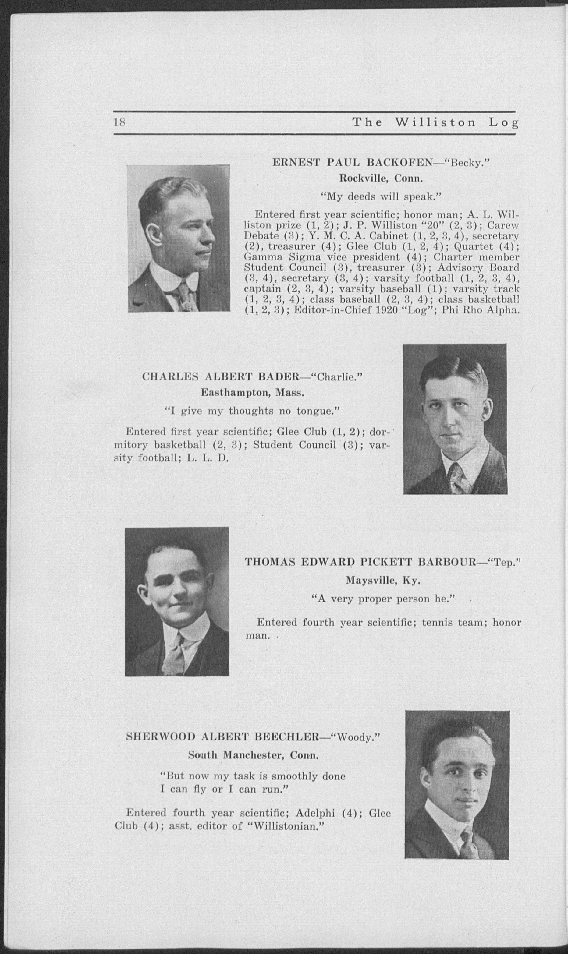 Entered first year scientific; honor man; A. L. Williston prize (1, 2'); J. P. Williston "20" (2, 3); Carew Debate (3); Y. M. C. A. Cabinet (1, 2, 3, 4), secretary (2), treasurer (4); Glee Club (1, 2, 4); Quartet (4); Gamma Sigma vice president (4); Charter member Student Council (3), treasurer (3); Advisory Board (3, 4), secretary (3, 4); varsity football (1, 2, 3, 4), captain (2, 3,4); varsity baseball (1); varsity track (1, 2, 3, 4); class baseball (2, 3, 4); class basketball (1, 2, 3); Editor-in-Chief 1920 "Log"; Phi Rho Alpha.