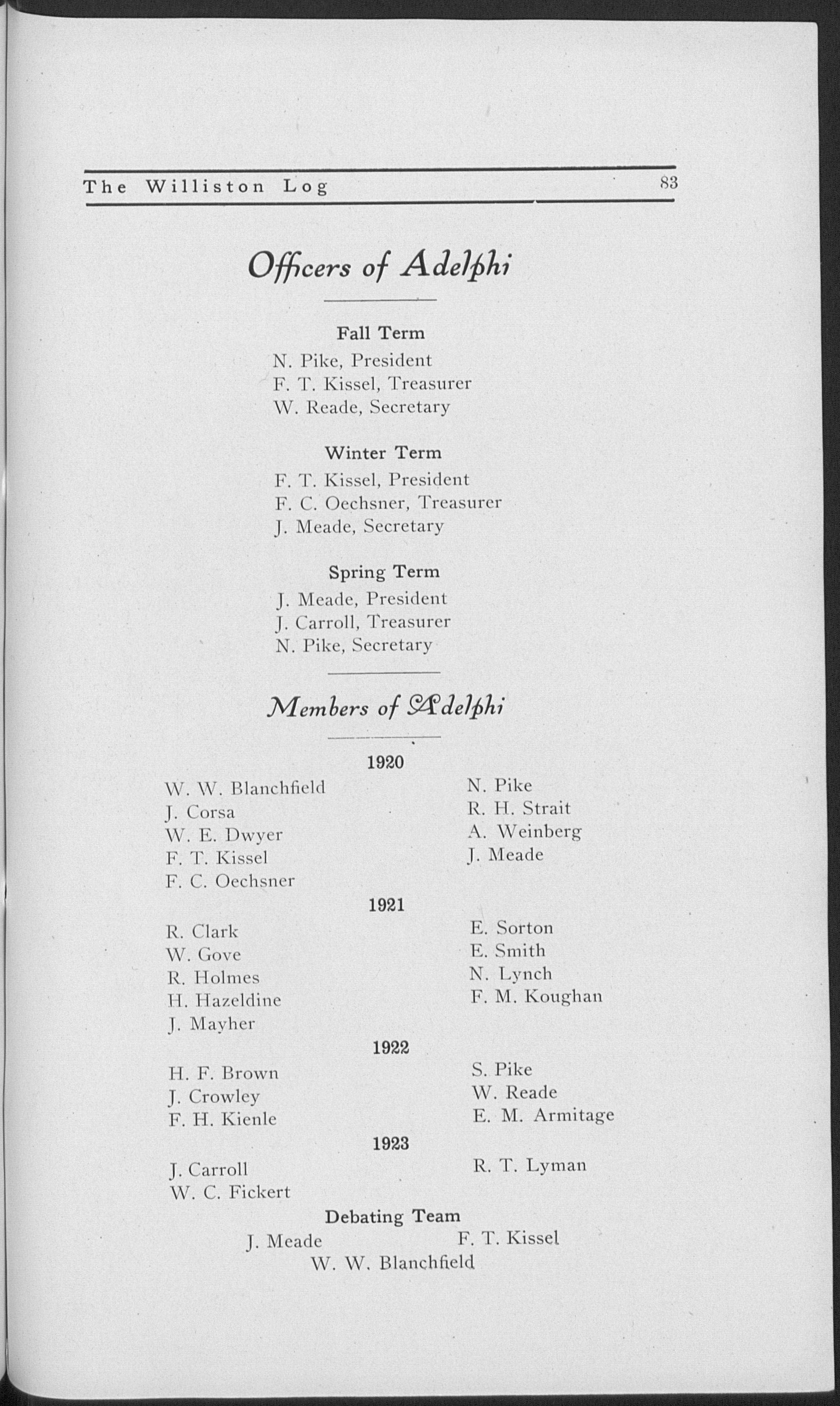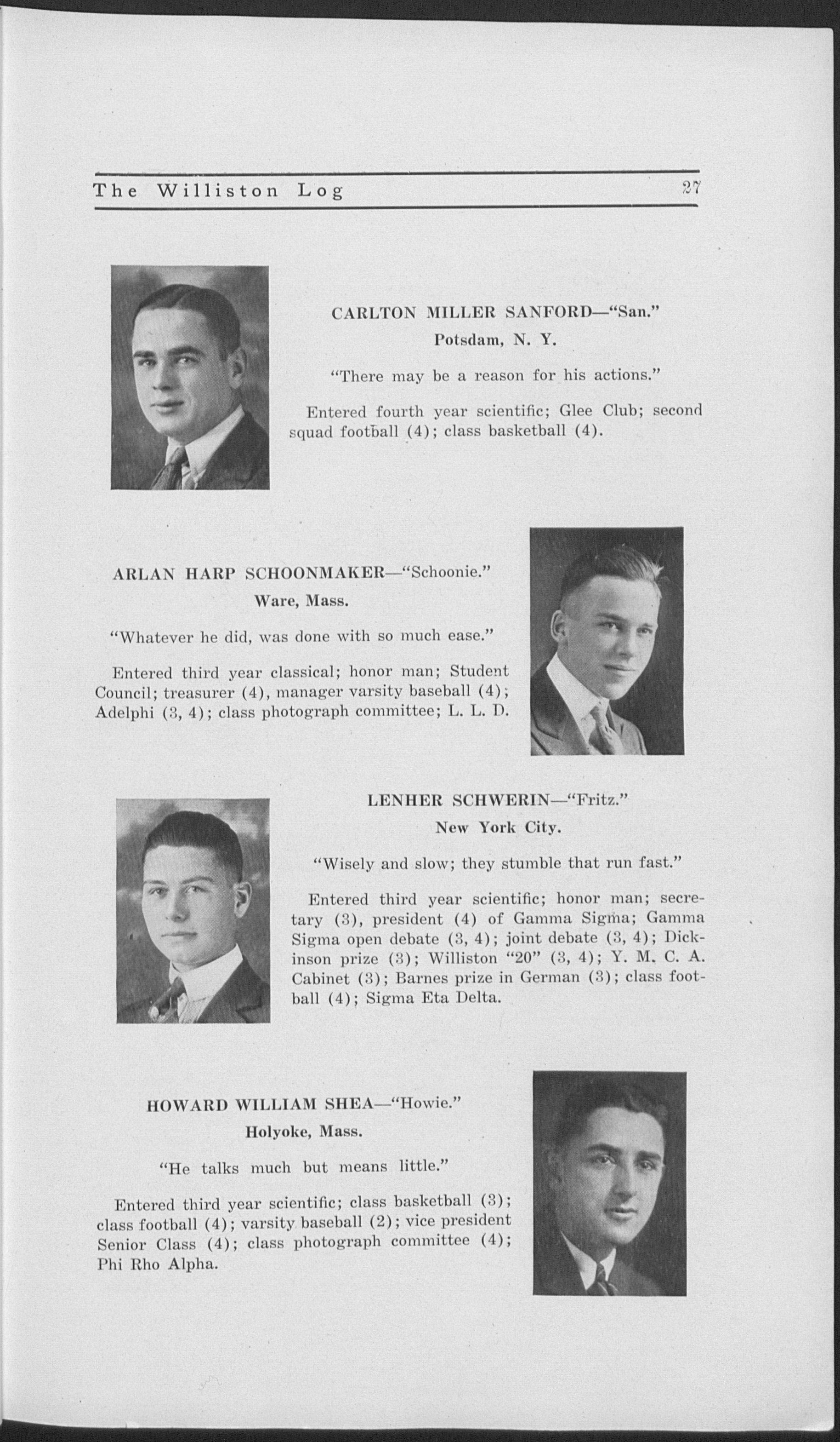 Entered first year classical; Williston "20" (1, 2, 3, 4); J. P. Williston "8" (2, 3, 4); J. P. Williston first and second prize (3, 4); Carew debate (2), prize (2); secretary, treasurer, vice president of Adelphi (4); term editor, asst. editor, editor-in-chief "Willistonian (3); Glee Club (2, 3, 4); class football (2, 3); captain class basketball (4); class baseball (2, 3); varsity track (4); class hat committee (4); Adelphi debating team (2, 3, 4), individual prize (4); "Log" board (4); honor man; Dickinson prize speaking (2, 3, 4); vice president athletic association (3); Student Council (3); Sigma Eta Delta.