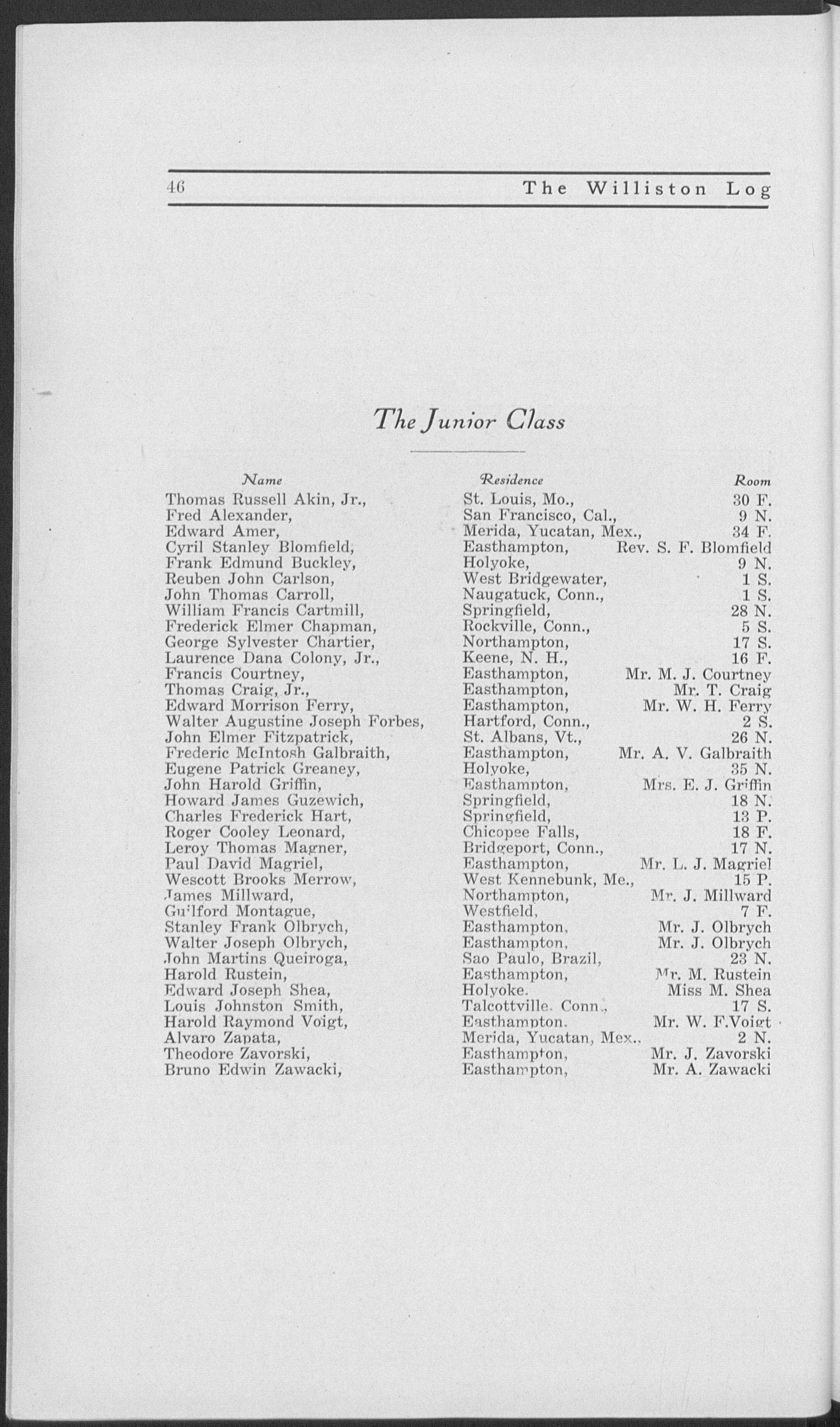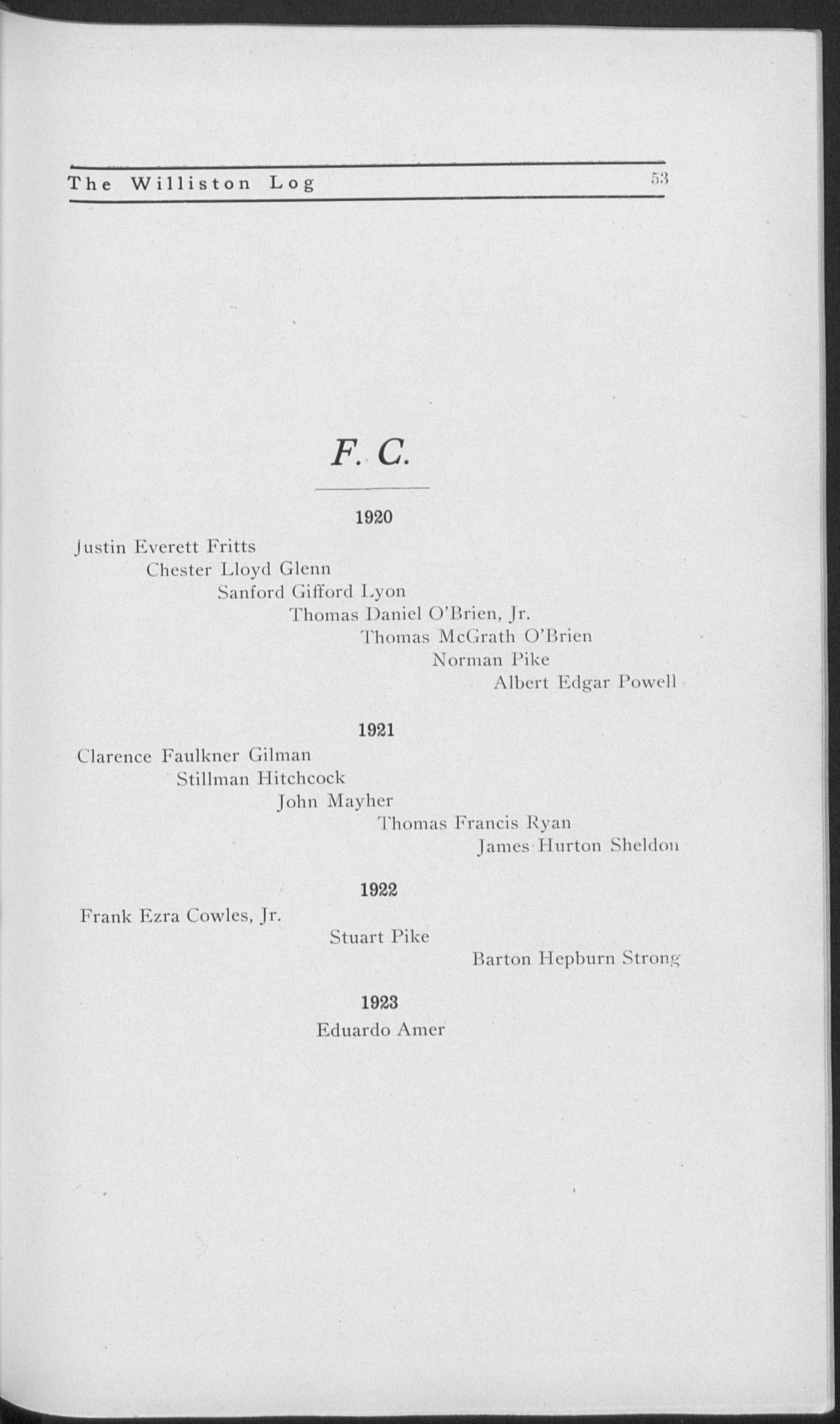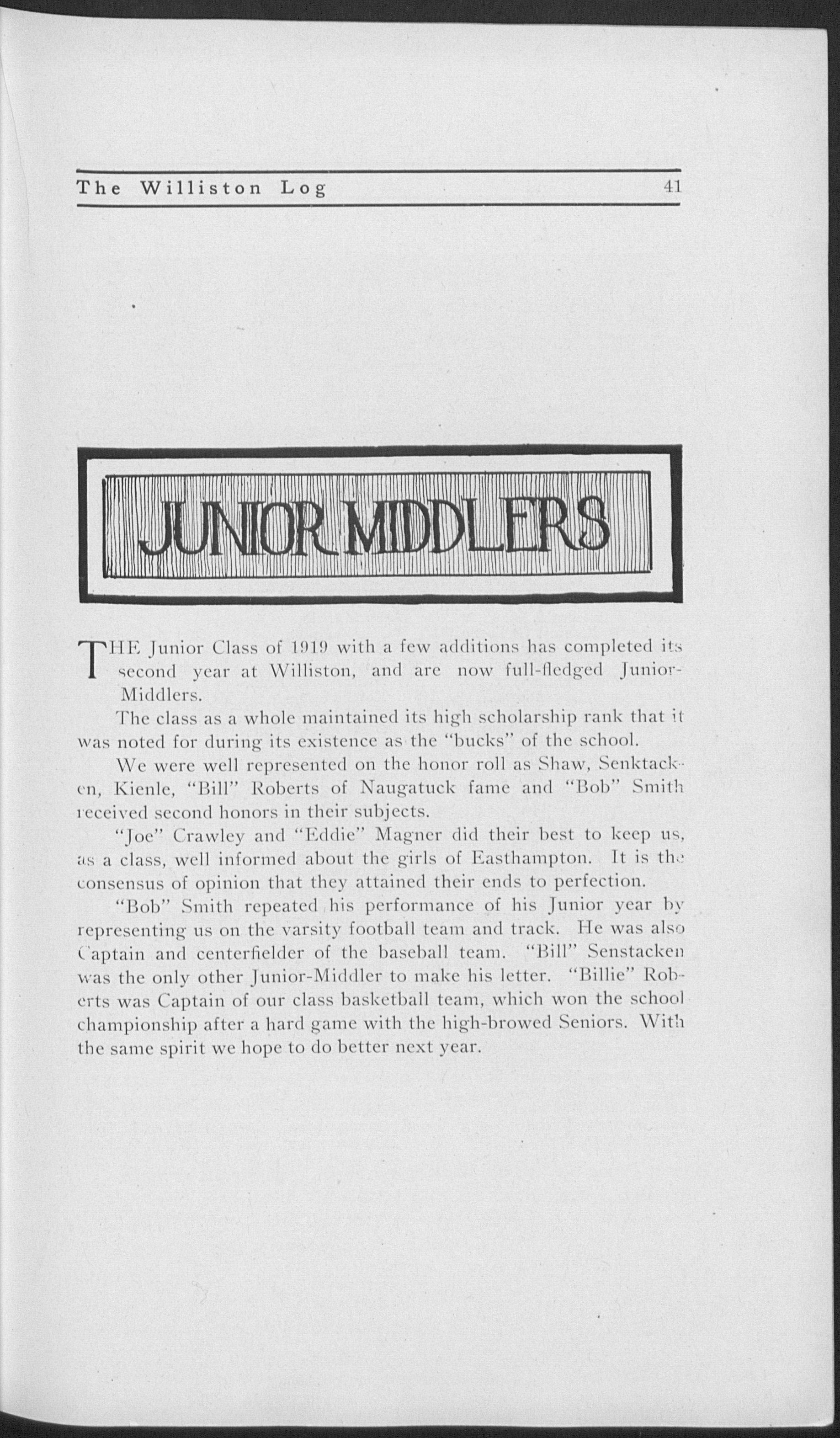 Entered third year classical; secretary Adelphi (3); class football (3); class basketball (3,4); dormitory basketball (3); football squad (3); track squad (3, 4); vice president Y. M. C. A. (4); president of the school (4); manager basketball (4); Prom. committee (4); "Log" board (4); "Willistonian" board (4); Student Council (4); J. P. Williston prize (3); Dickinson prize (3); Glee Club (4); Pi Beta Pi.