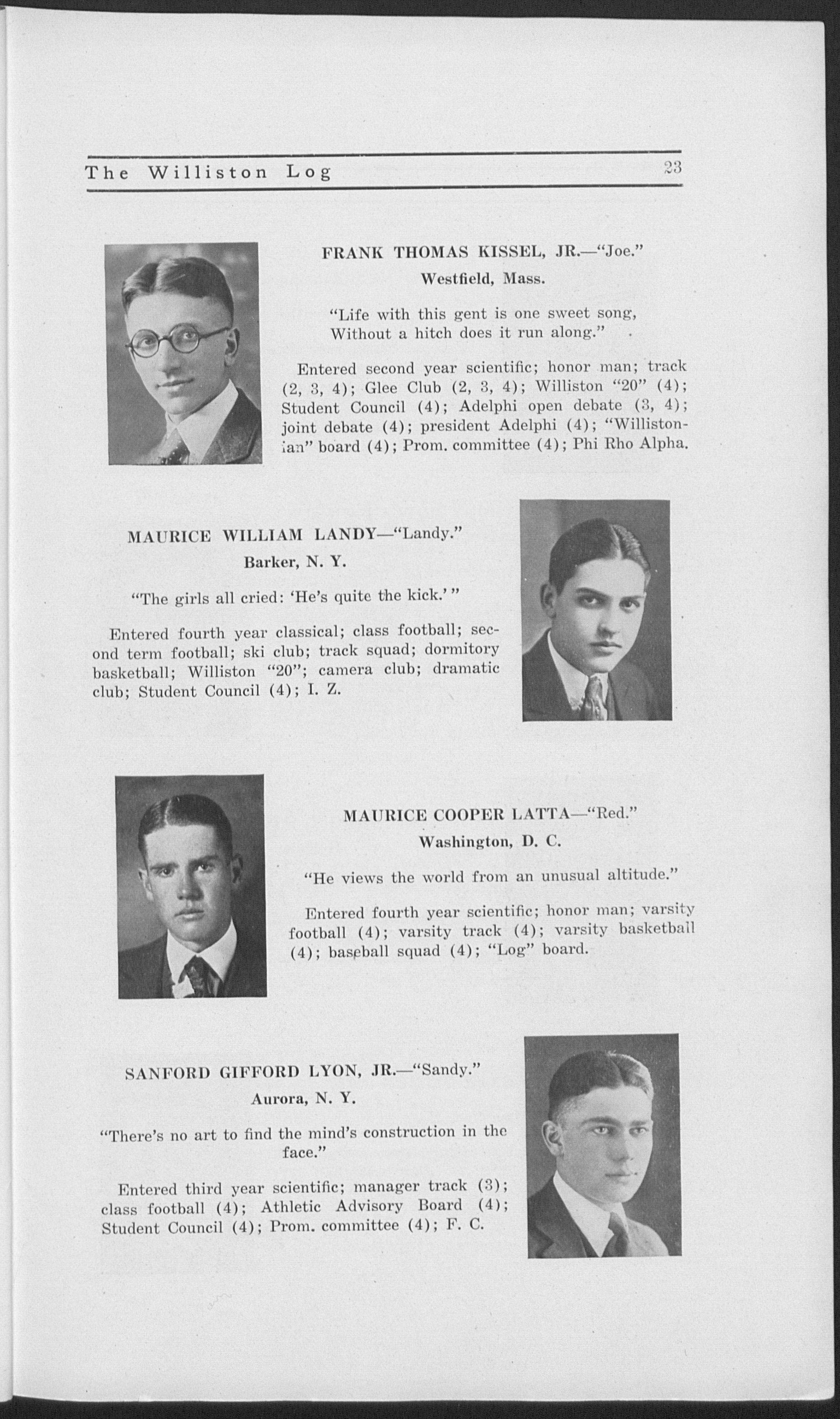 Entered second year scientific; asst. business manafrer (2), business manager (2), term editor (3) of "Willistonian"; secretary (2), treasurer (3), vice president (3), president (4) of Gamma Sigma; Gamma Sigma open debate (2, 3, 4); joint debate (2, 3); Williston "20"(2, 3, 4); chairman gift committee (4); president Student Council (3); varsity football (3, 4); Glee Club (2, 3, 4); quartet (4); Sigma Eta Delta.