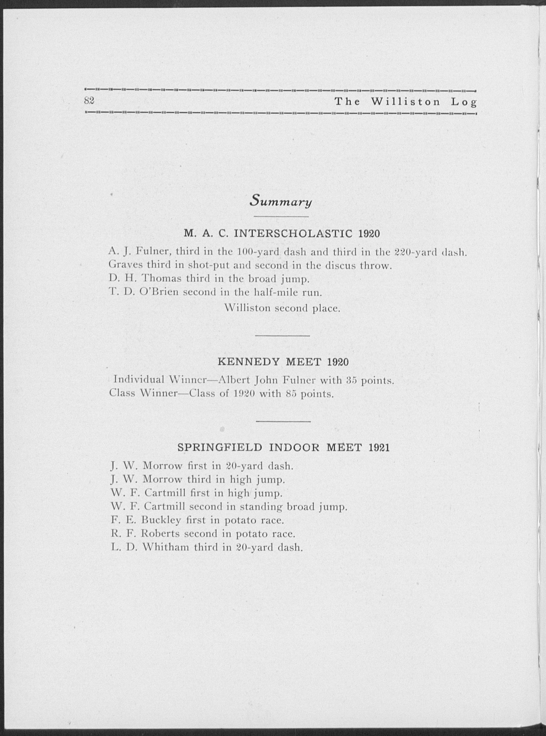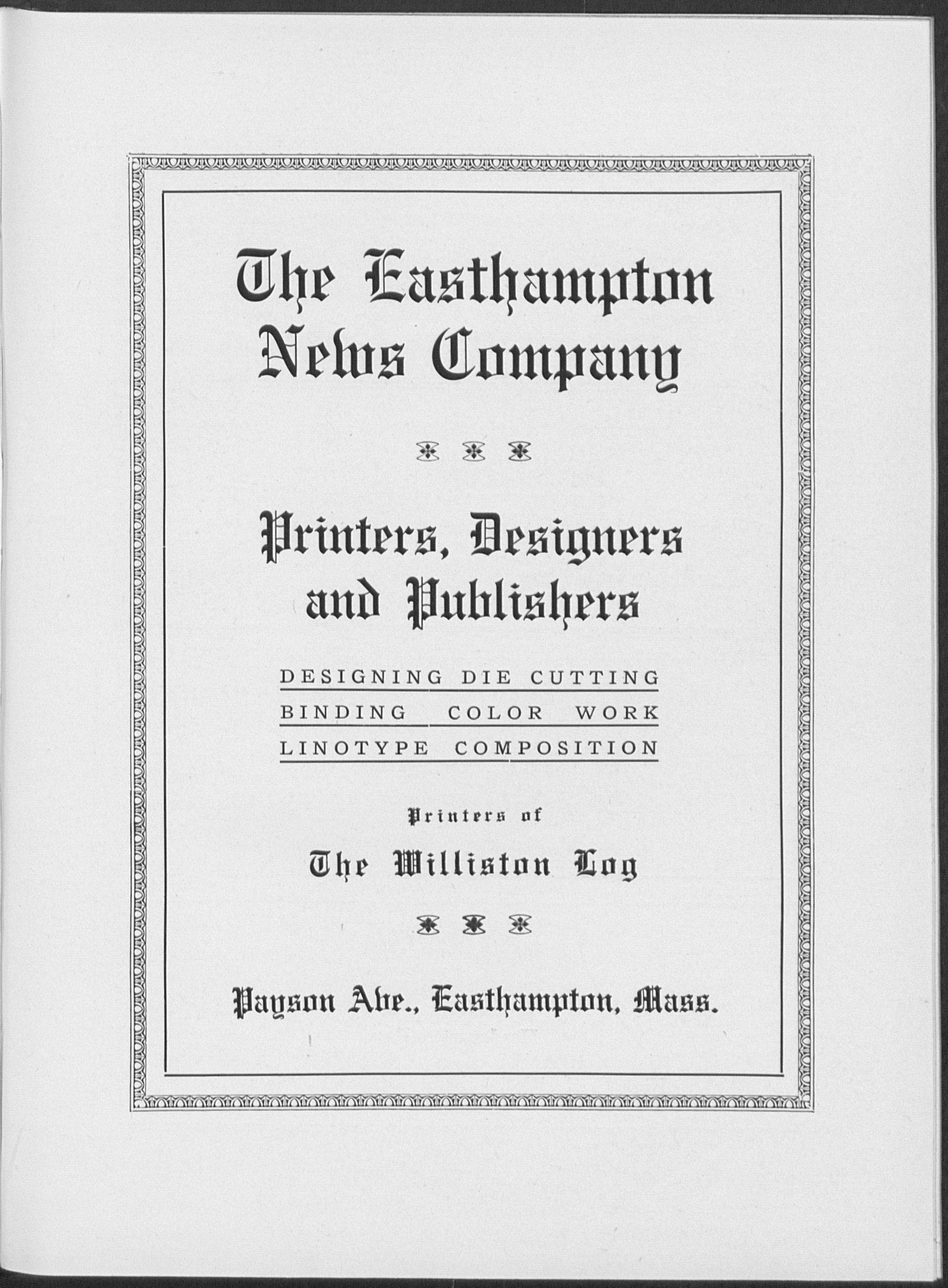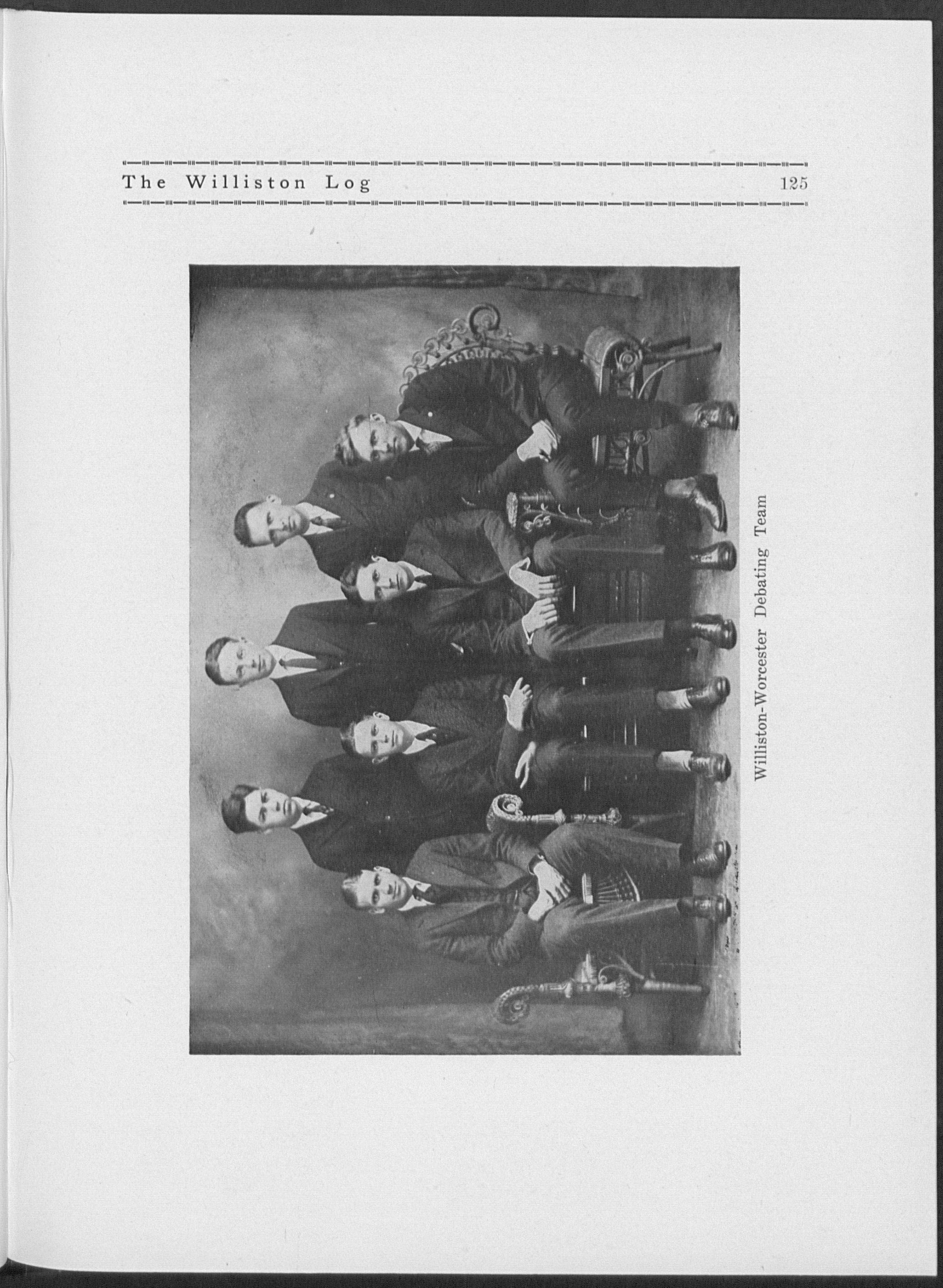 However, if we had no source of help but our own persons, such a record would have been well nigh impossible. It is through the faculty that we have been able to attain our objects at Williston. For their kind and persevering attention we cannot thank them too much. We have tried to show our appreciation of their efforts by hard work, but we realize that it is too early to fully understand the worth of their direction and encouragement. If we attain success in life, it is due, in a large measure, to the intellectual and physical training we have received at Williston.