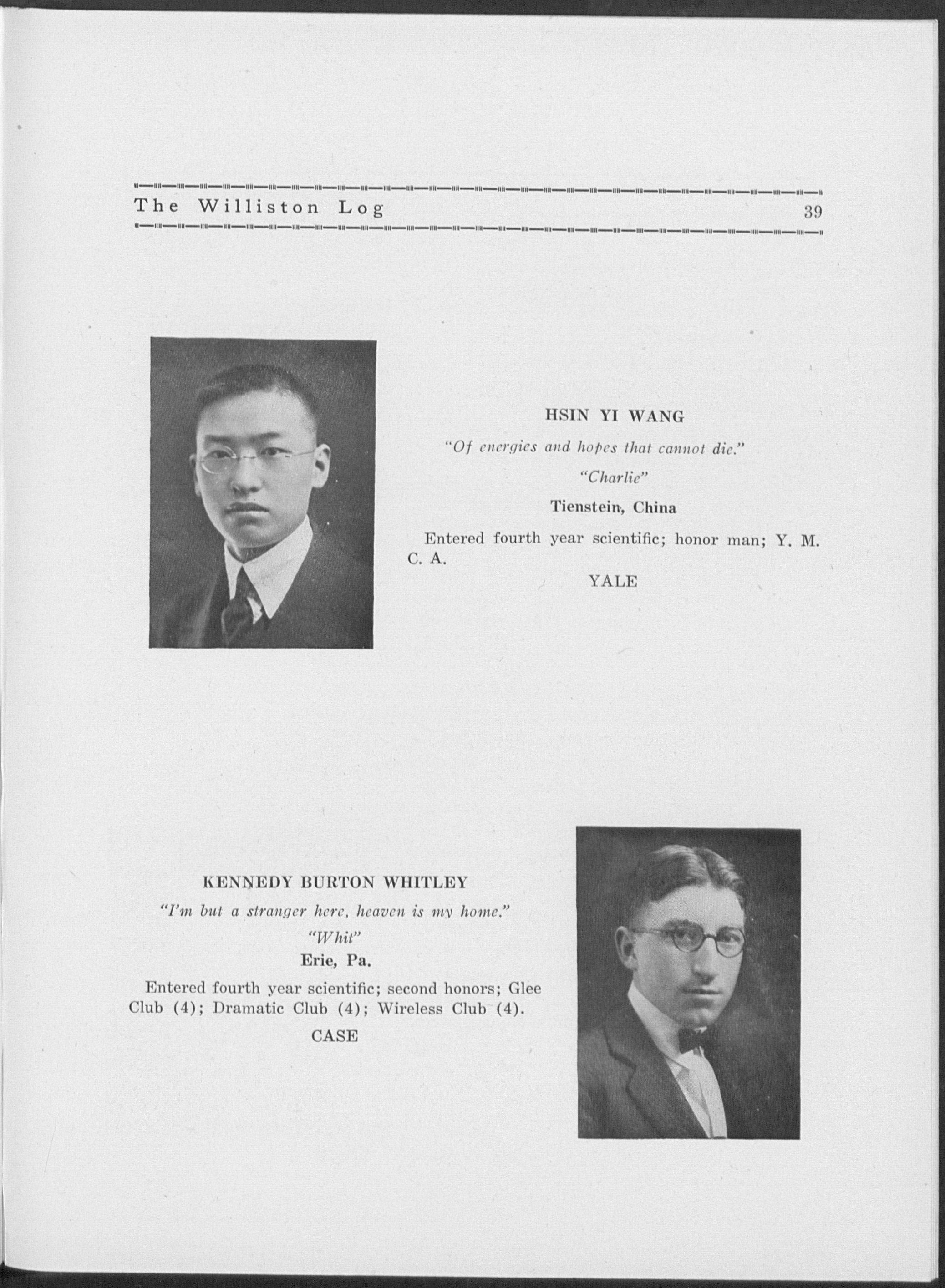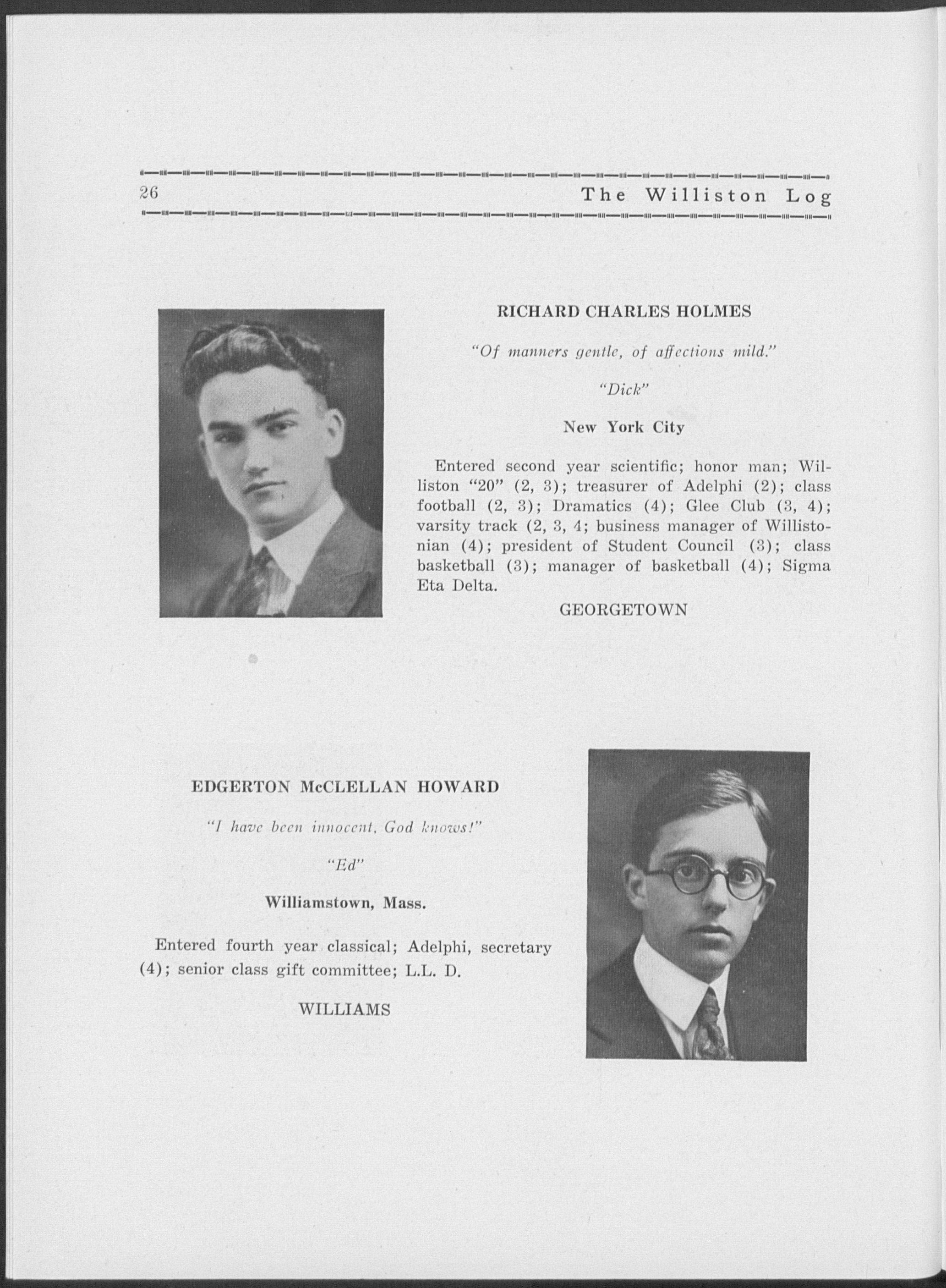 Entered 2nd year classical; honor man; Gamma Sigma, treasurer (2), secretary (3), president (4); first Worcester-Williston debae (4); •rchestra director (2, 3); dramatics (3, 4); "Y" Cabinet (2); Student Council, treasurer (2); editor-in-chief Willistonian (4); J. P. Williston "8" (4.); ritudent representative N. Y. Alumni banquet (4 ' 1. Glee Club (41. Log Board (4); Varsity Track (4); class football (4); Sigma Eta Delta.
