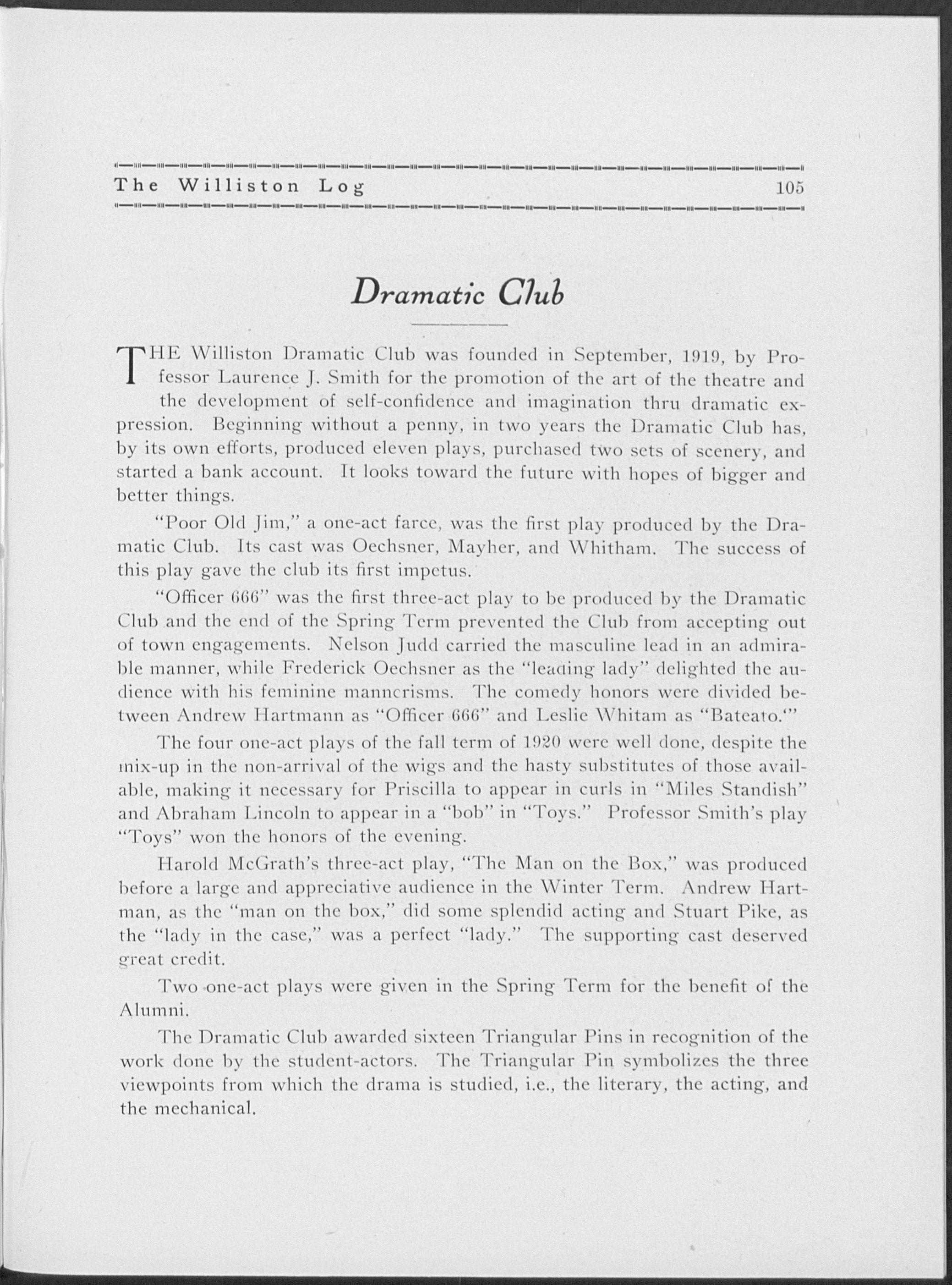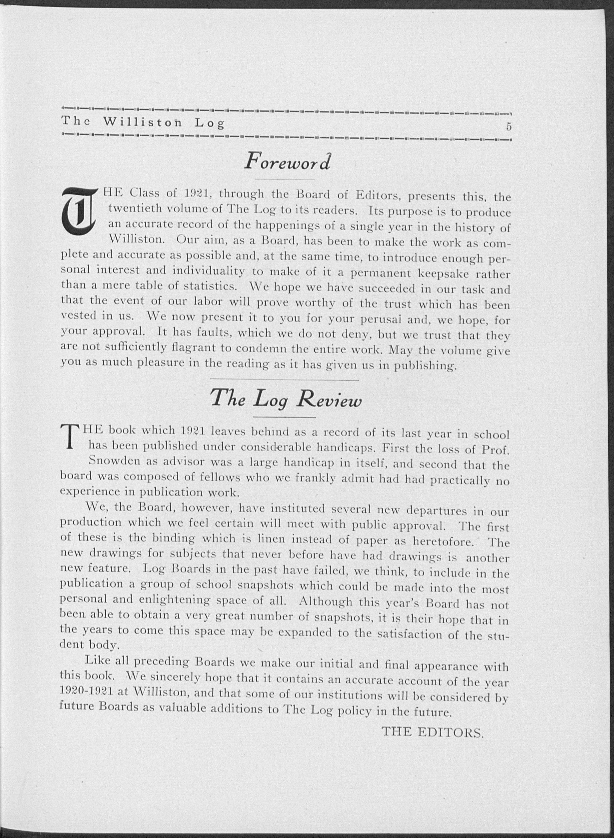 Like all preceding Boards we make our initial and final appearance with this book. We sincerely hope that it contains an accurate account of the year 1920-1921 at Williston, and that some of our institutions will be considered by future Boards as valuable additions to The Log policy in the future.