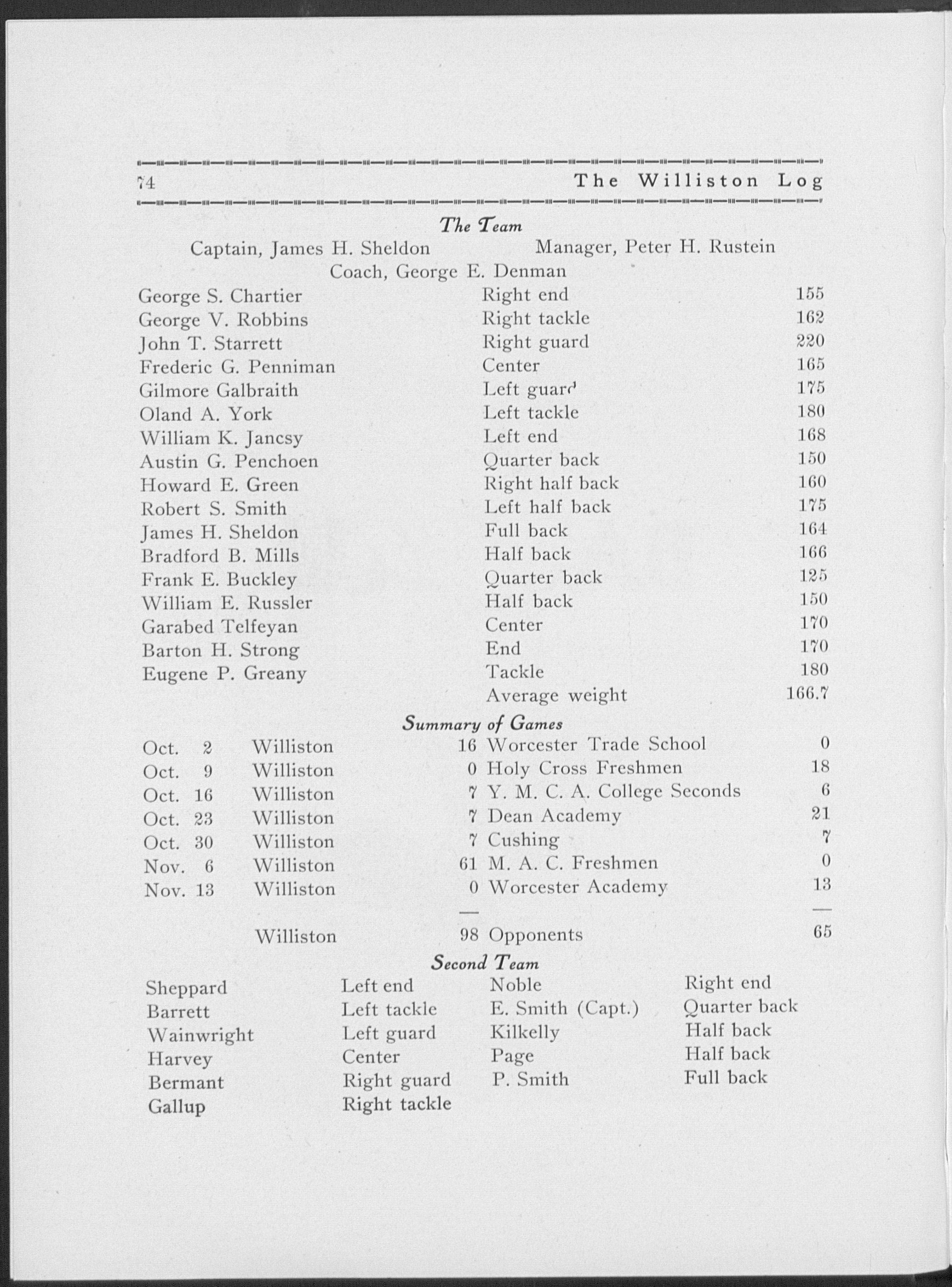FOUR years ago a small and insignificant class entered Williston. To its few members this present year looked far away indeed. Now our goal is in sight, and it is with a feeling of regret that we are leaving the school to which we have become so attached. What we have accomplished in our short stay at Williston can be fully attested to by our records on the athletic field and in the class room. In football we were represented by Sheldon, Penchoen, Penniman, Green, G. Galbraith, and Robbins. At basketball Sheldon, O'Loughlin, and Penchoen excelled, while on the diamond we have O'Loughlin, Bennet, Sheldon, George Clark, and Heydt. In every sport we have had strong representations.