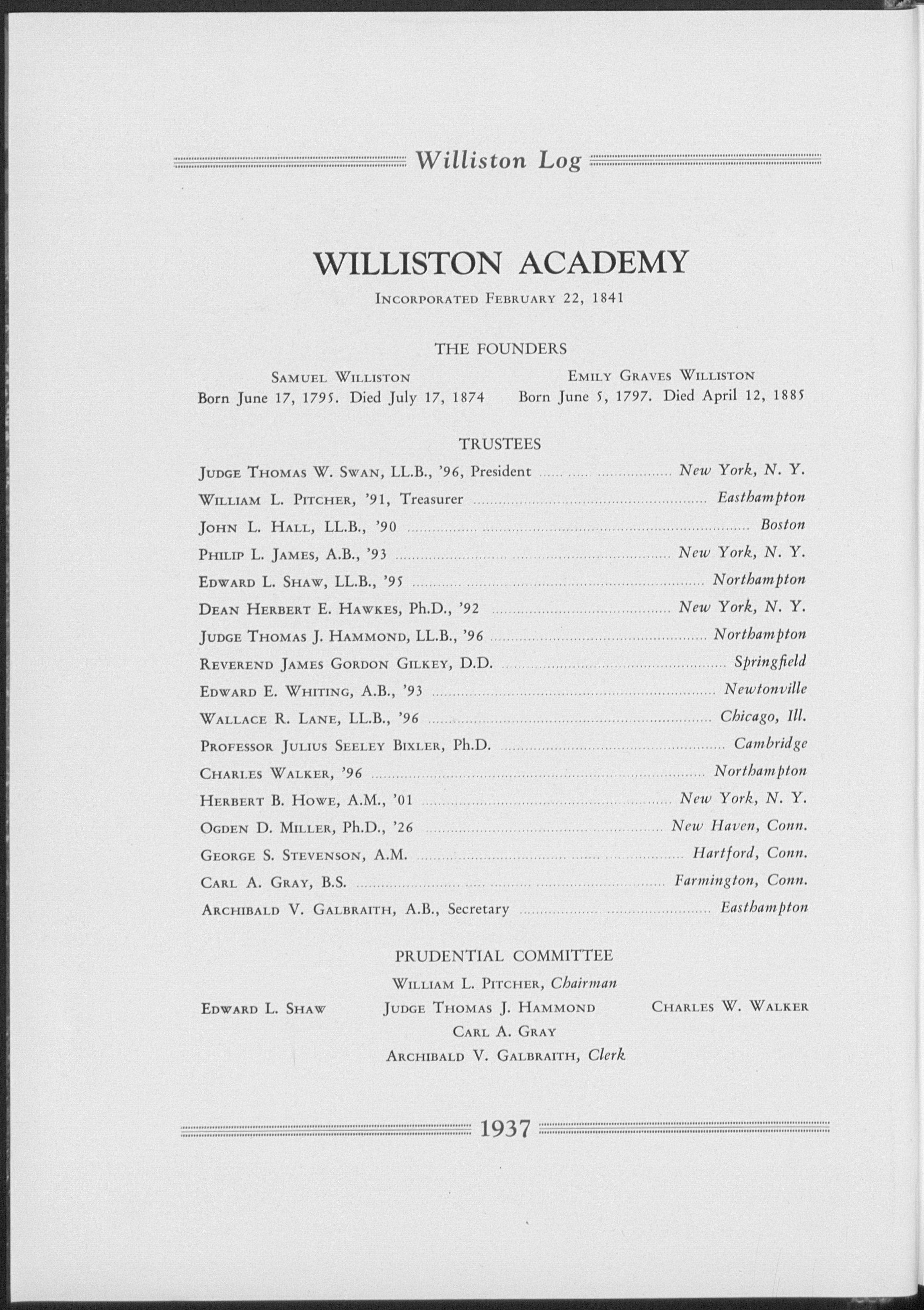 The staff of THE LOG has put in many hours of work in an attempt to publish a book of which Williston will be justly proud. Having capitalized on both the good and the bad points of previous year books and having included some new and interesting features, THE LOG committee is presenting to you a book with which they are glad to be associated, in belief that the material contained is a complete picture of the life at Williston in 1936-37.