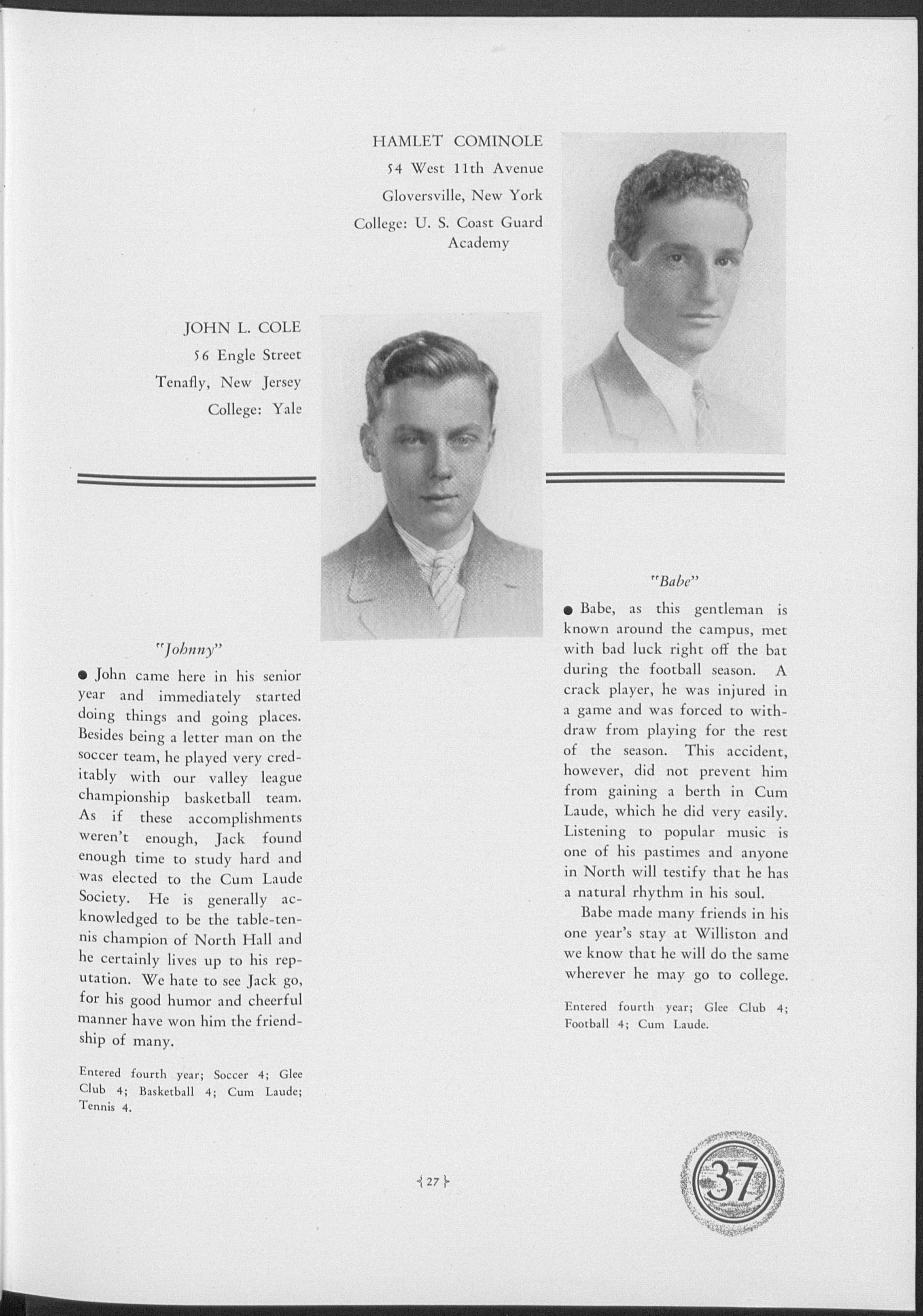 Graduated Wesleyan 1935; Graduate Course Columbia 1935-36; Sigma Nu Fraternity; Elected to Williston 1936.