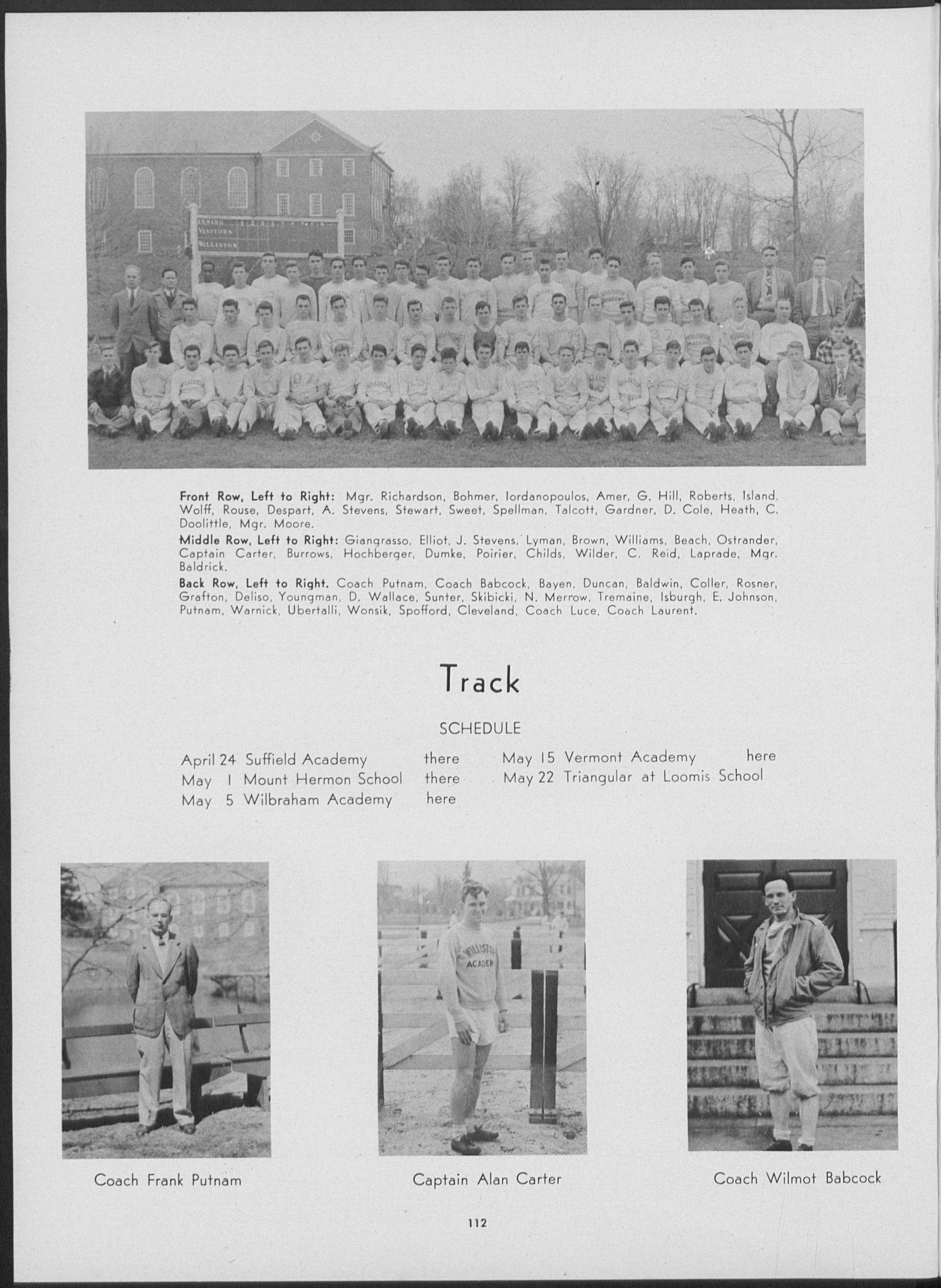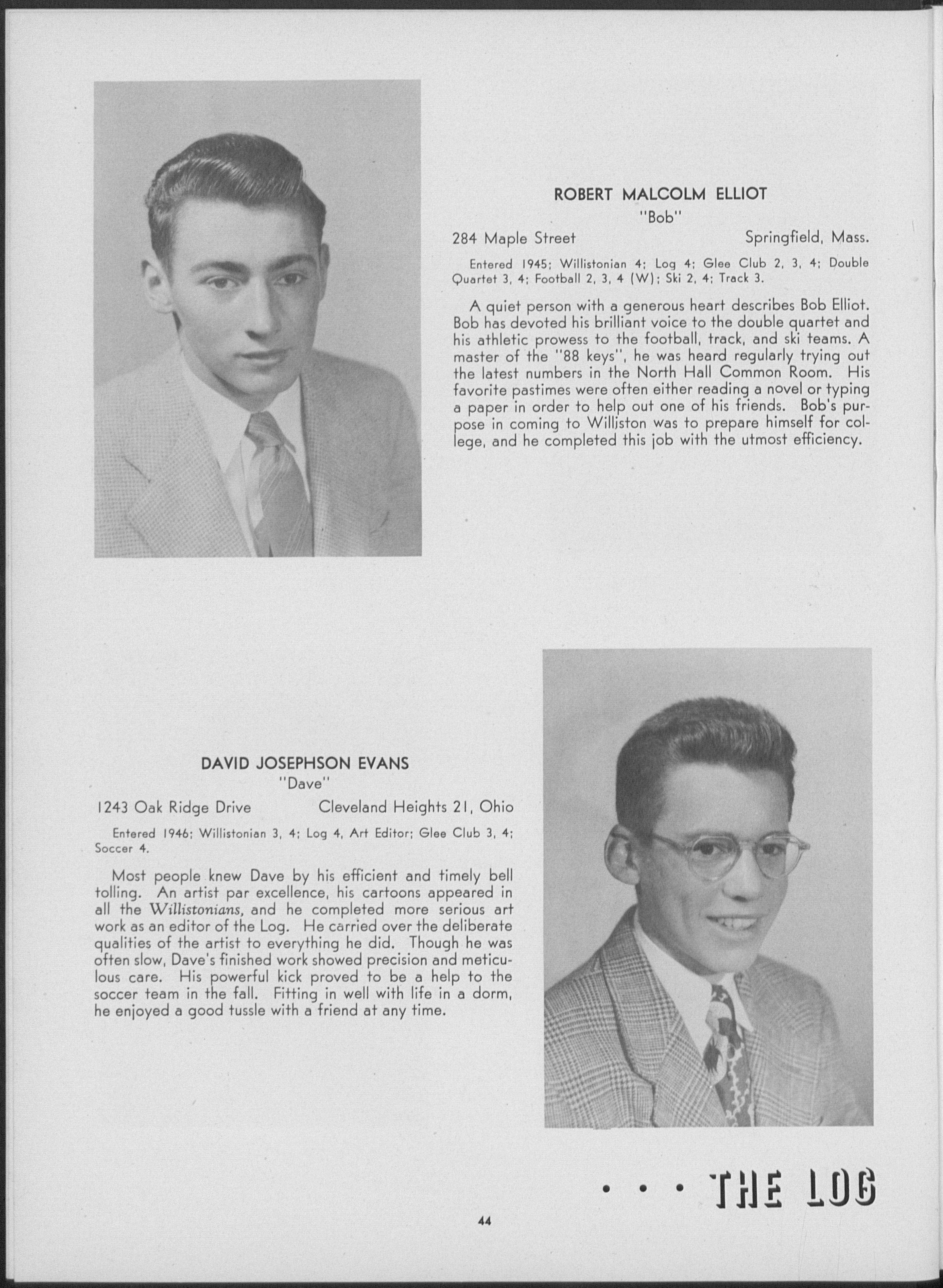 His accomplishments include his success as head of the English department, former adviser to both the Log and the Willistonian, director of the Glee Club and of the Gilbert and Sullivan Operettas. One of the founders of Mount Tom Summer School, he has been director of Williston Academy Summer School since its opening in 1943.