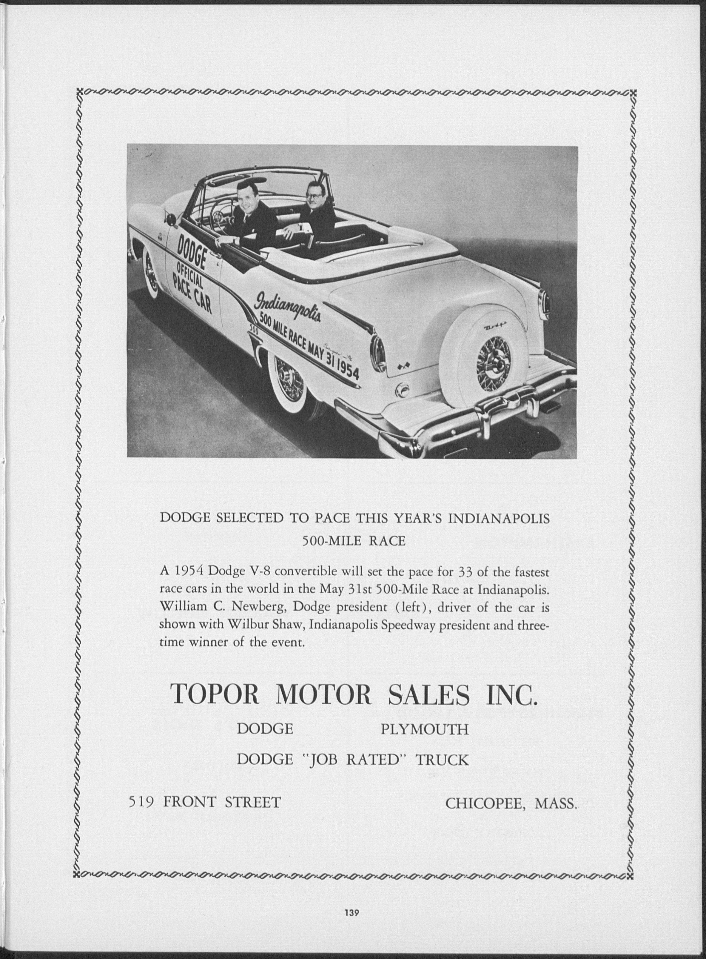 A 1954 Dodge V-8 convertible will set the pace for 33 of the fastest race cars in the world in the May 31st 500-Mile Race at Indianapolis.