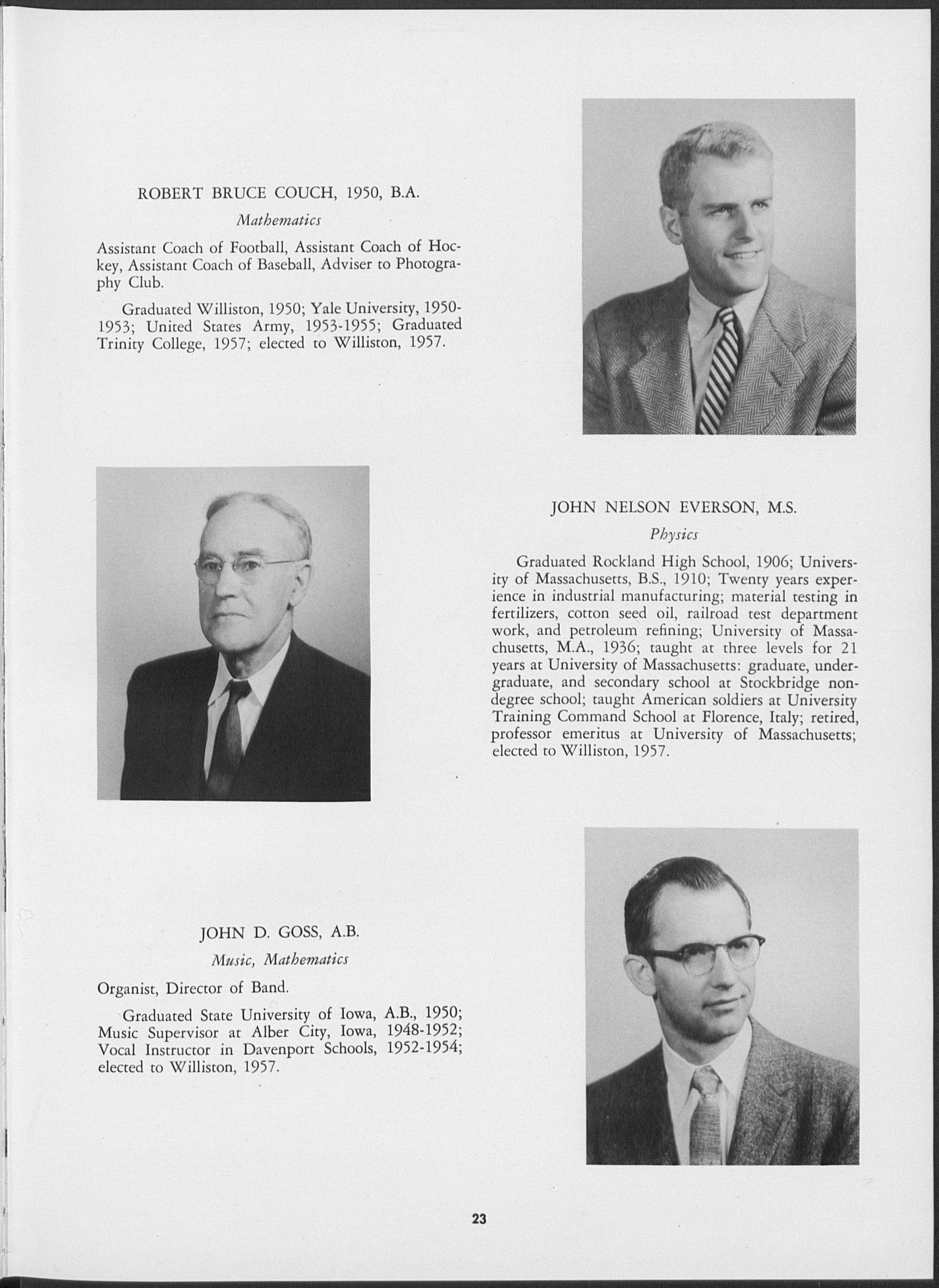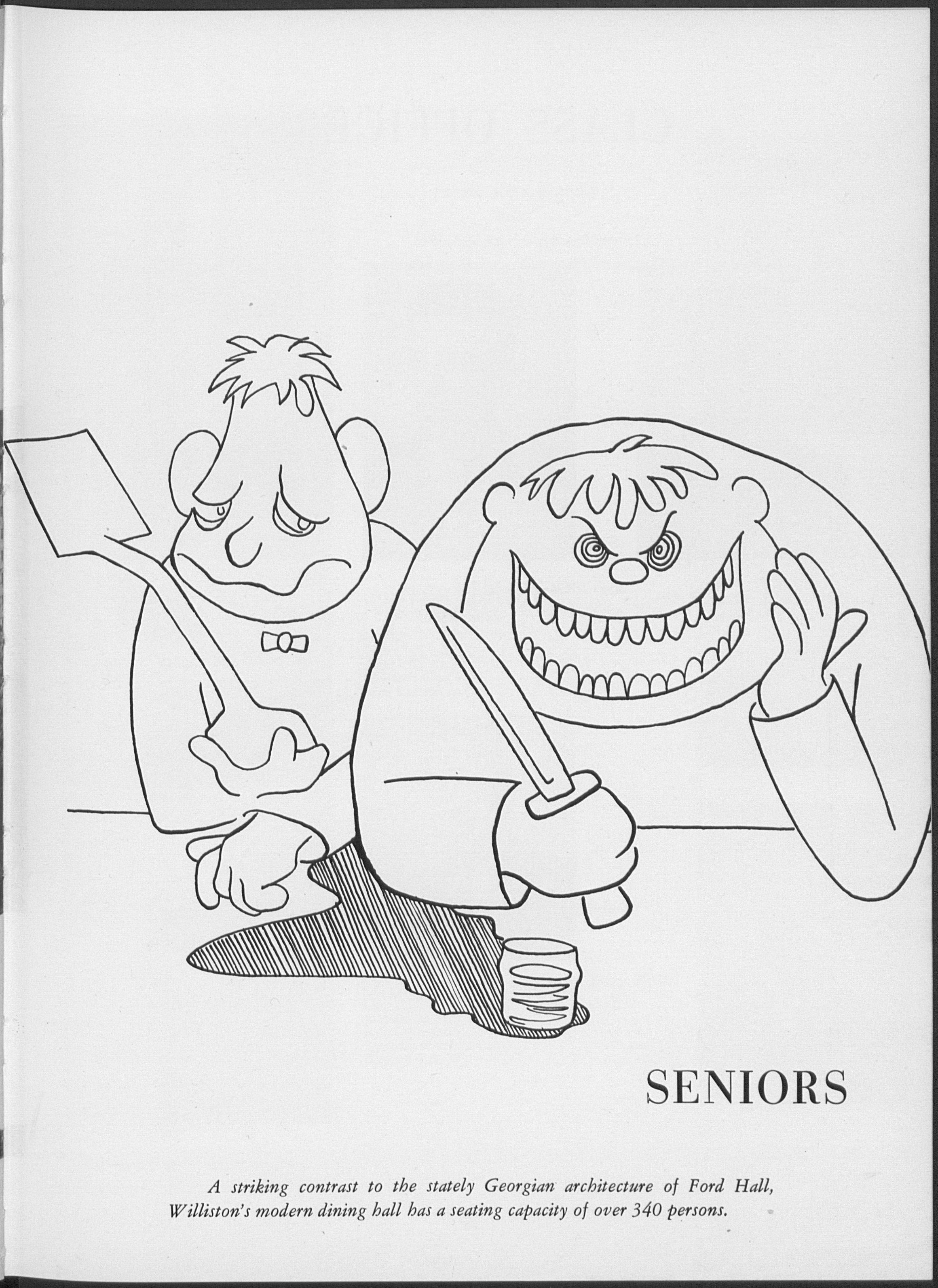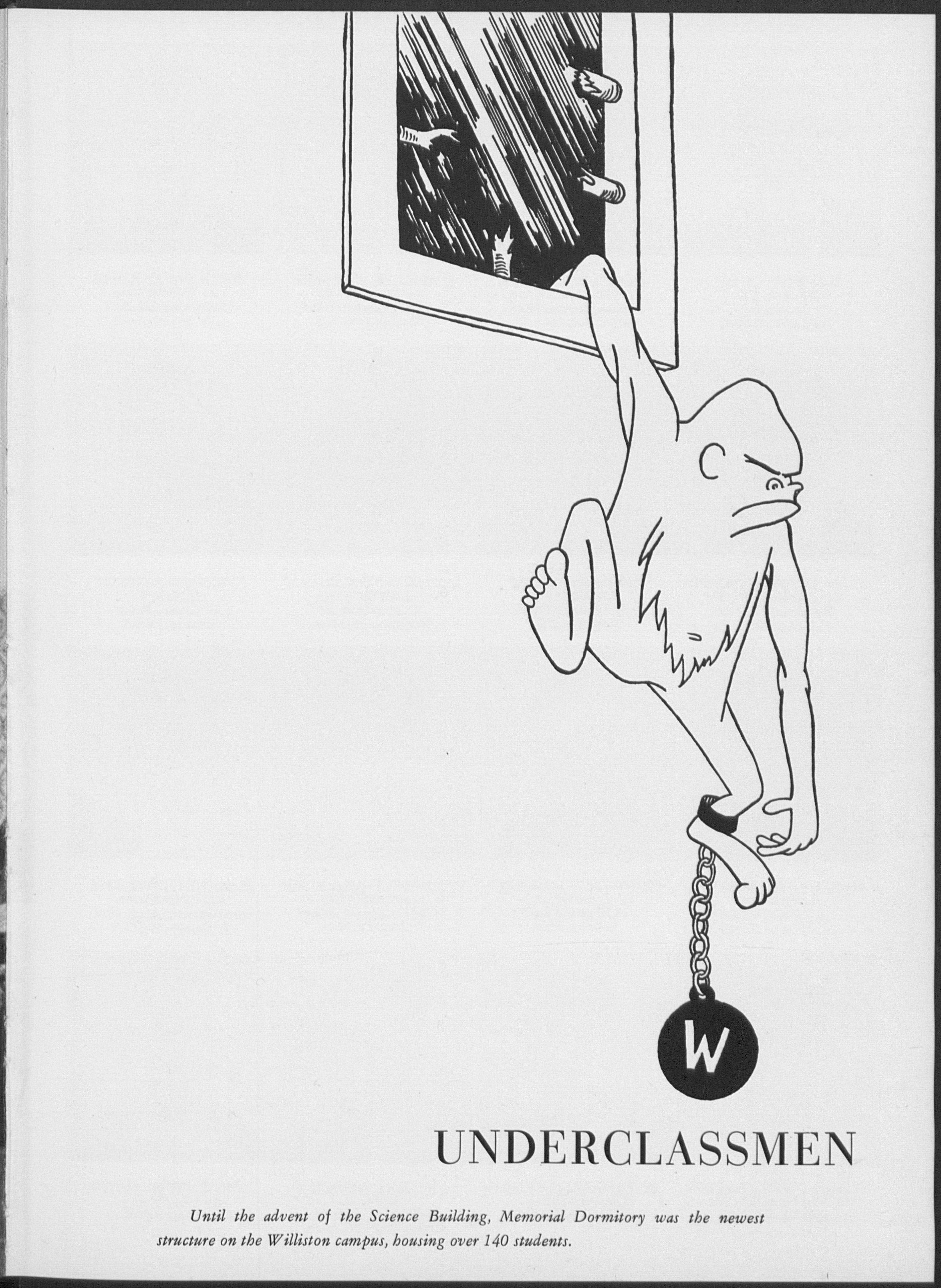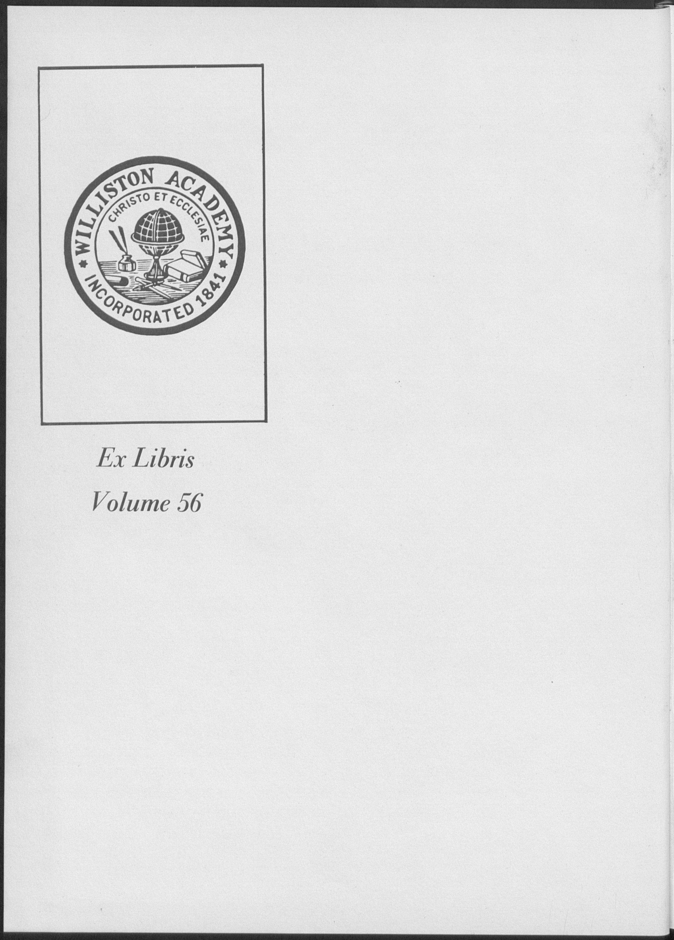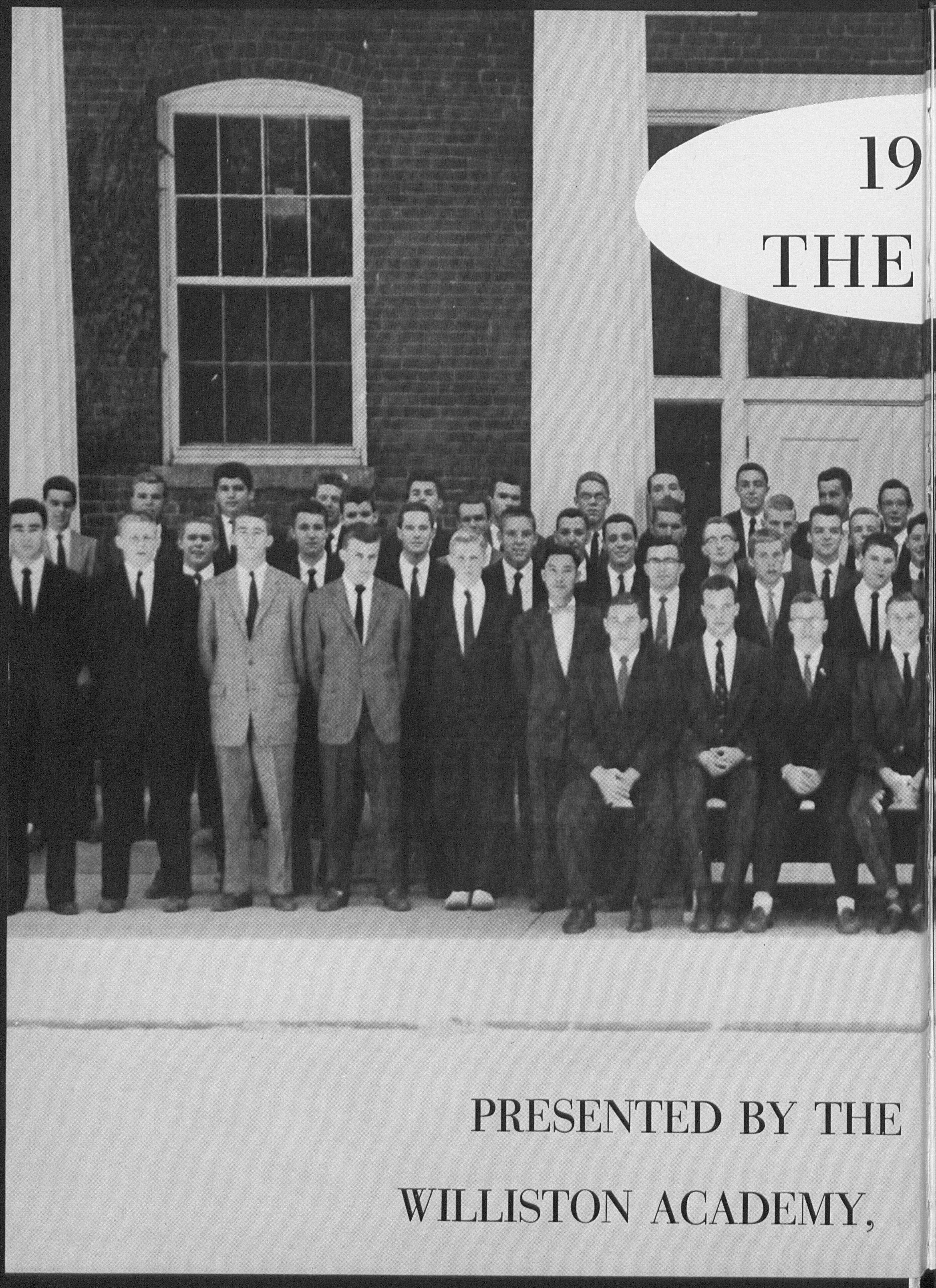 A graduate of Dartmouth College in nineteen-hundred and twenty-five, he entered Williston in nineteen-hundred and fifty-two. A devoted instructor of English and a Senior Master, his unceasing generosity to seniors and underclassmen alike has placed him in highest esteem. It is primarily, however, because of his tireless concern for the individual that this volume is inscribed to him.