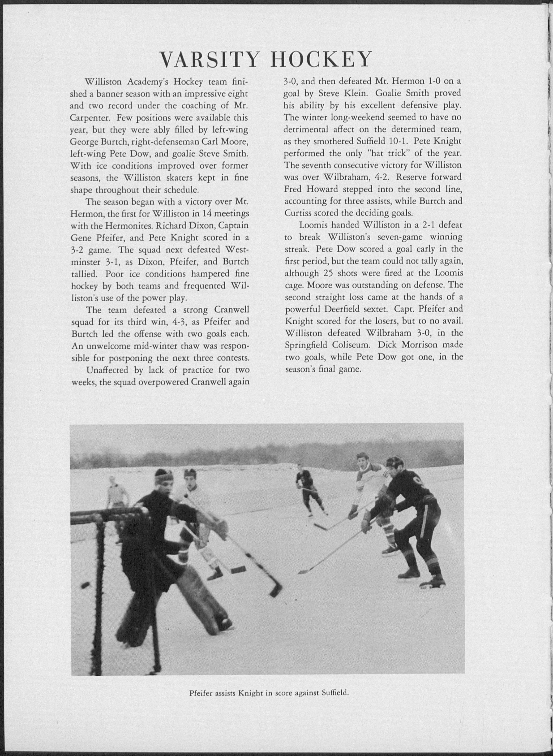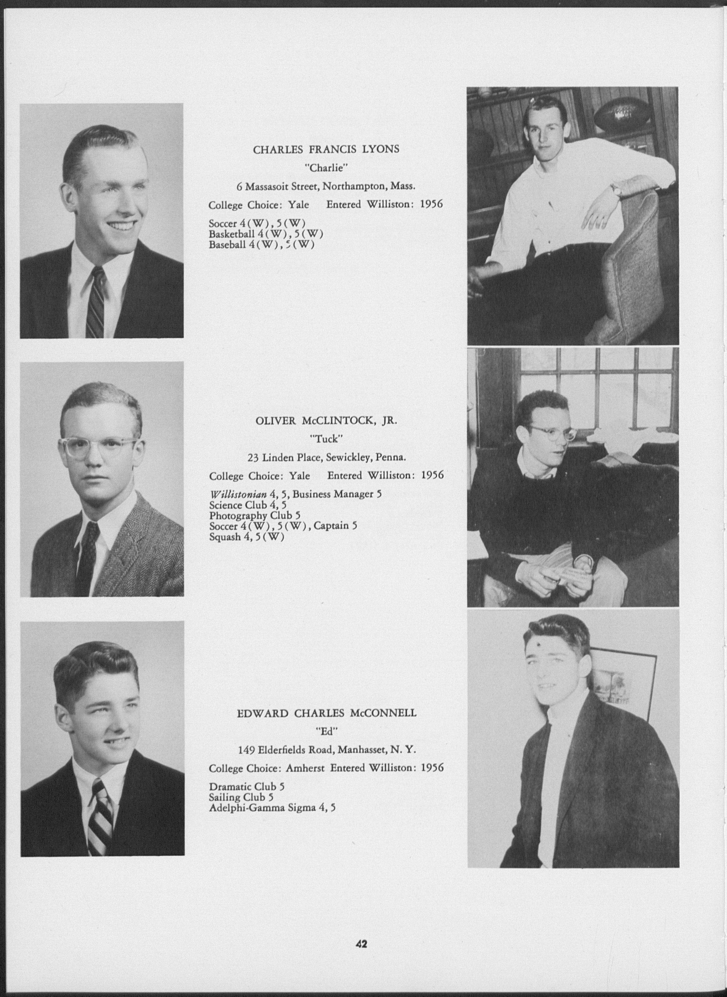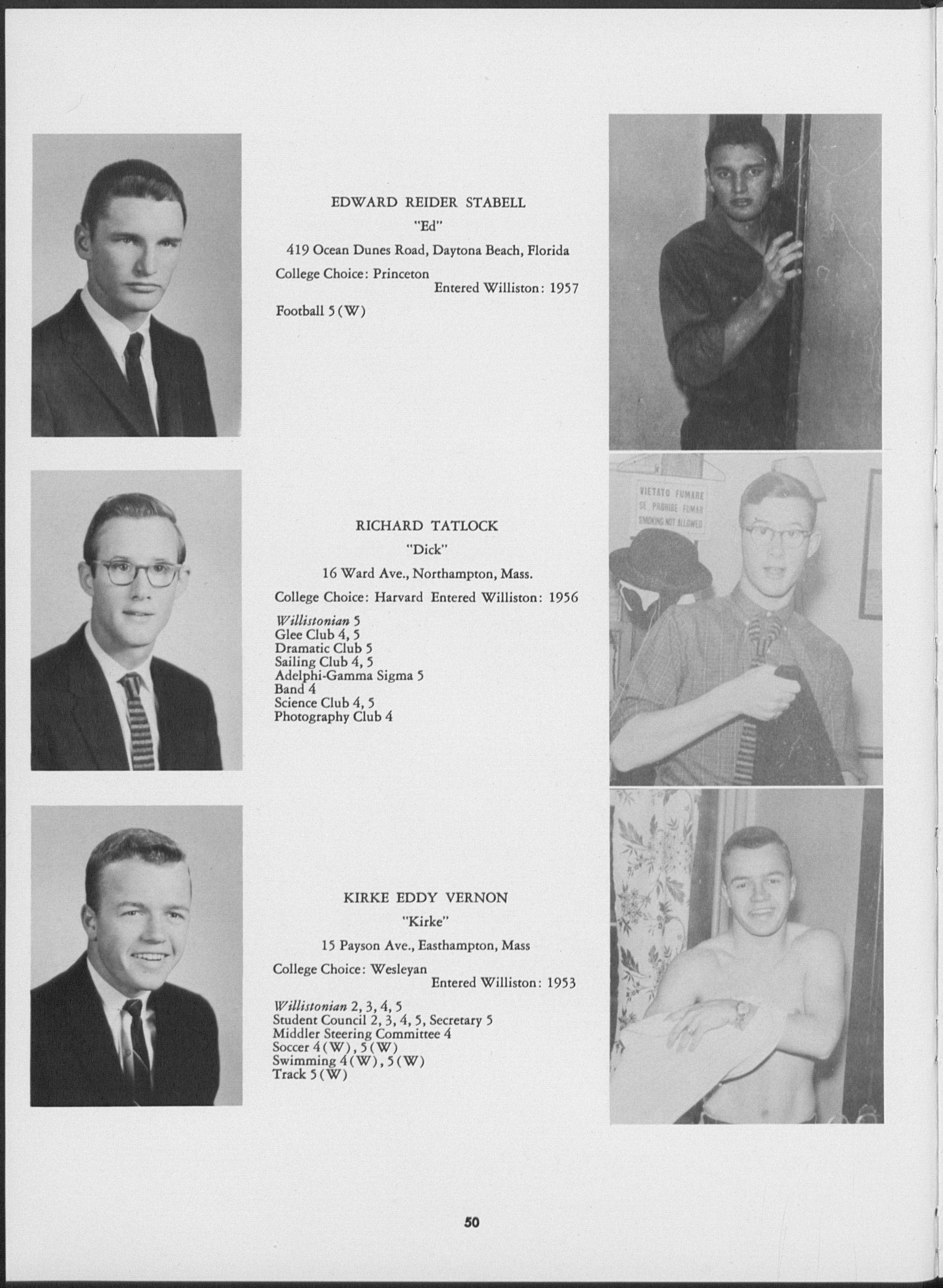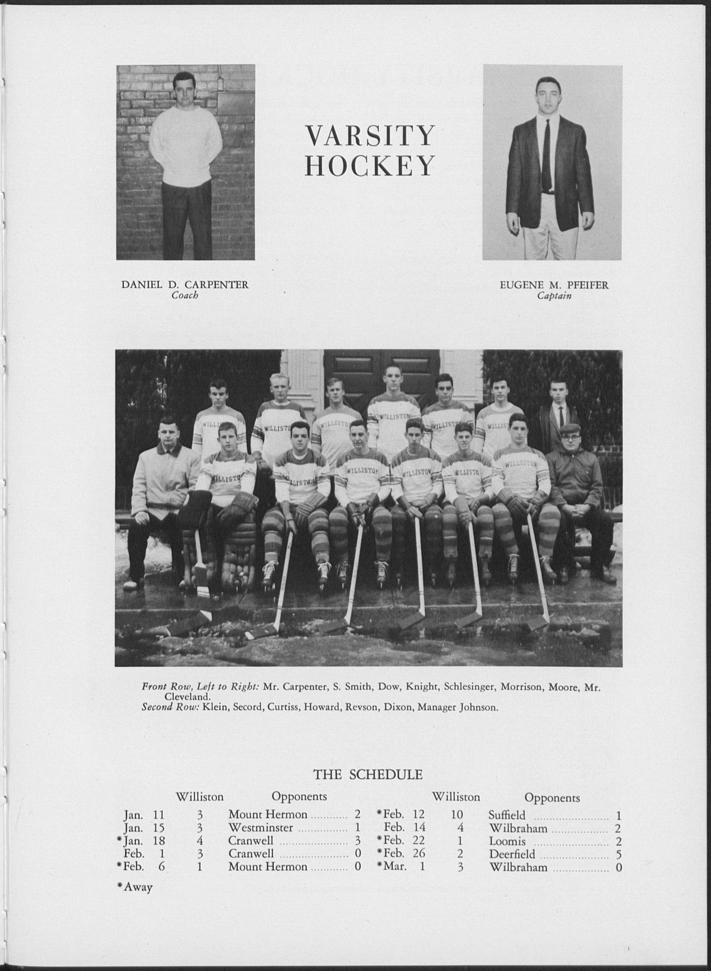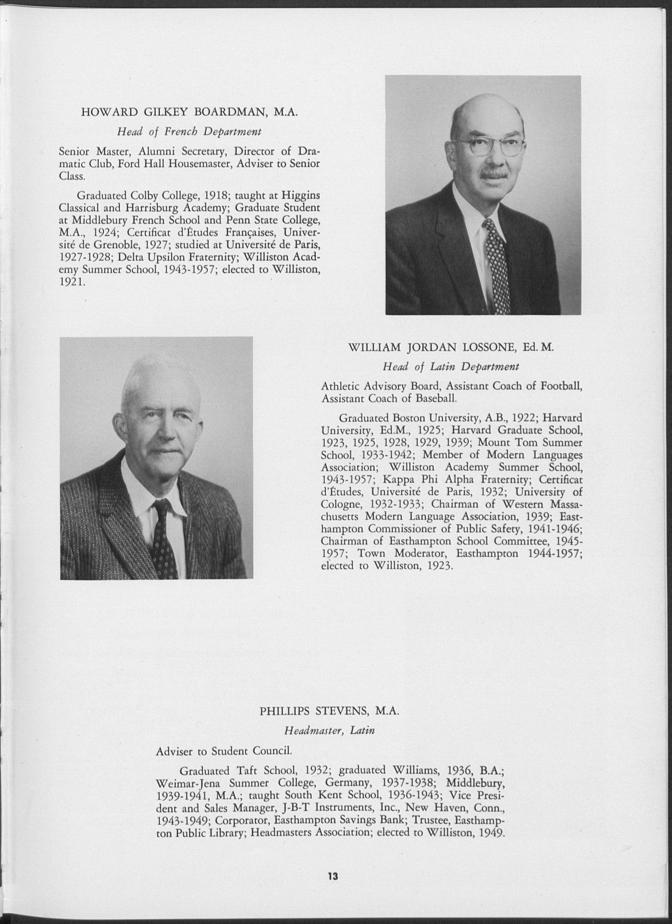 A graduate of Dartmouth College in nineteen-hundred and twenty-five, he entered Williston in nineteen-hundred and fifty-two. A devoted instructor of English and a Senior Master, his unceasing generosity to seniors and underclassmen alike has placed him in highest esteem. It is primarily, however, because of his tireless concern for the individual that this volume is inscribed to him.