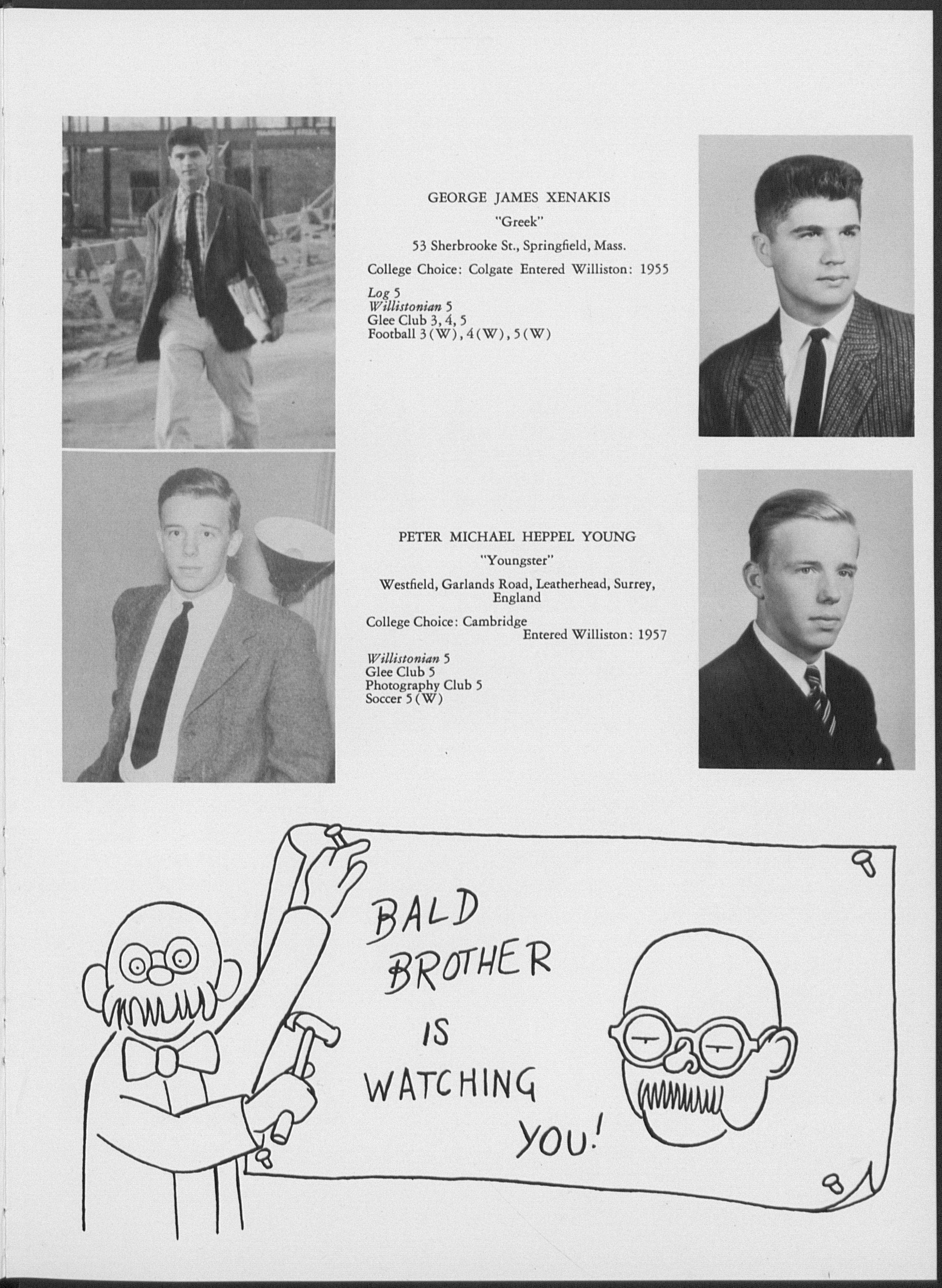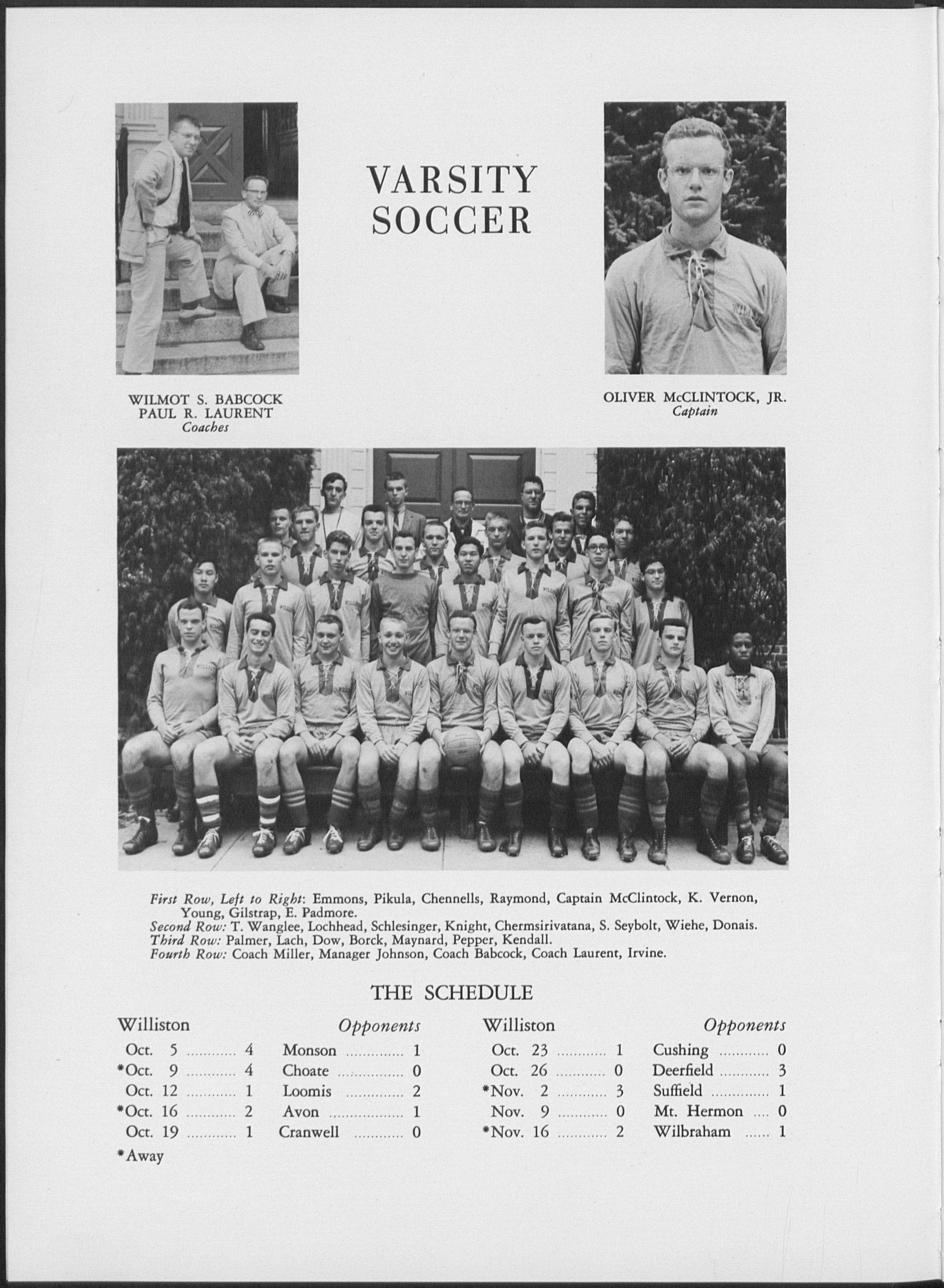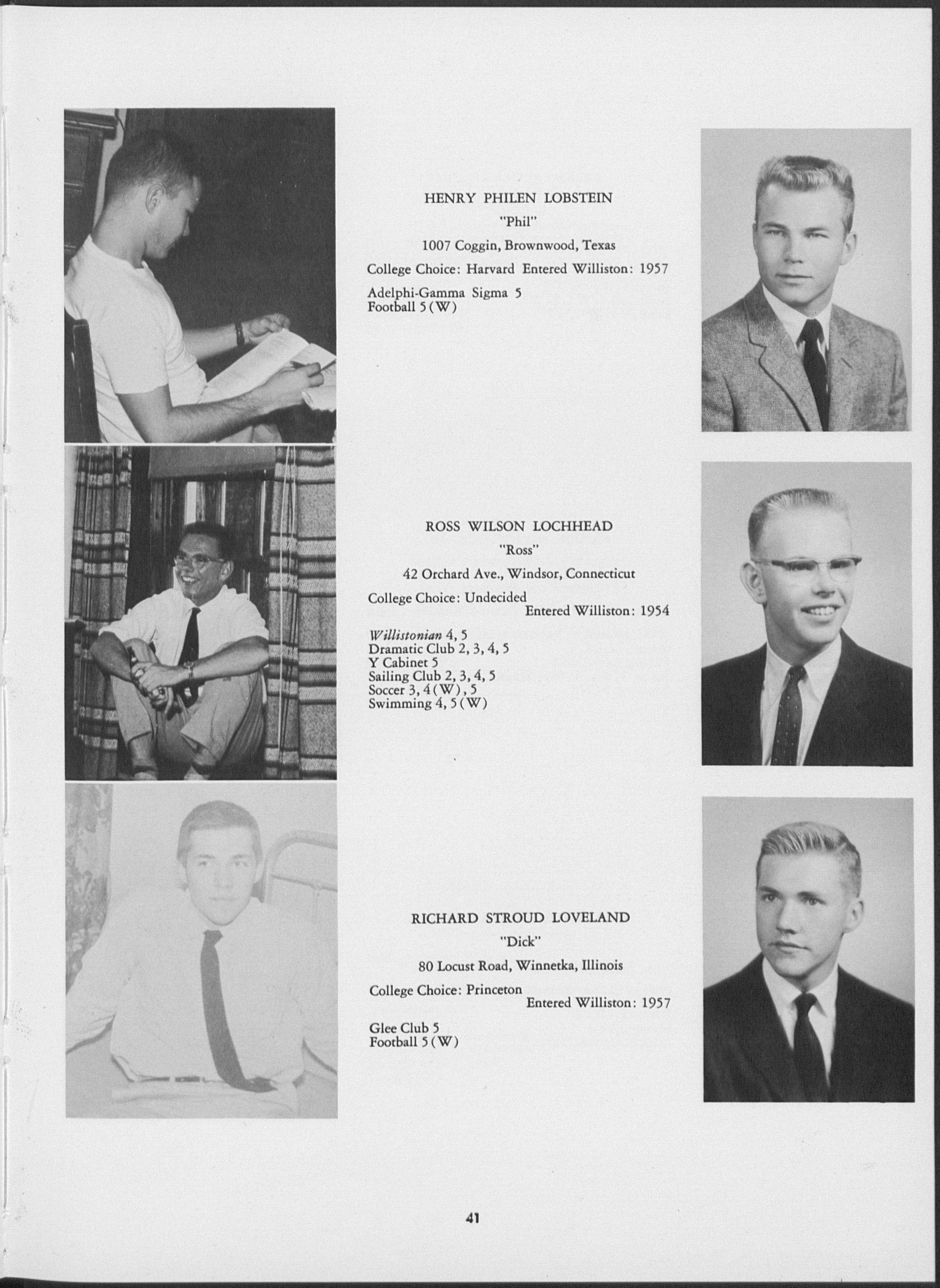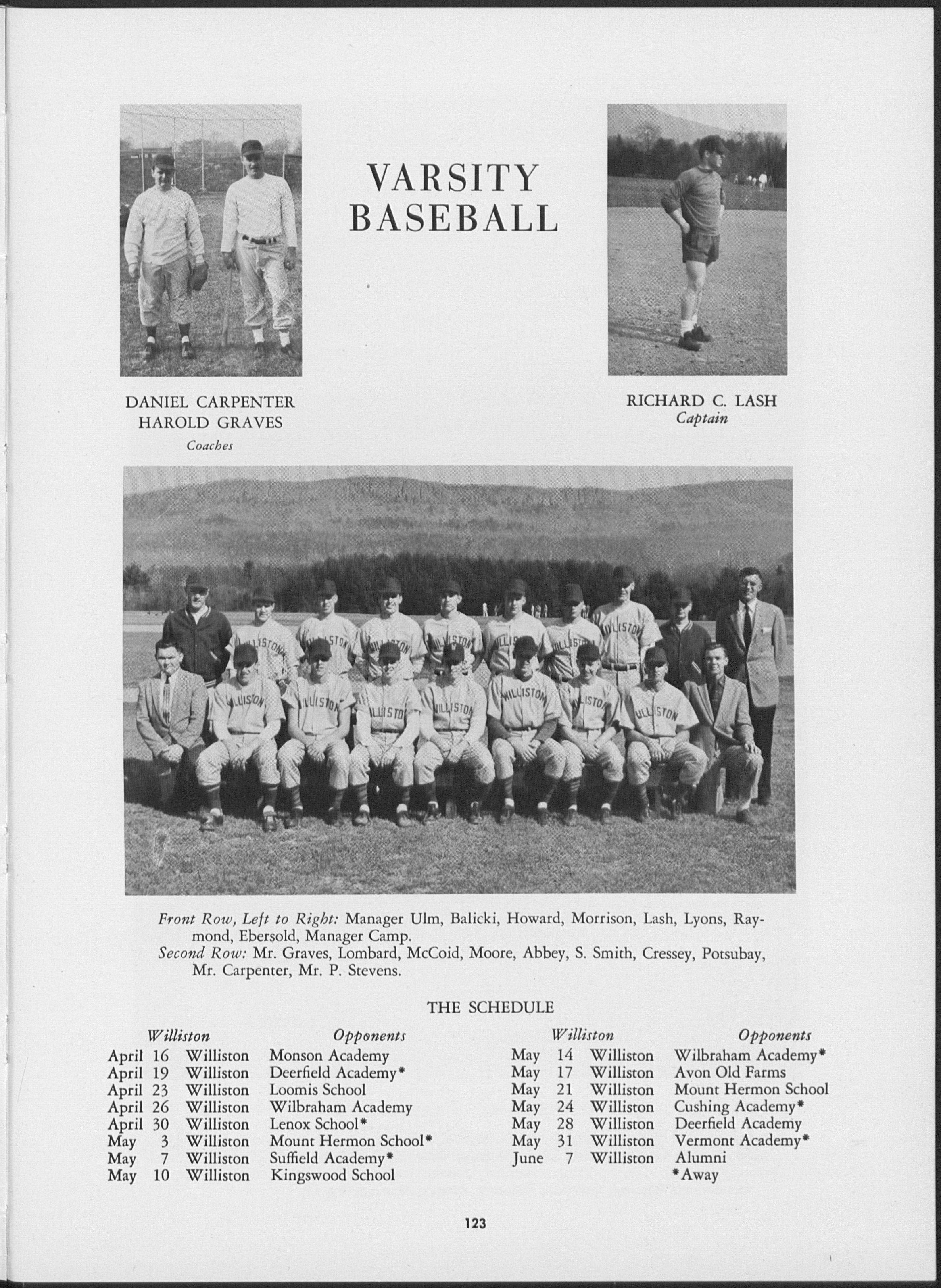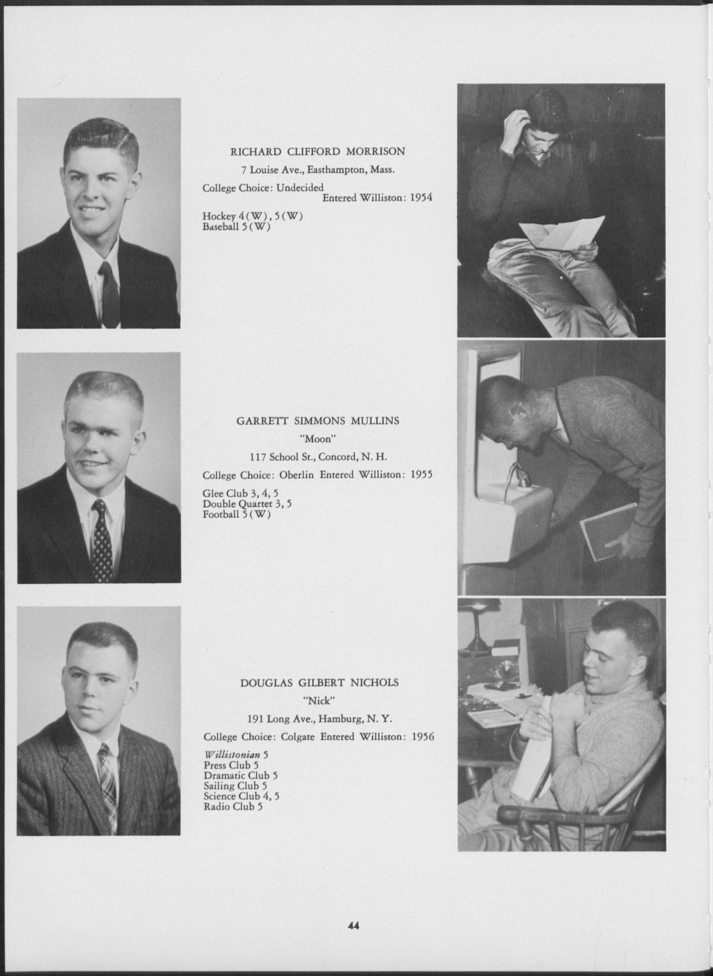A graduate of Dartmouth College in nineteen-hundred and twenty-five, he entered Williston in nineteen-hundred and fifty-two. A devoted instructor of English and a Senior Master, his unceasing generosity to seniors and underclassmen alike has placed him in highest esteem. It is primarily, however, because of his tireless concern for the individual that this volume is inscribed to him.