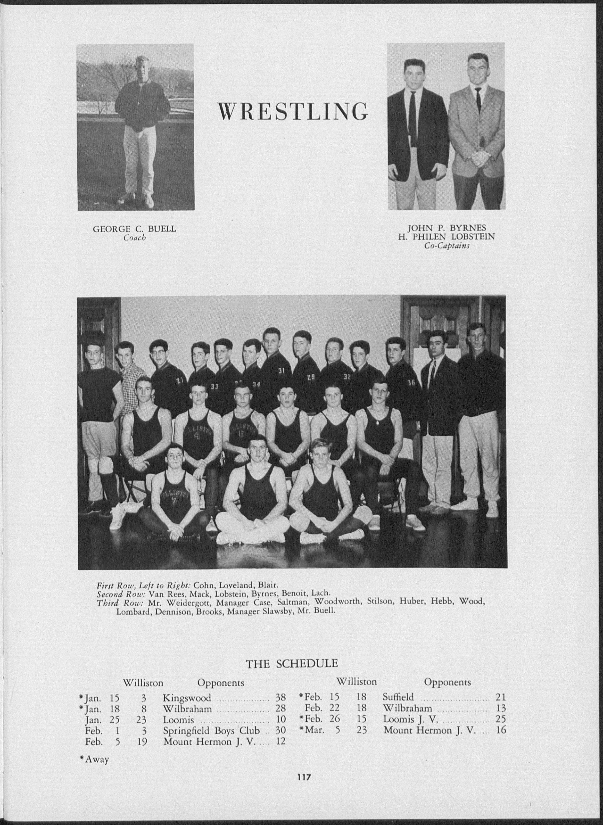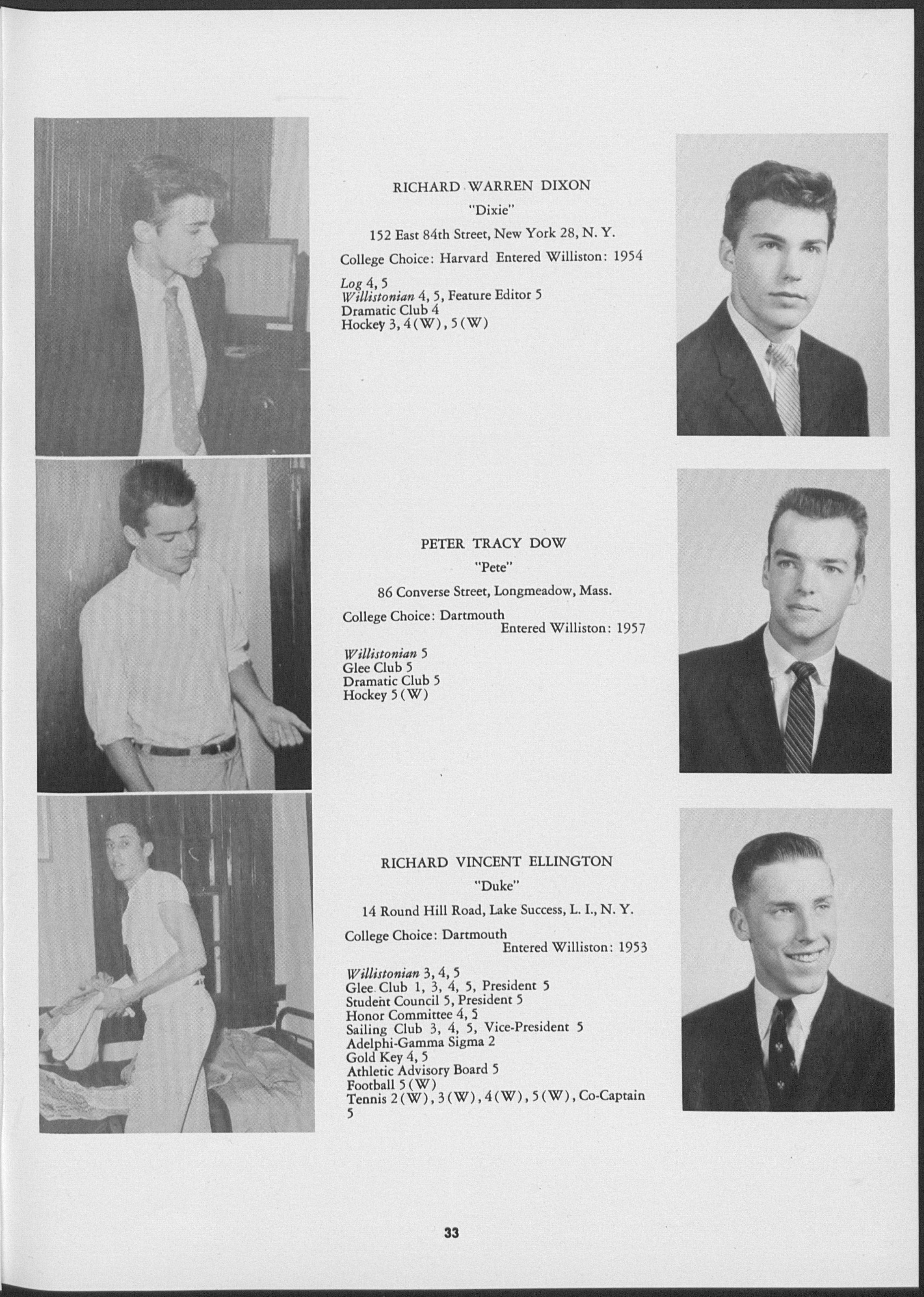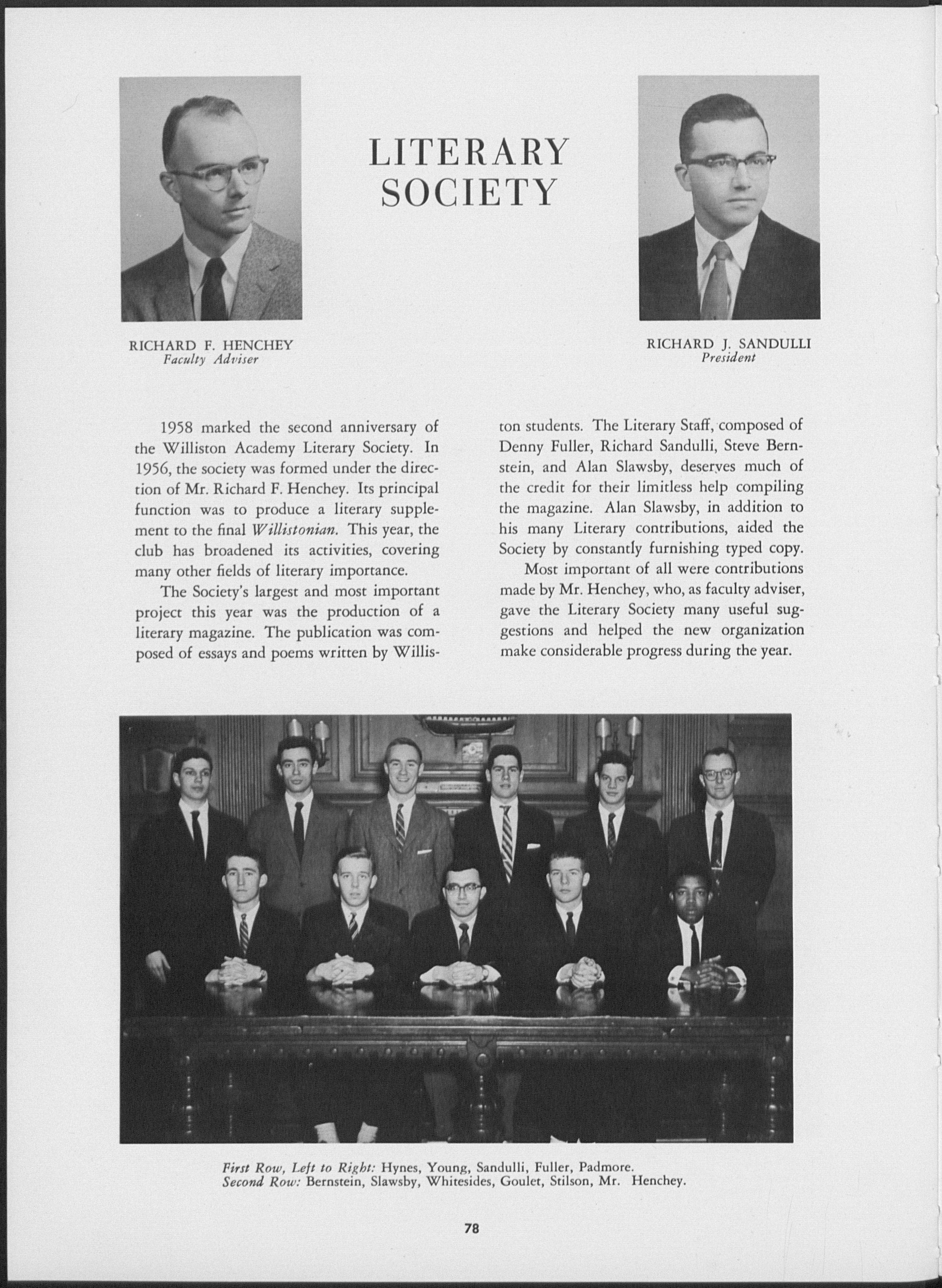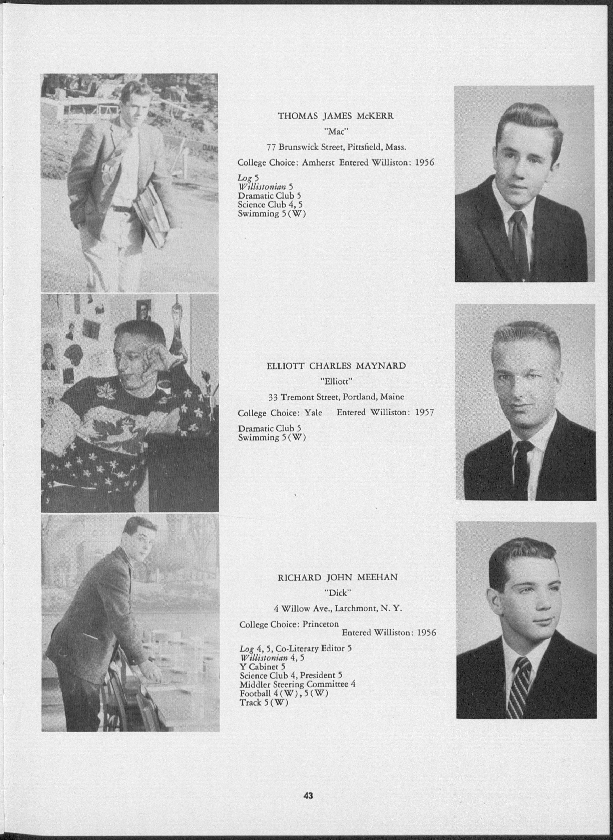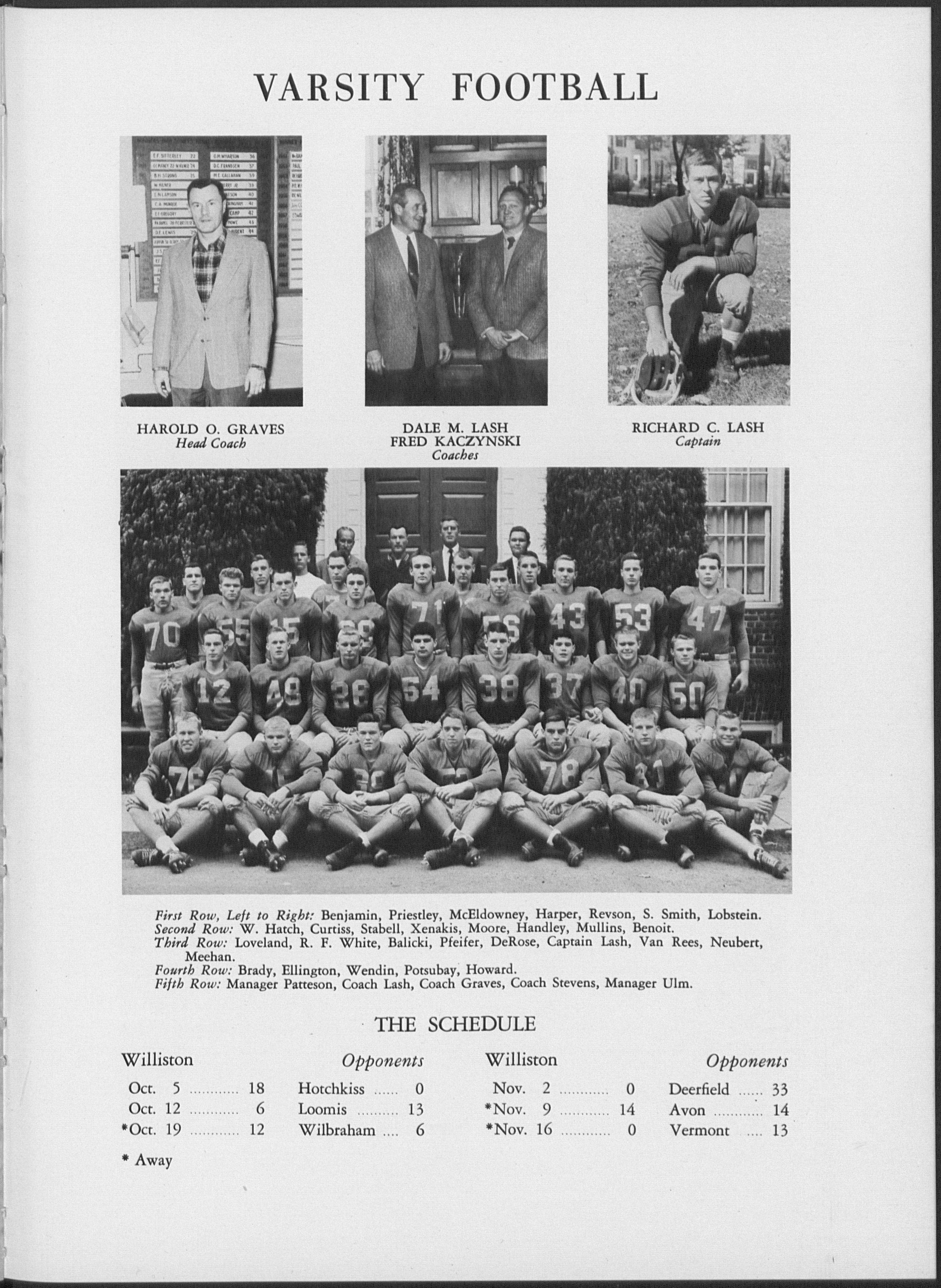 A graduate of Dartmouth College in nineteen-hundred and twenty-five, he entered Williston in nineteen-hundred and fifty-two. A devoted instructor of English and a Senior Master, his unceasing generosity to seniors and underclassmen alike has placed him in highest esteem. It is primarily, however, because of his tireless concern for the individual that this volume is inscribed to him.