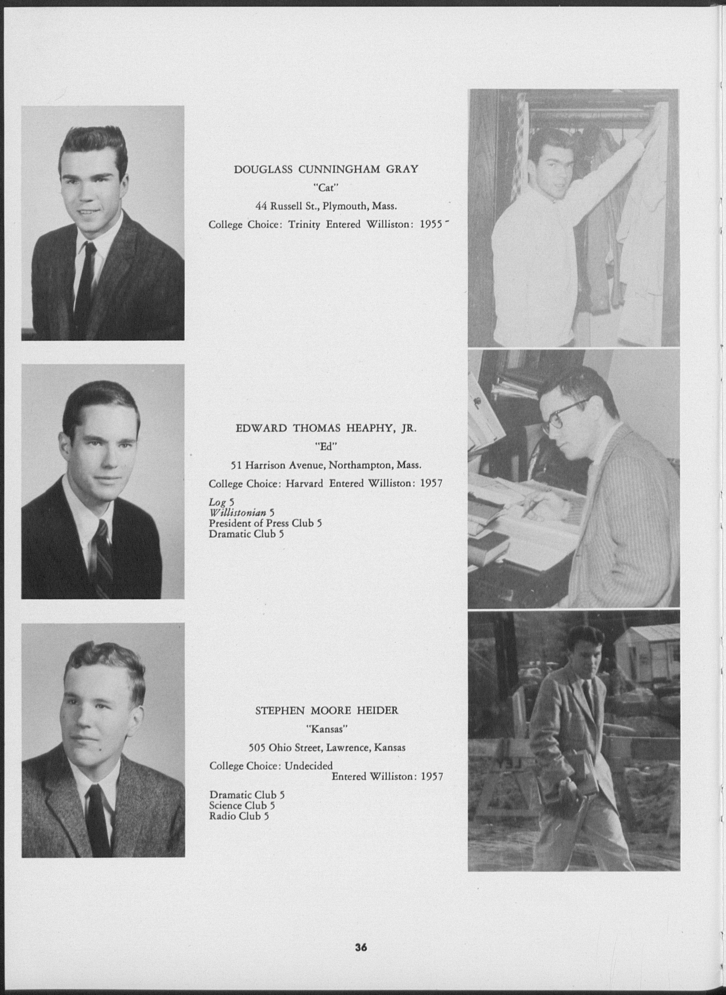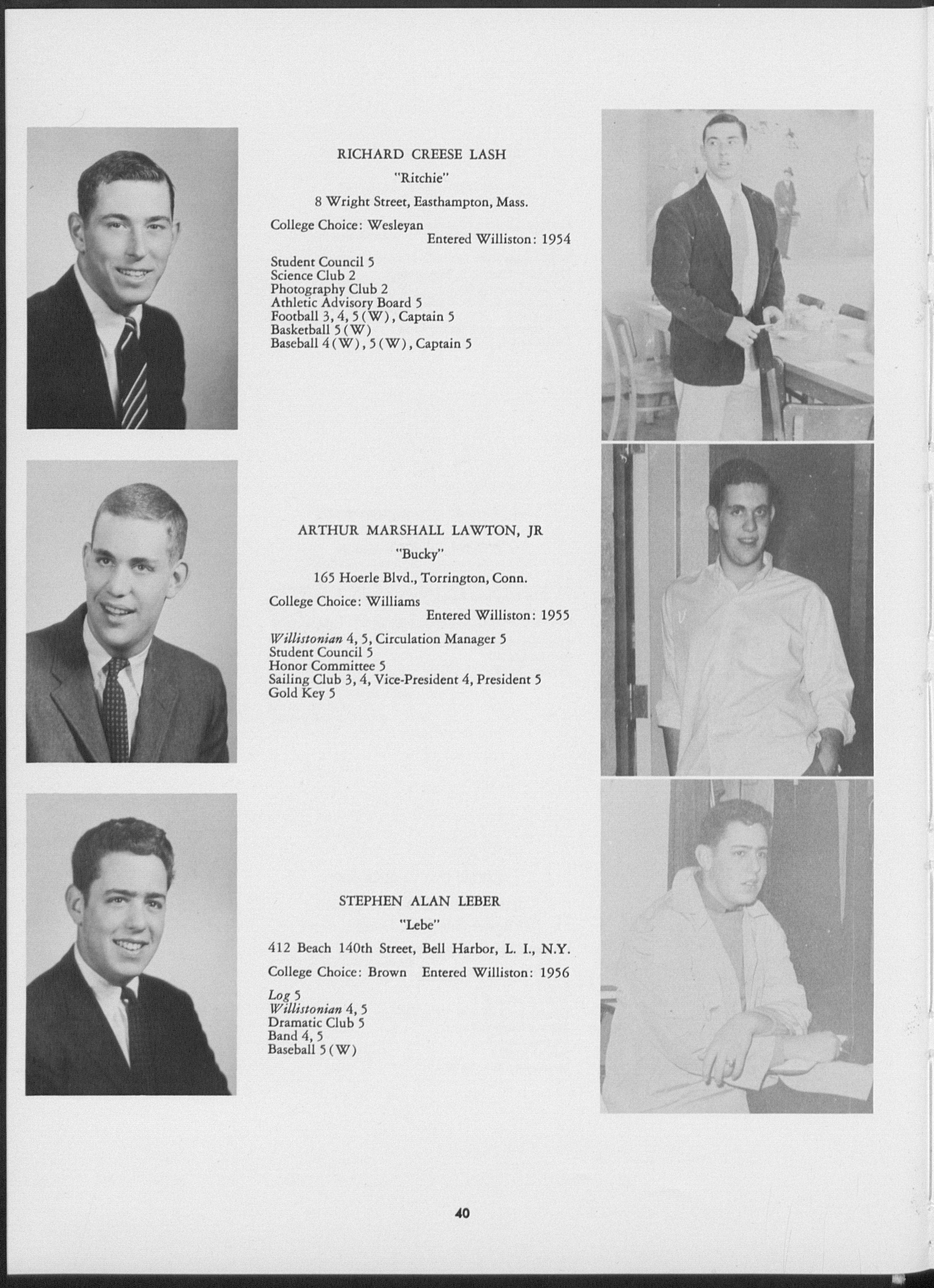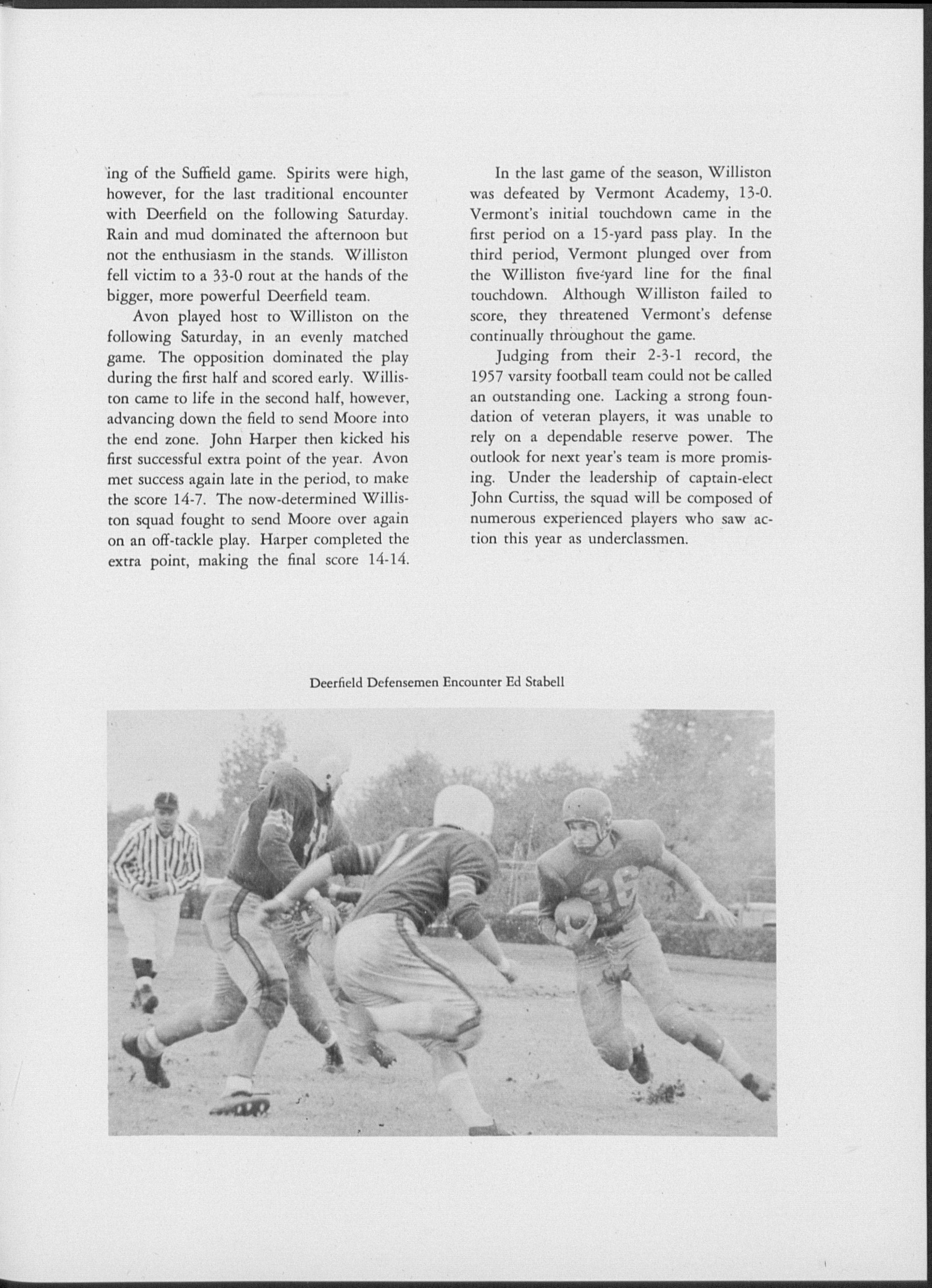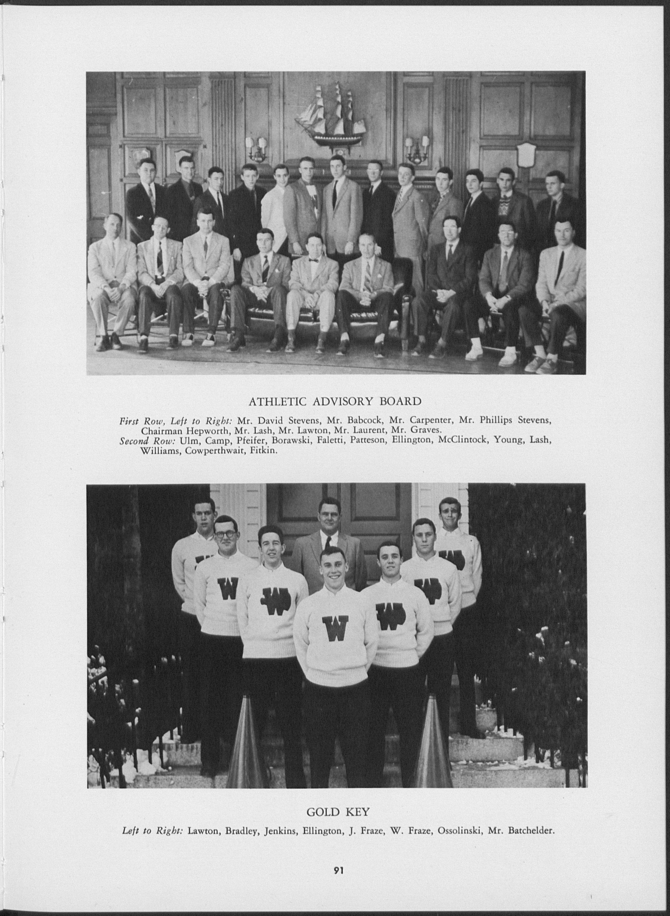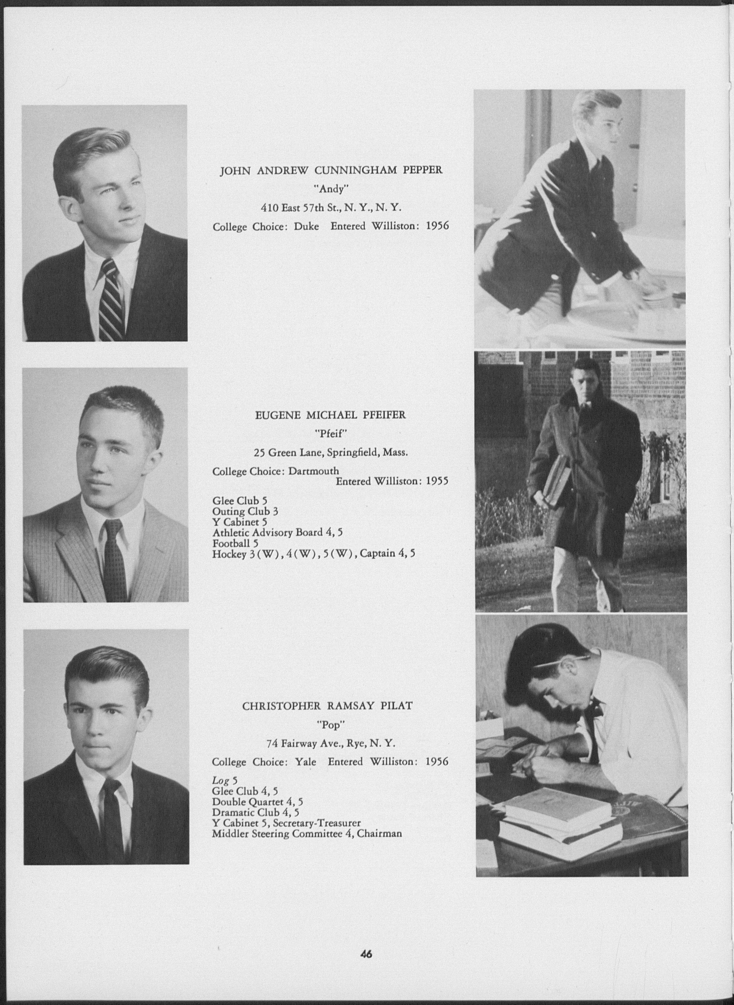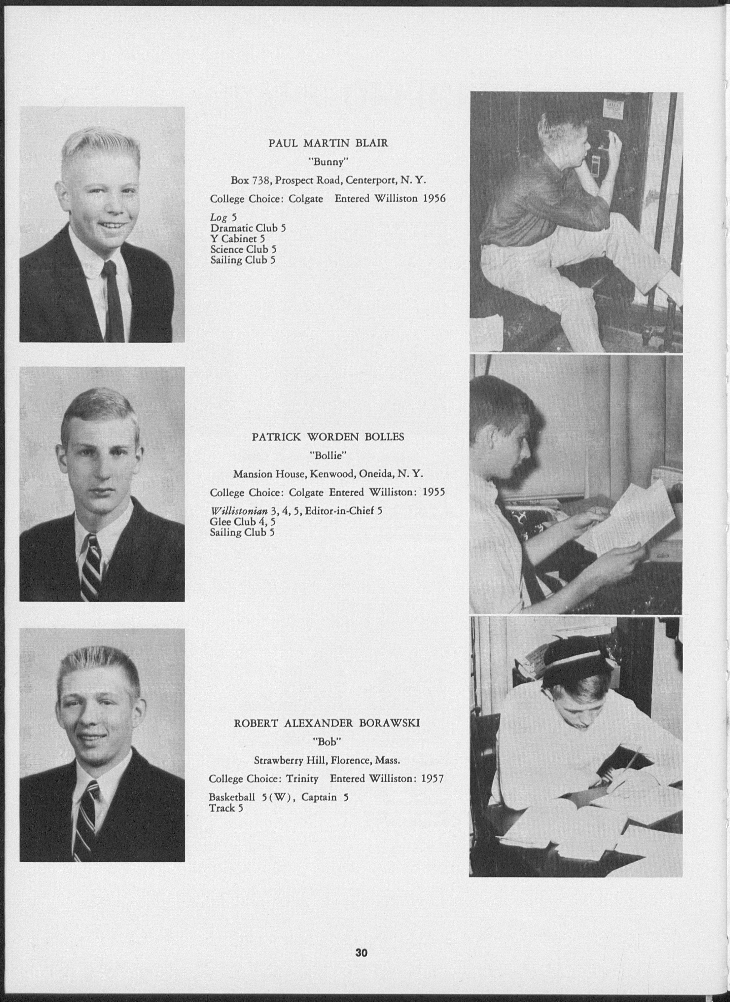A graduate of Dartmouth College in nineteen-hundred and twenty-five, he entered Williston in nineteen-hundred and fifty-two. A devoted instructor of English and a Senior Master, his unceasing generosity to seniors and underclassmen alike has placed him in highest esteem. It is primarily, however, because of his tireless concern for the individual that this volume is inscribed to him.