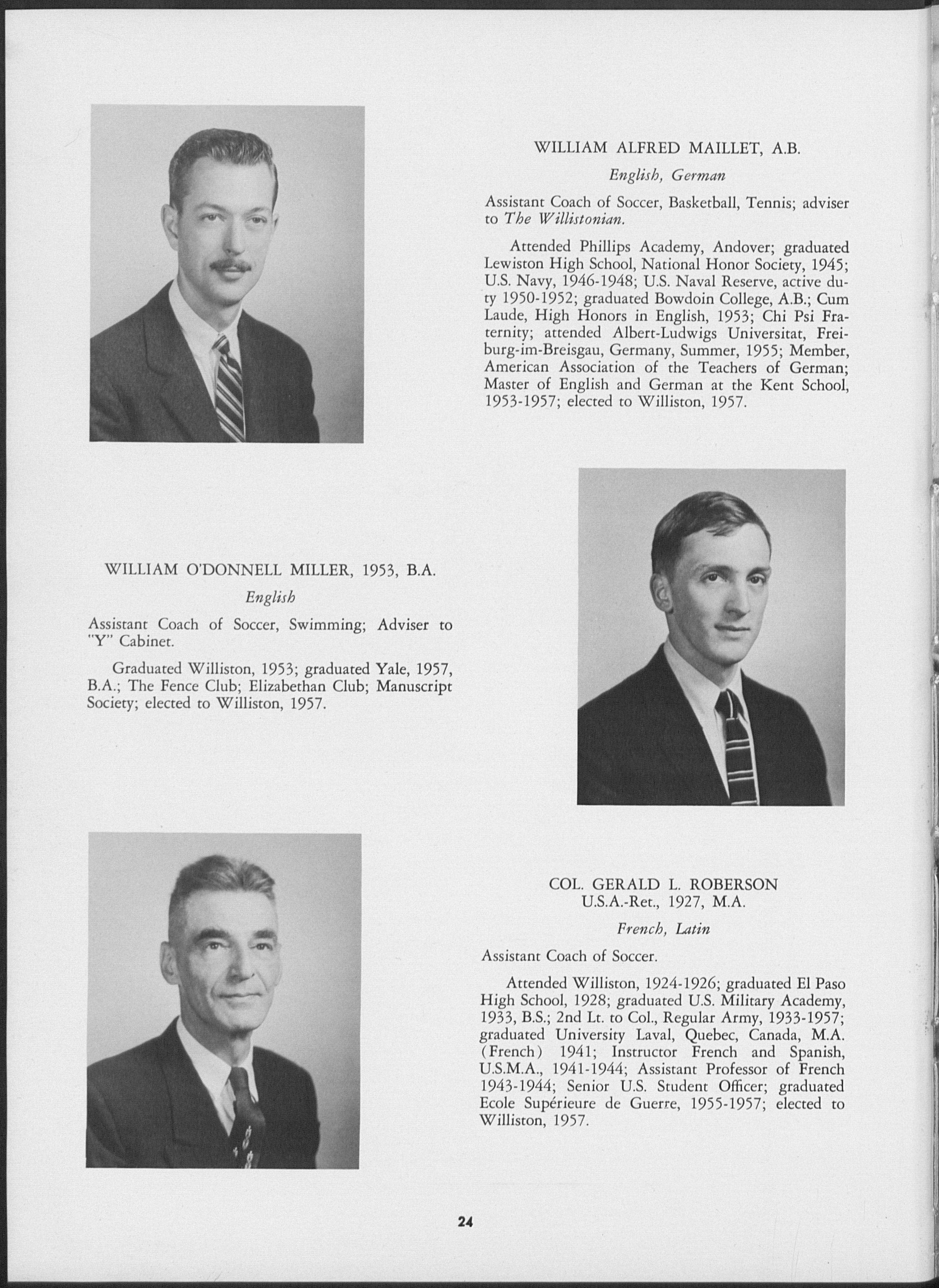 Graduated Boston College, 1939, A.B.; 1940,M.A.; taught English and Latin at Williston Junior School, 1944-1956; Coached Football and Baseball, 19441956; Williston Summer School, 1947-1956; elected to Williston, 1944.