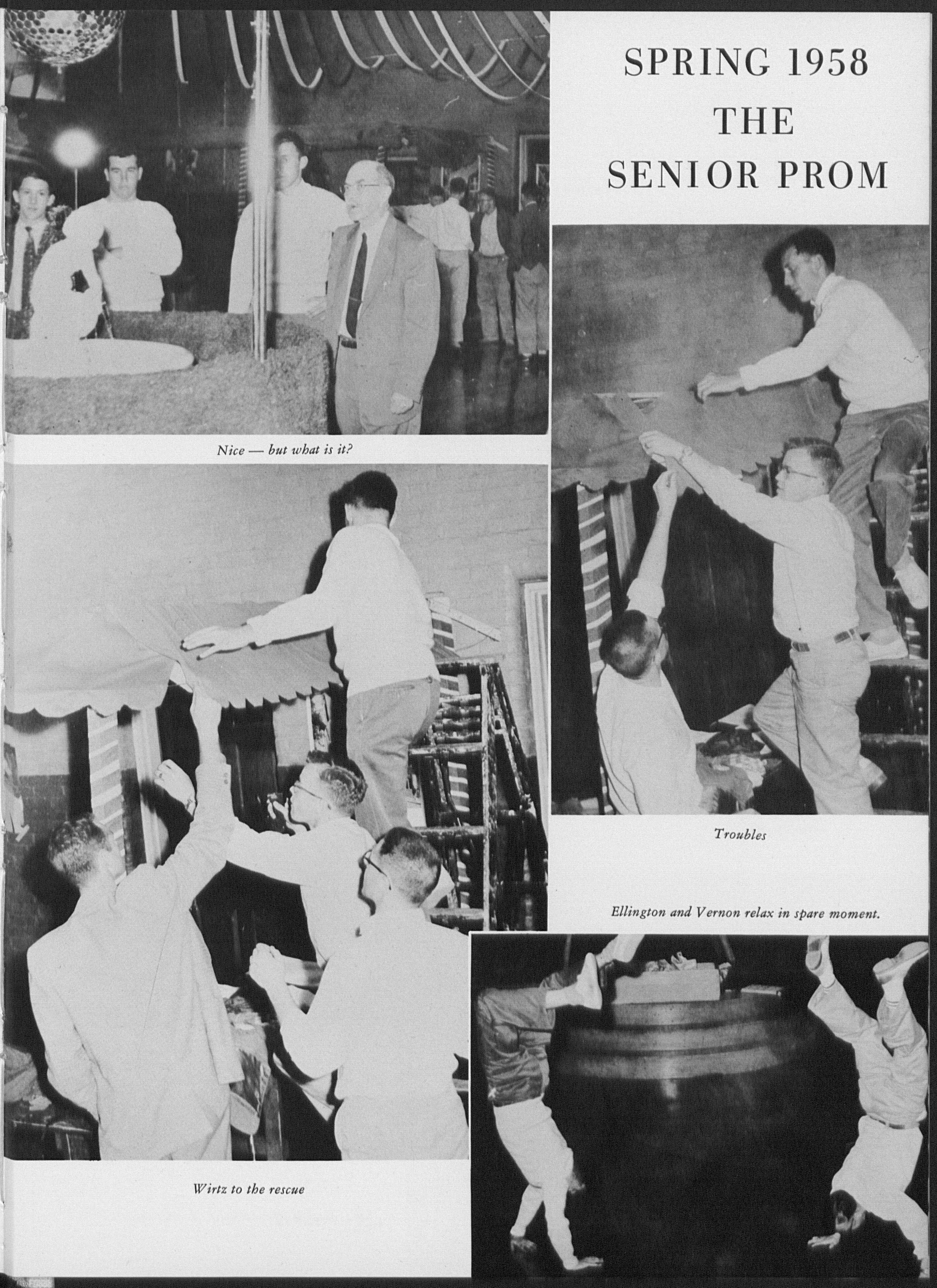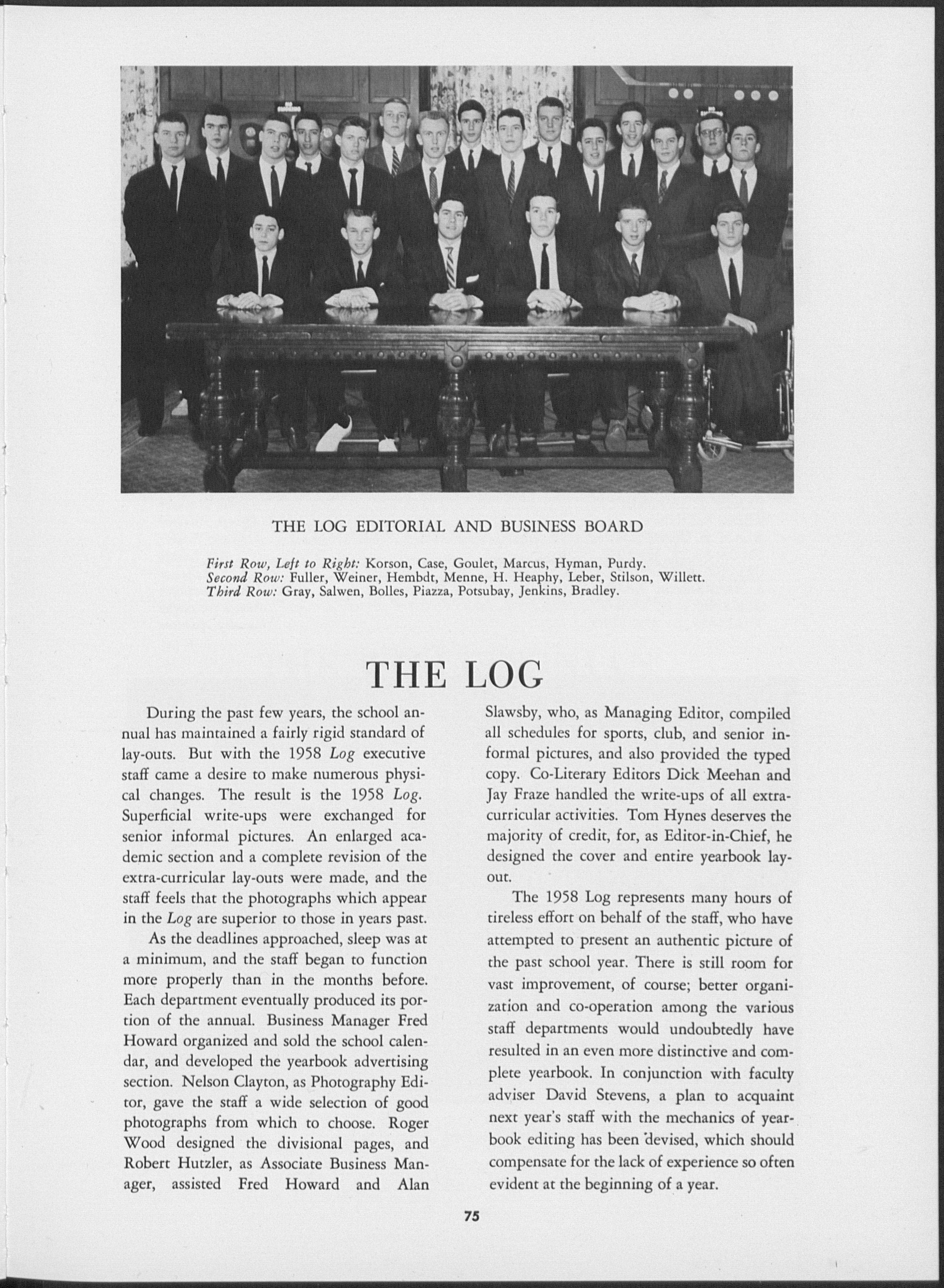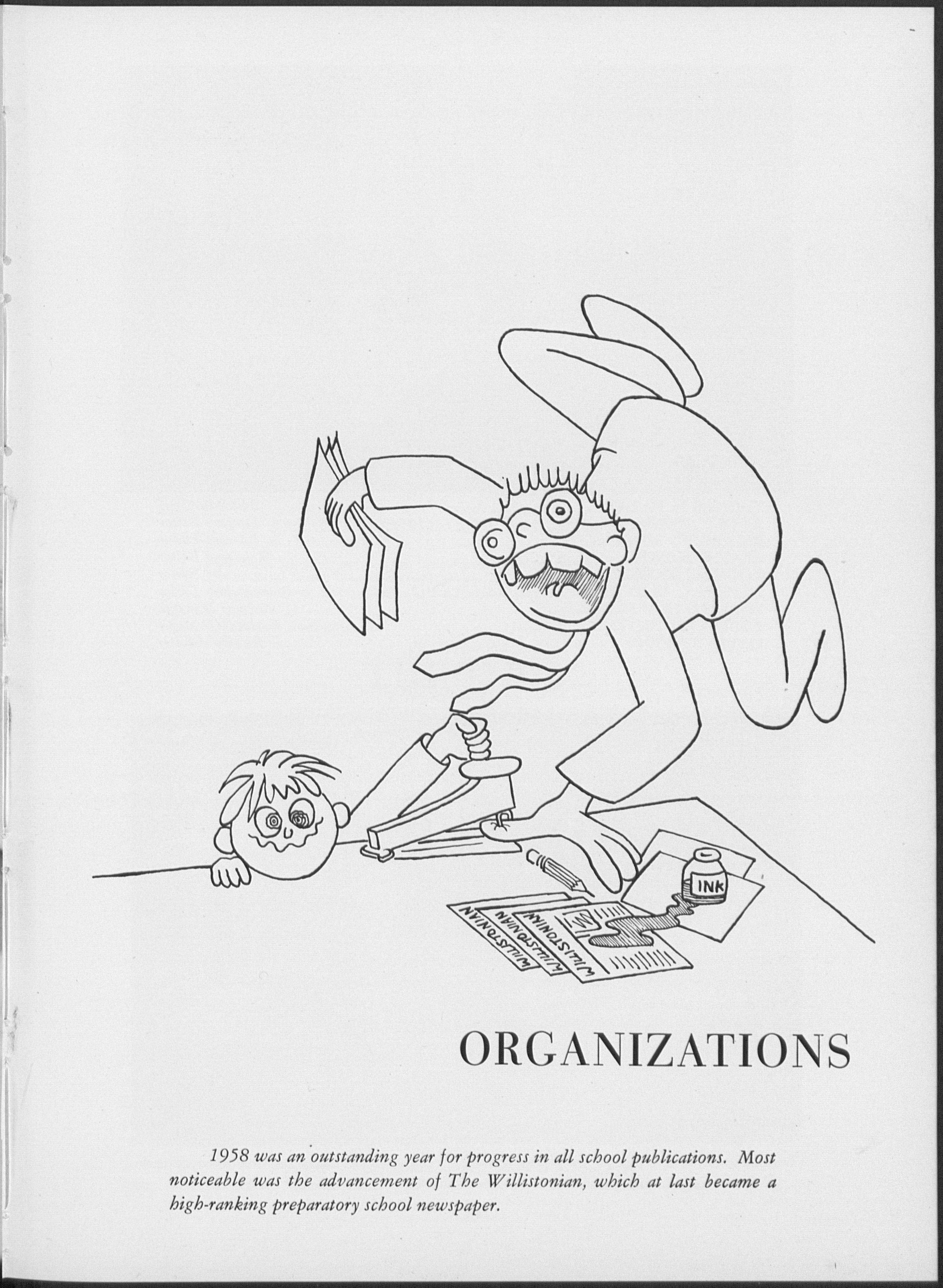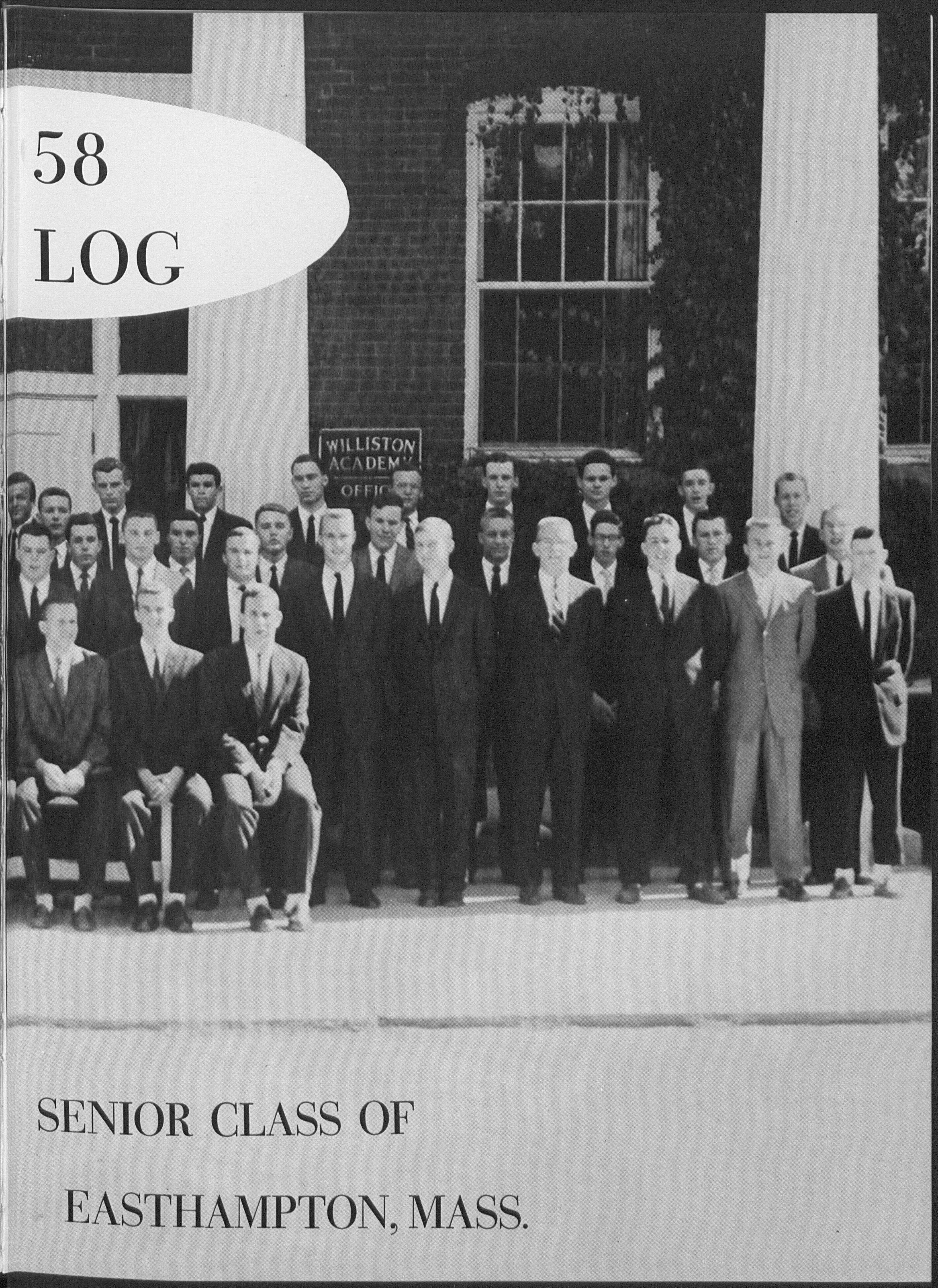 Since its founding in 1841, Williston Academy has been an institution of constant change and progress. Nothing but memories remains of the old Williston; its end was symbolized by the debris of the fallen gym tower, almost two years ago. We are now surrounded by a campus which has its roots in the early years of this century, in essence a reborn Williston. The past year has seen the dawn of a new era of progress, one which promises to surpass all others in the school's history. In this, the 1958 Log, we have attempted to illustrate the new Williston, enveloped by both tradition and the advancements of years to come.