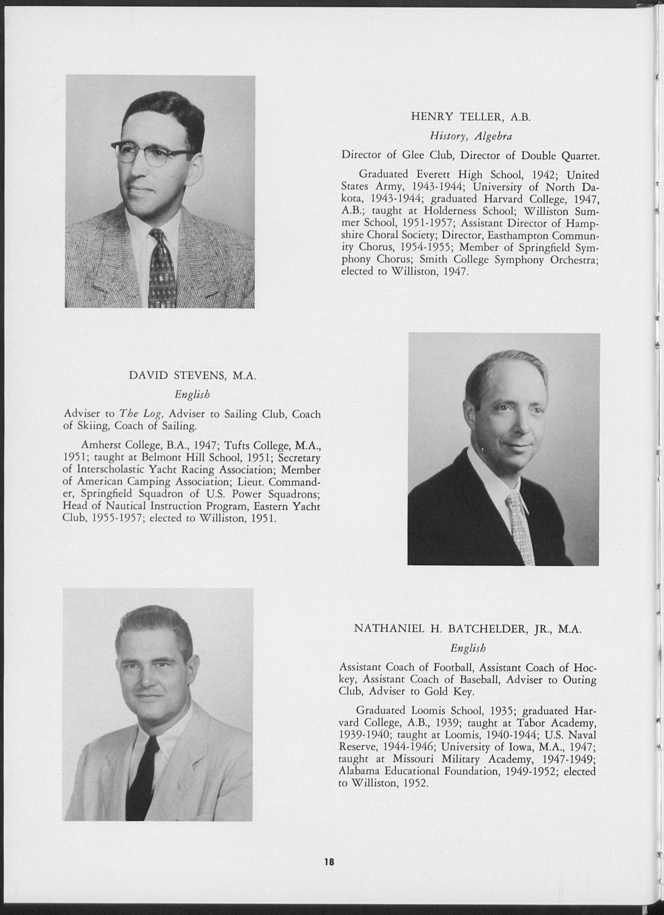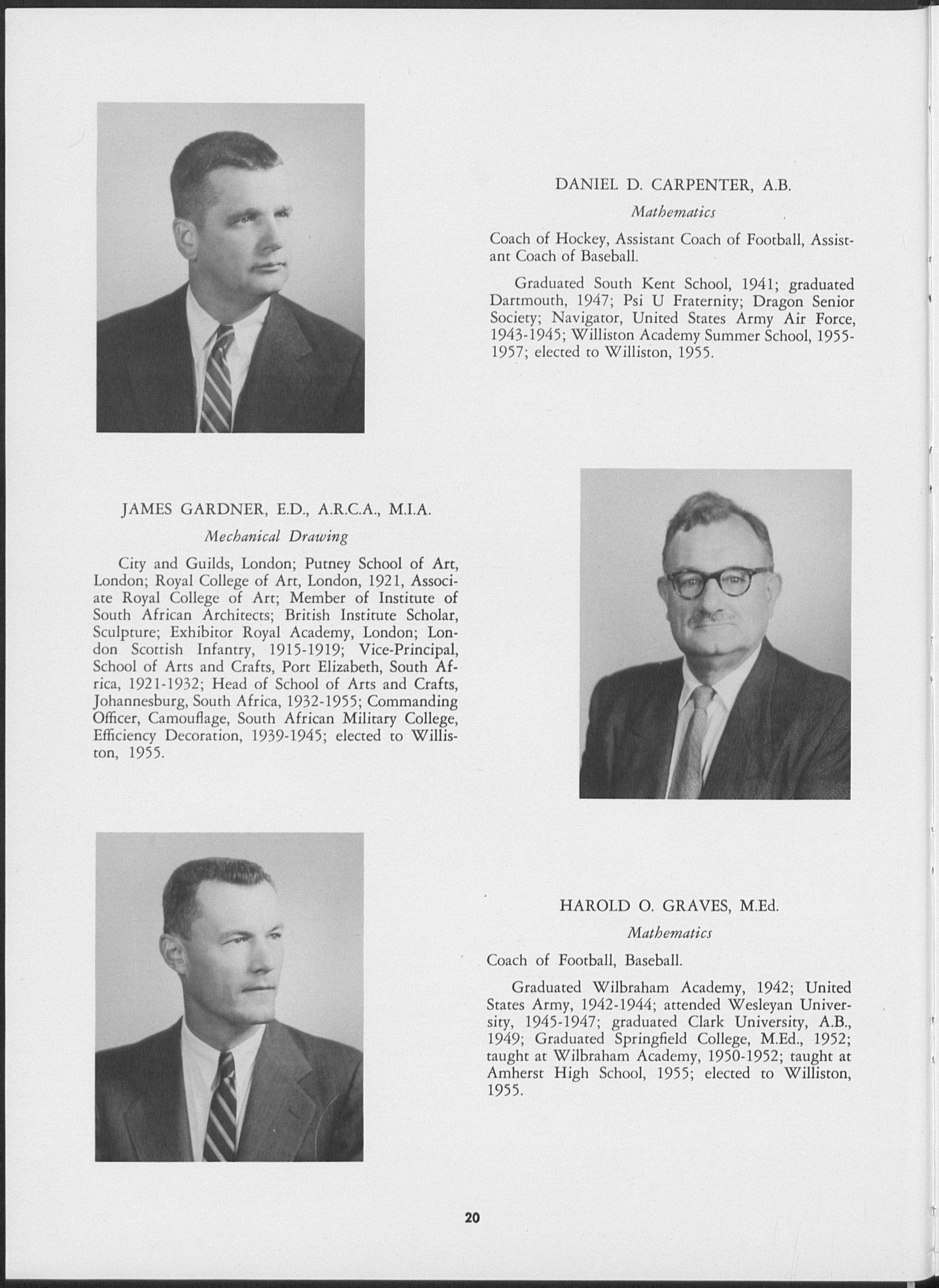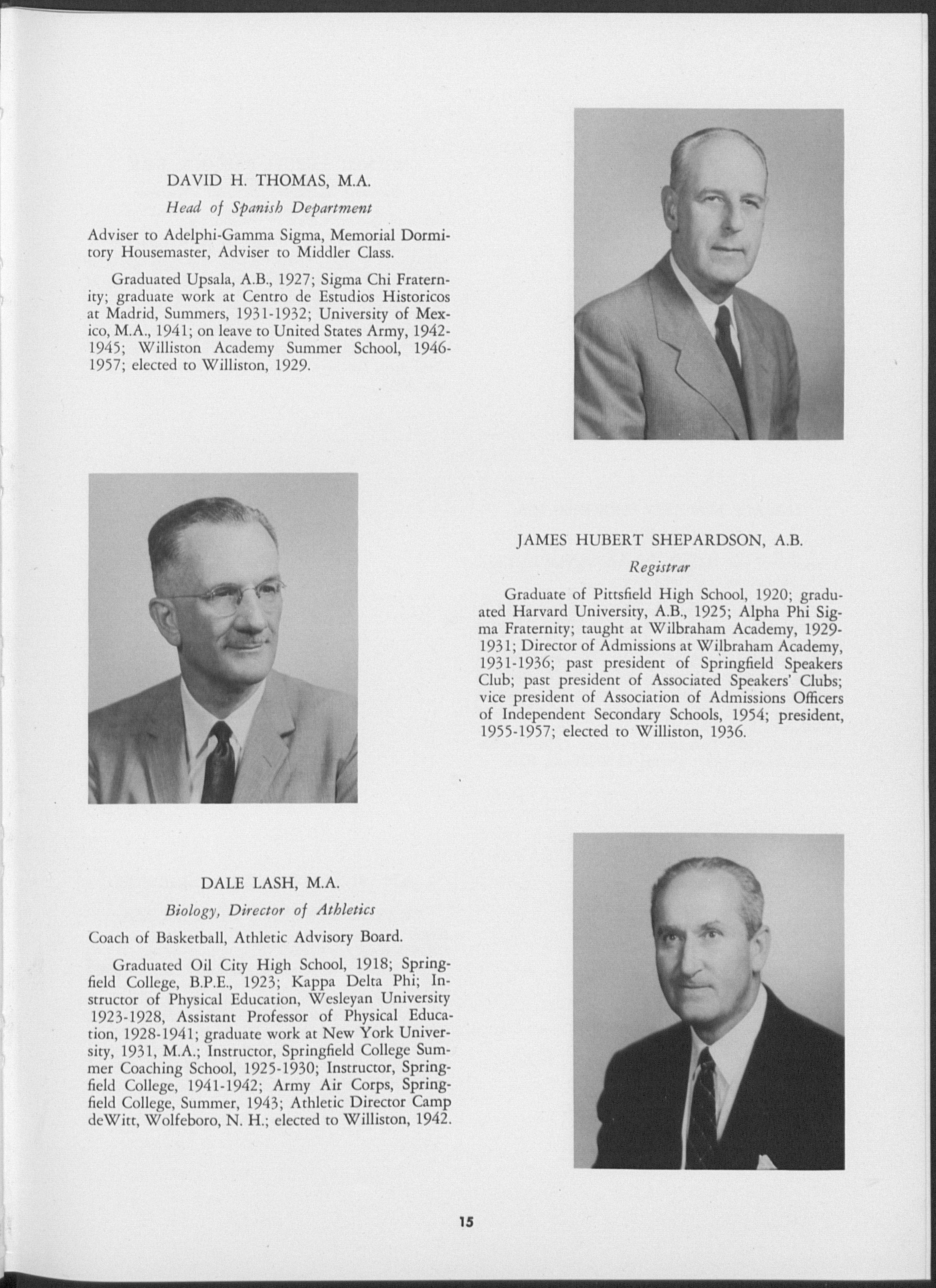 Graduate of Pittsfield High School, 1920; graduated Harvard University, A.B., 1925; Alpha Phi Sigma Fraternity; taught at Wilbraham Academy, 19291931; Director of Admissions at Wilbraham Academy, 1931-1936; past president of Springfield Speakers Club; past president of Associated Speakers' Clubs; vice president of Association of Admissions Officers of Independent Secondary Schools, 1954; president, 1955-1957; elected to Williston, 1936.