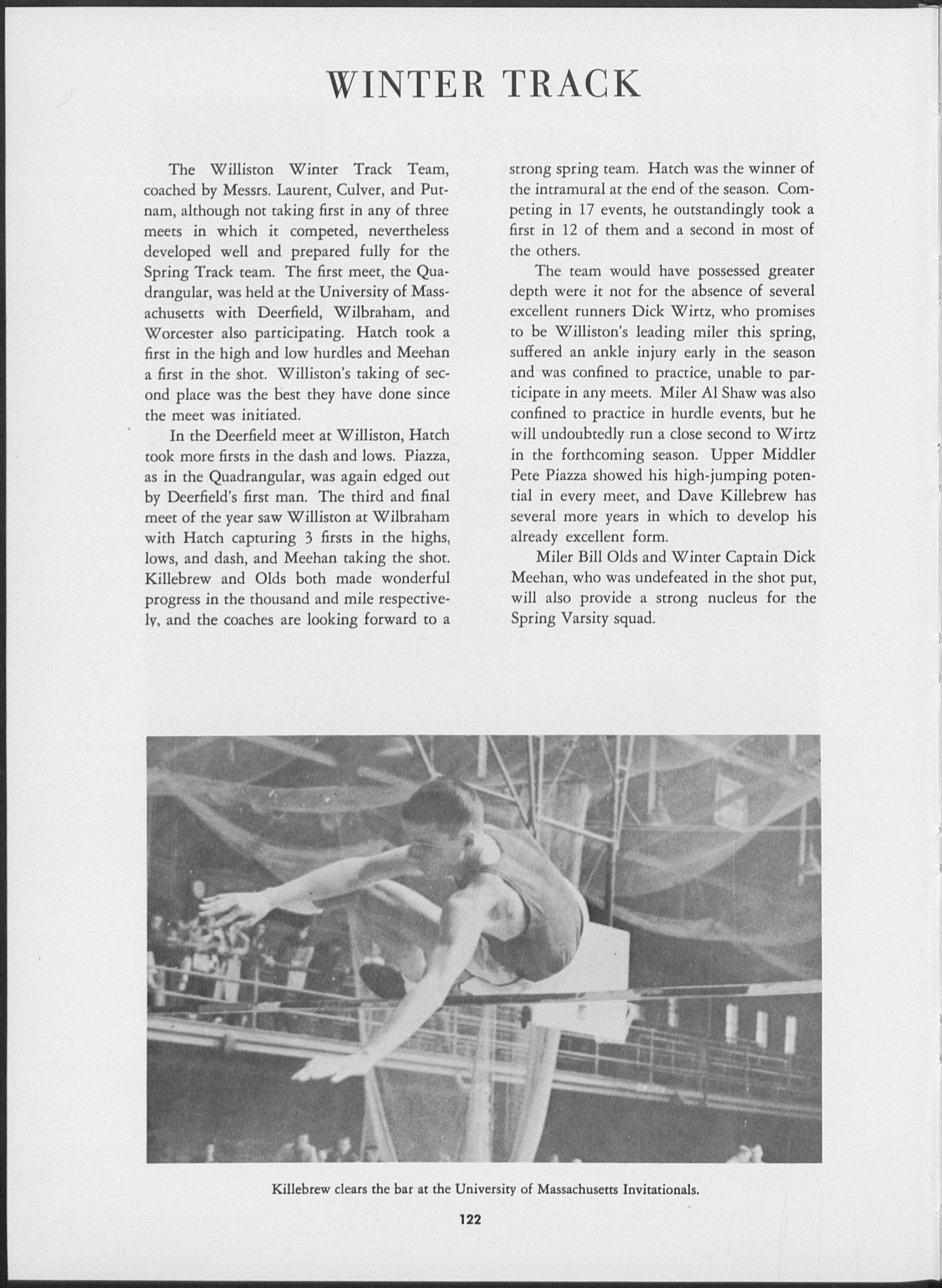 In the mile and half mile, Rick Wirtz, Roy Chennels, Dave Killebrew, and Bill Olds placed favorably in most of the meets. The field events proved the backbone of this year's team, with Pete Piazza in the high jump, and Kirke Vernon and John Curtiss in the pole vault. In the weights there was keen competition between Dick Meehan and Charlie DeRose, and some unusually good distances were recorded this season.
