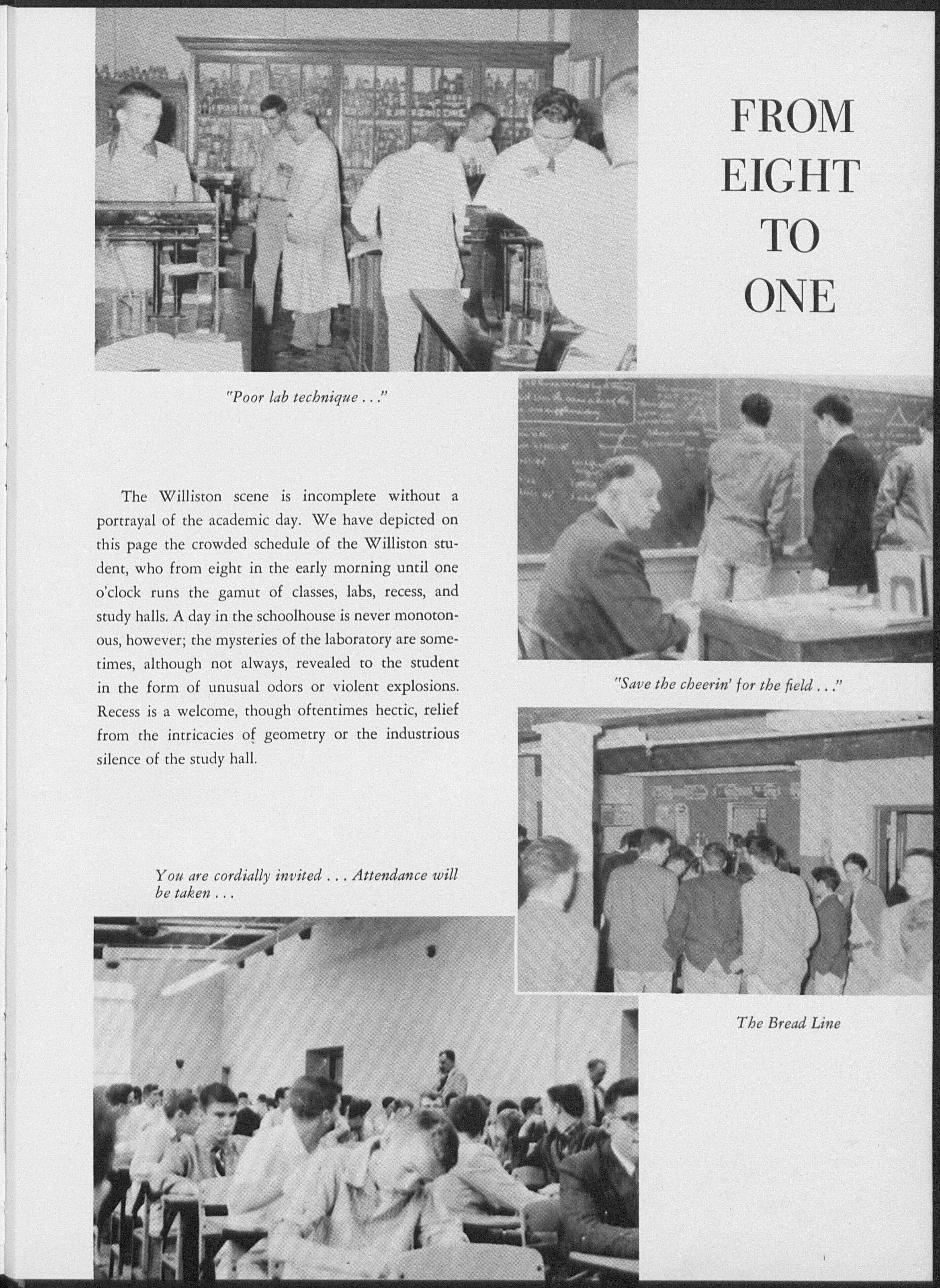 The Williston scene is incomplete without a portrayal of the academic day. We have depicted on this page the crowded schedule of the Williston student, who from eight in the early morning until one o'clock runs the gamut of classes, labs, recess, and study halls. A day in the schoolhouse is never monotonous, however; the mysteries of the laboratory are sometimes, although not always, revealed to the student in the form of unusual odors or violent explosions. Recess is a welcome, though oftentimes hectic, relief from the intricacies of geometry or the industrious silence of the study hall.