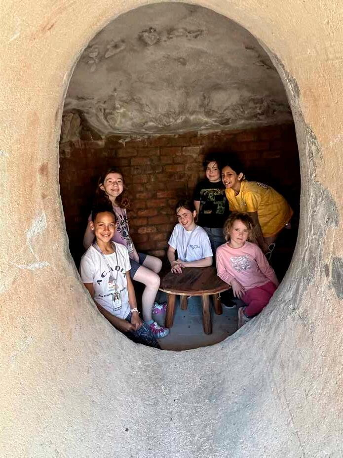 BY RESIDENT AND JUNIOR WRITER NOELLE BRINKERFor this month’s April Junior Writer meeting, the Stroll team spent an afternoon at the beautiful National Botanic Garden, owned by Mr. and Mrs. Peter and Beata Knop. Before the gardens were created, the land used to be made up of fields that grew corn and helpful medicines to treat illnesses such as malaria. In the 1950s Mr. Peter’s mother and father, along with his grandmother bought the land, which ultimately became the National Botanic Garden. Since then, the Garden has been growing every year, both in nature and in art! In 2007 the Knops began to build something new, they called it the Hobbit Town. The hobbit homes there are made to look like the round hill-like houses in The Lord of the Rings and The Hobbit. Hobbit Town was built on top of pieces of the old Reston distillery relocated to the site, to repurpose the material and to add height to the area. They also used some of the old rock and stone from the distillery to build the Hobbit homes, along with old concrete stairs and unused, but discarded, cement sewer culverts. When exploring the nooks and crannies of Hobbit Town you will find all kinds of secrets and special touches, such as a door that opens to reveal a room you can stay the night in complete with a table,