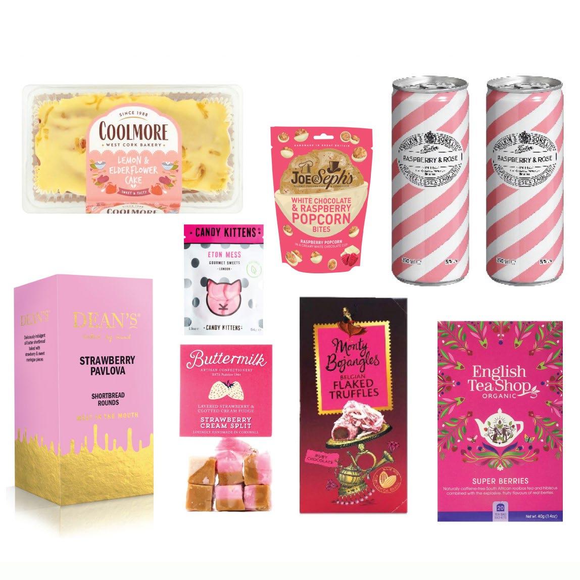 Seven food treats for a delightful afternoon tea or garden party, including a selection of cakes and biscuits, along with a box of super berries tea, and 2 cans of Raspberry & Rose Gin Fizz.