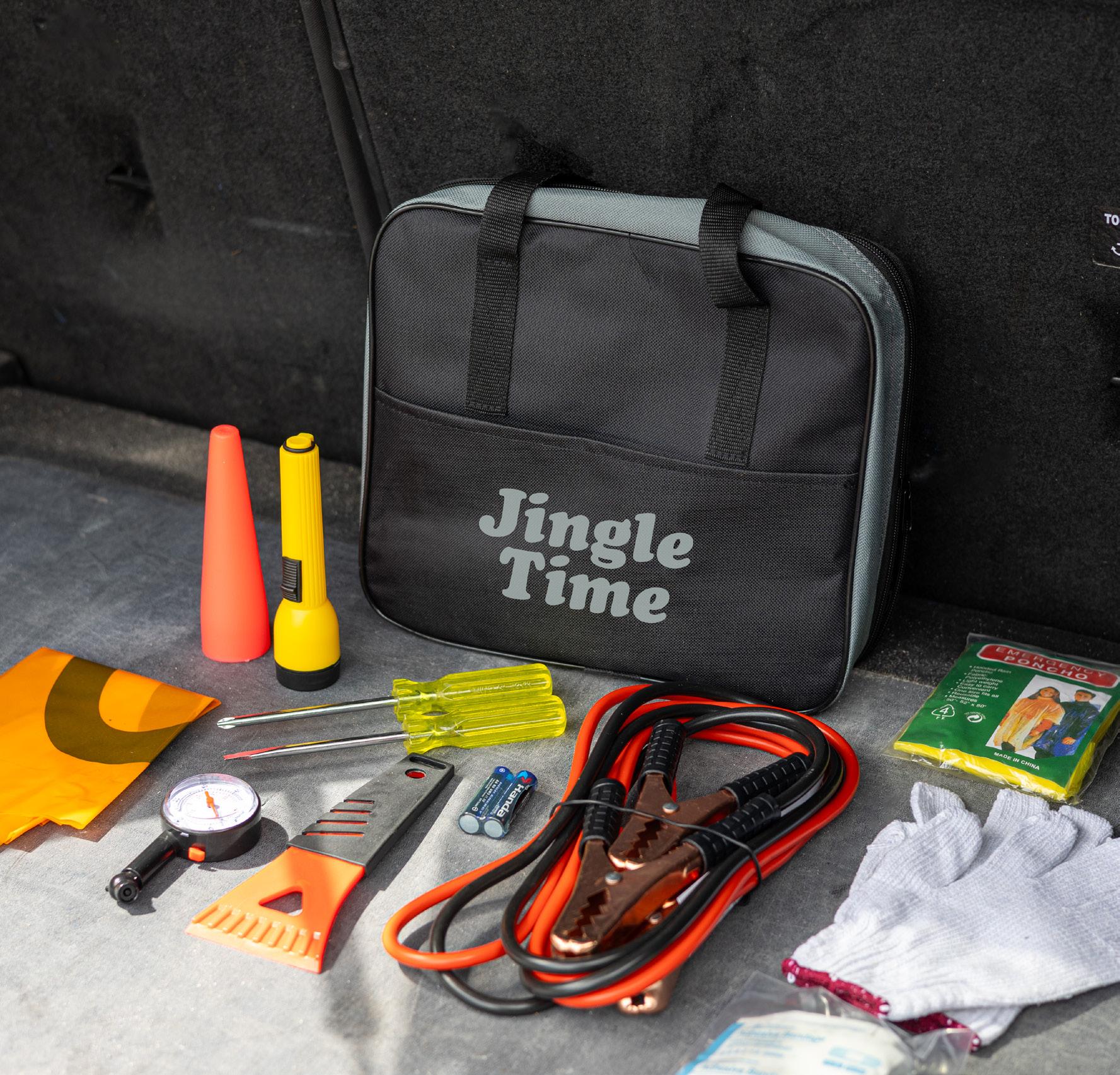 • Includes: First Aid Kit, Poncho, Gloves, Scraper, Tire Gauge, Jumper Cables, SOS Banner, Battery, Screwdriver, Flashlight And Emergency Cone
