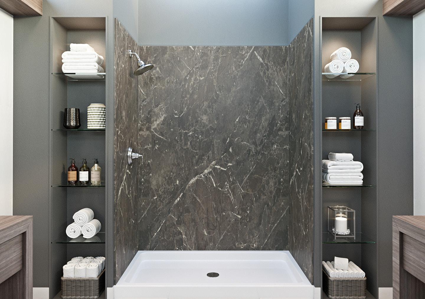 Our 10 luxe designs can be fully customized to fit unique specifications. Surround a bathroom in seamless luxury by covering all the walls. Or, keep it simple in a standard shower stall.