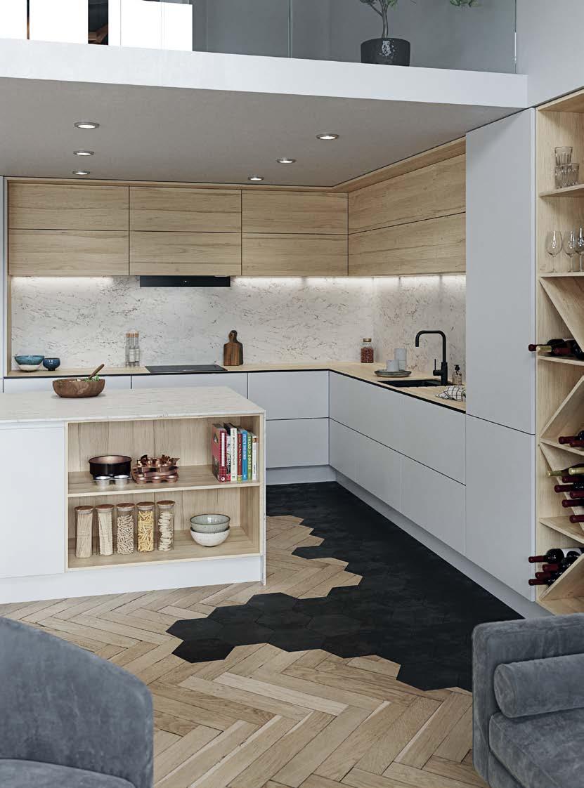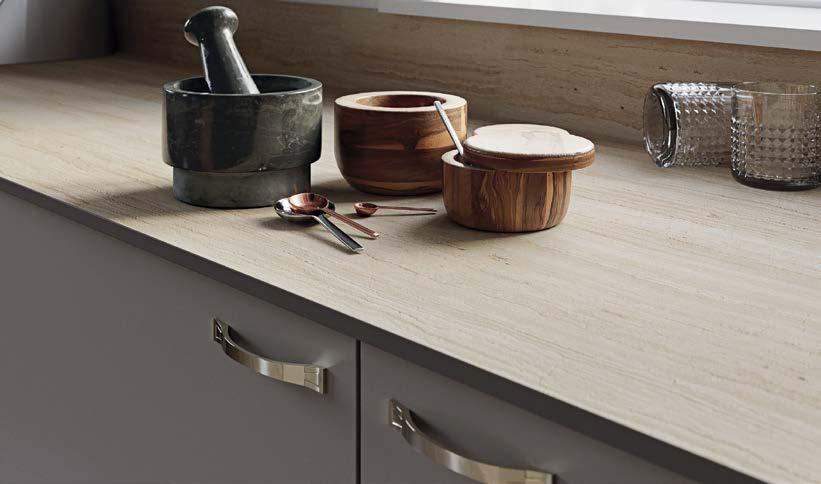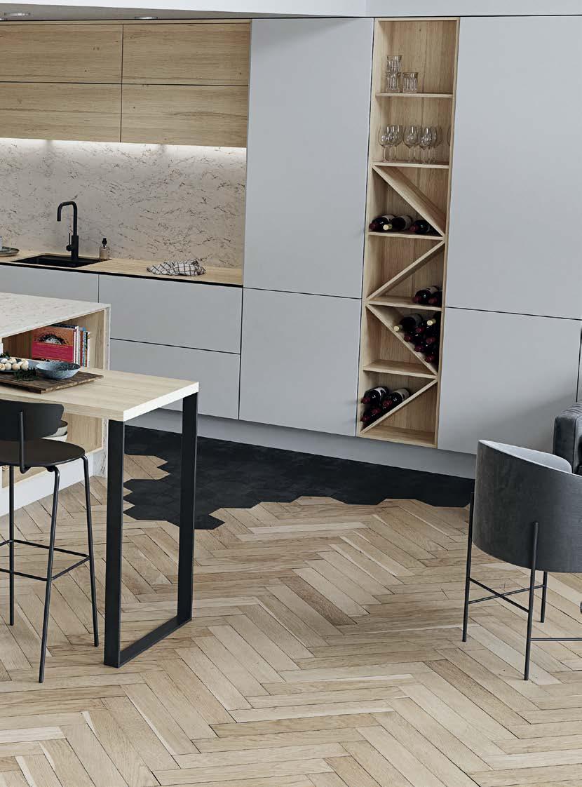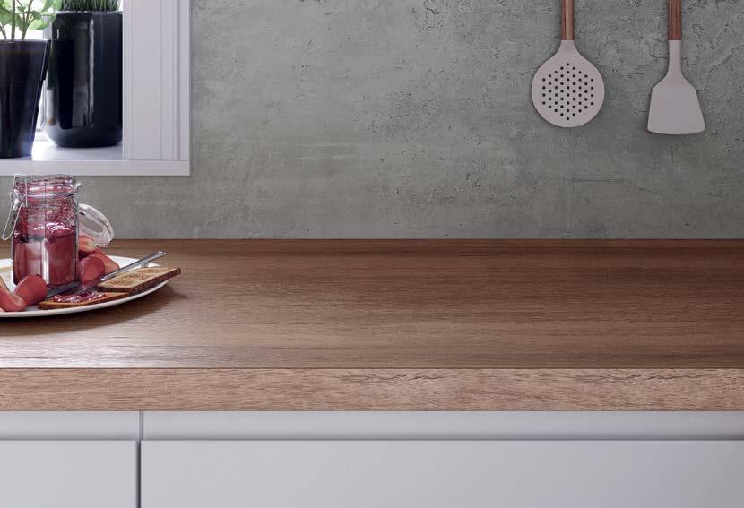 Il pannello Chêne Adrian associato alla finitura Essencia conferisce al Top Cucina un realistico effetto legno massiccio.