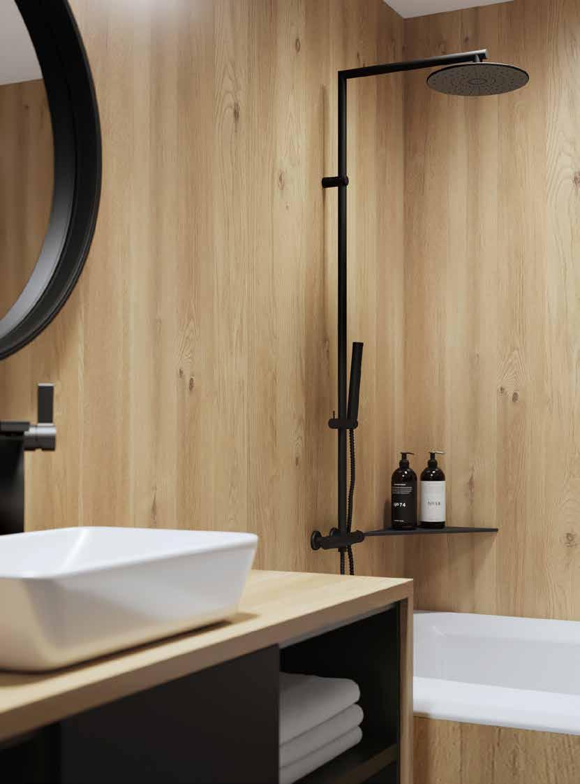 Assembly is seamless thanks to its water resistant system of tongue and groove panels and the Complete range of coloured sealants, for that perfect design and water-tightness. The panel's rounded edges mean there is no need for edge trims, thus guaranteeing a perfect finish for your bathroom.