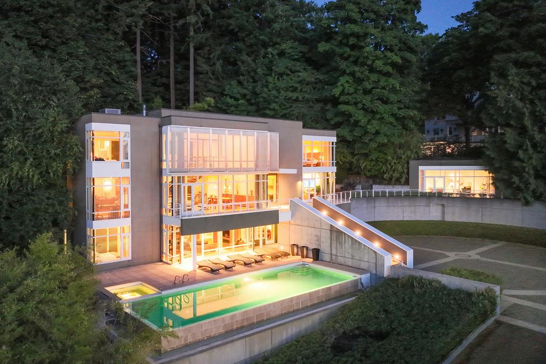 This magnificent architecturally designed home, perfectly perched on the shores of coveted Port Madison, boasts breathtaking tall ceilings, custom floor-to-ceiling