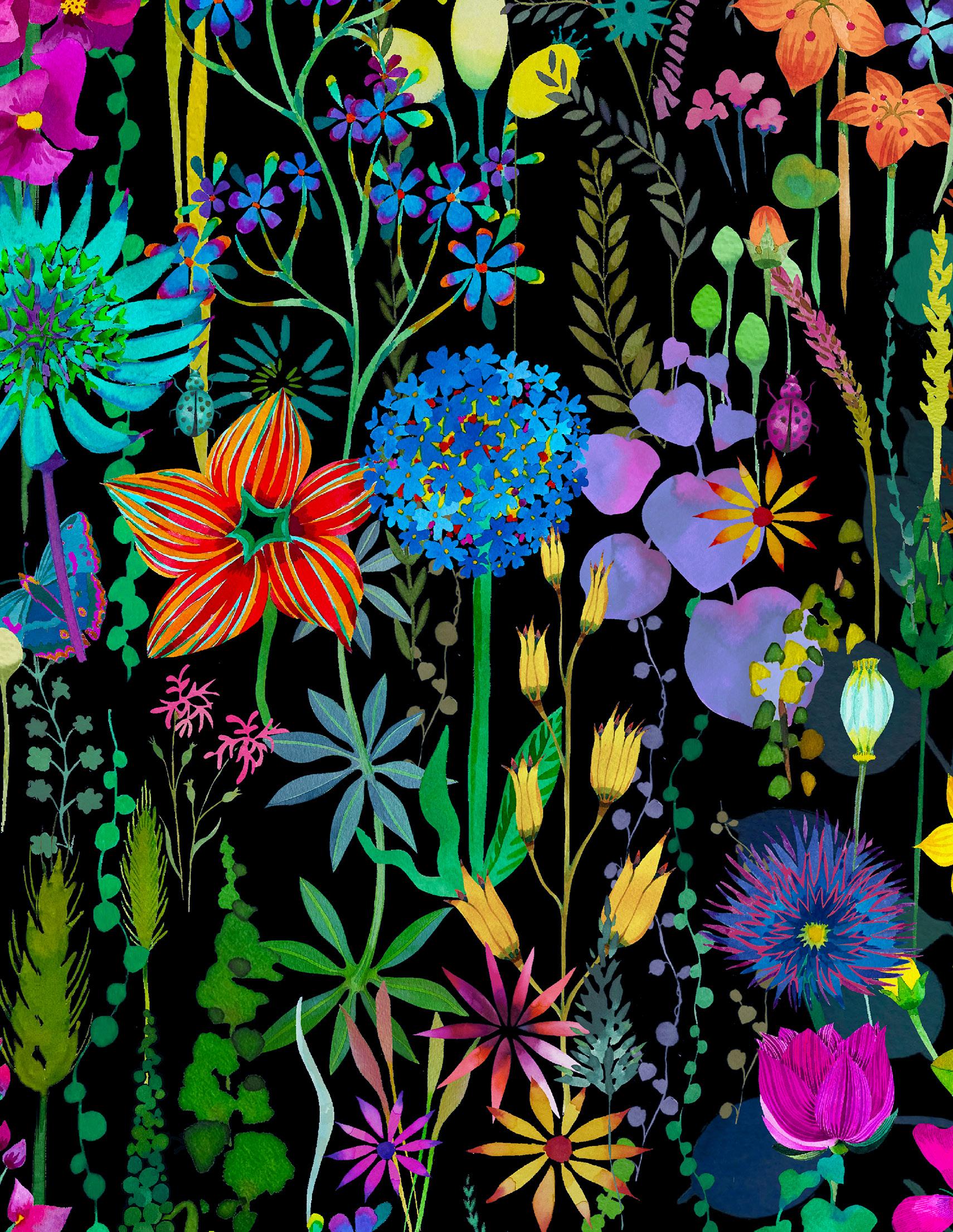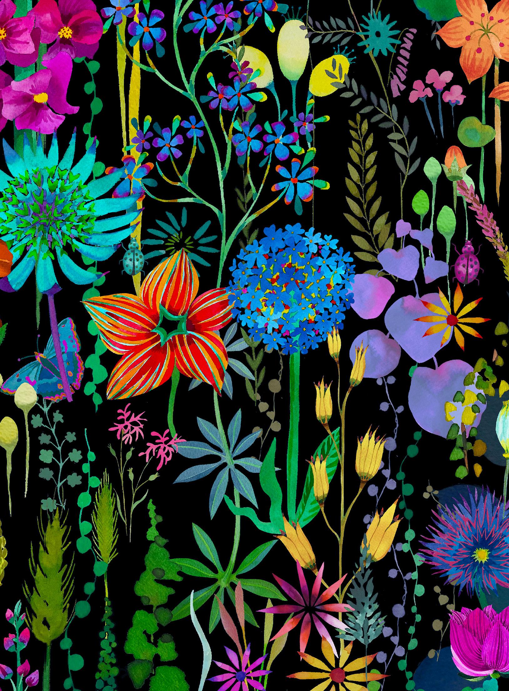 Gardenia is a painterly collection inspired by wild meadows and ancient hedgerows. The richly coloured prints pop and burst with life, whilst inky black grounds imbue the luminescent florals with yet more effervescent energy.