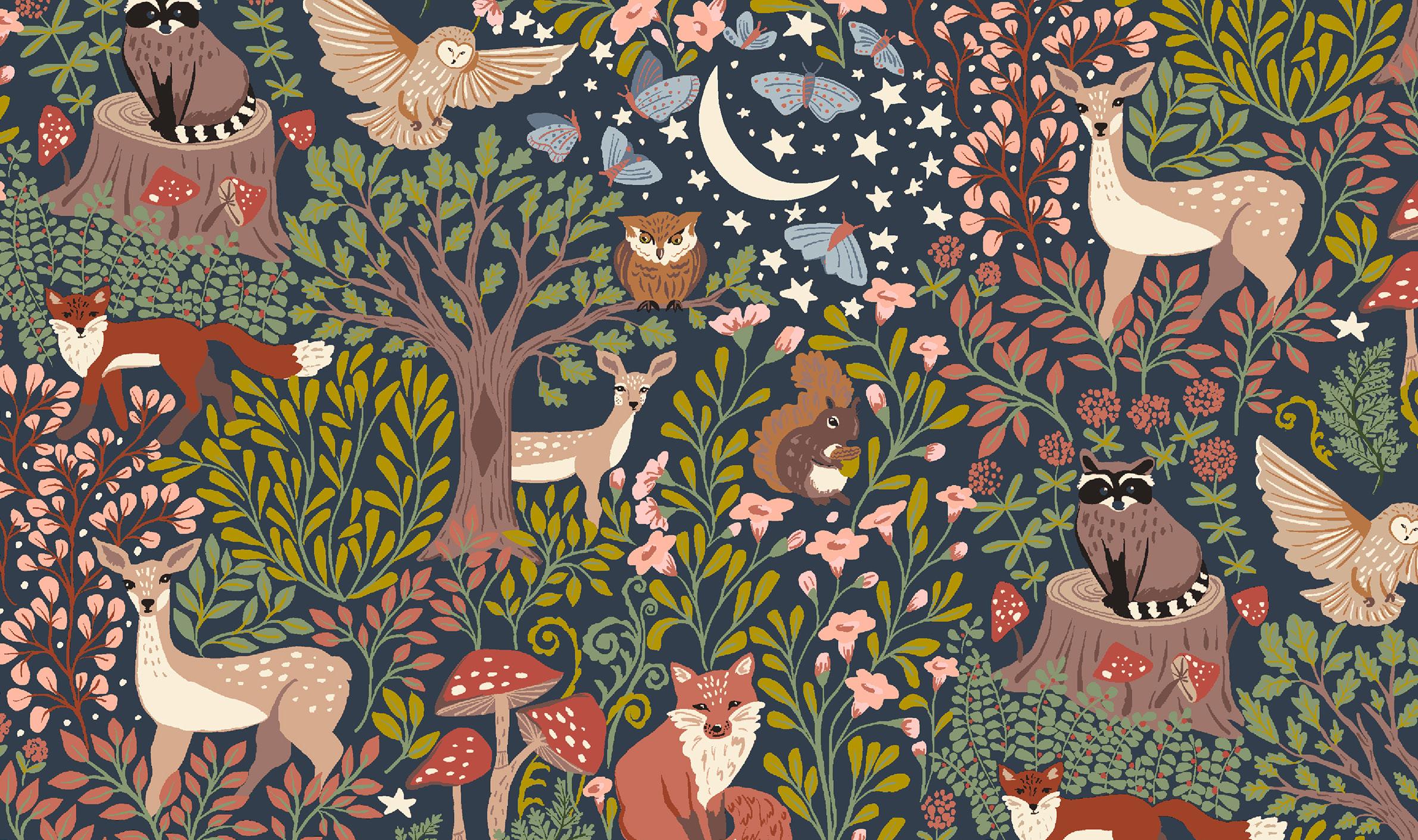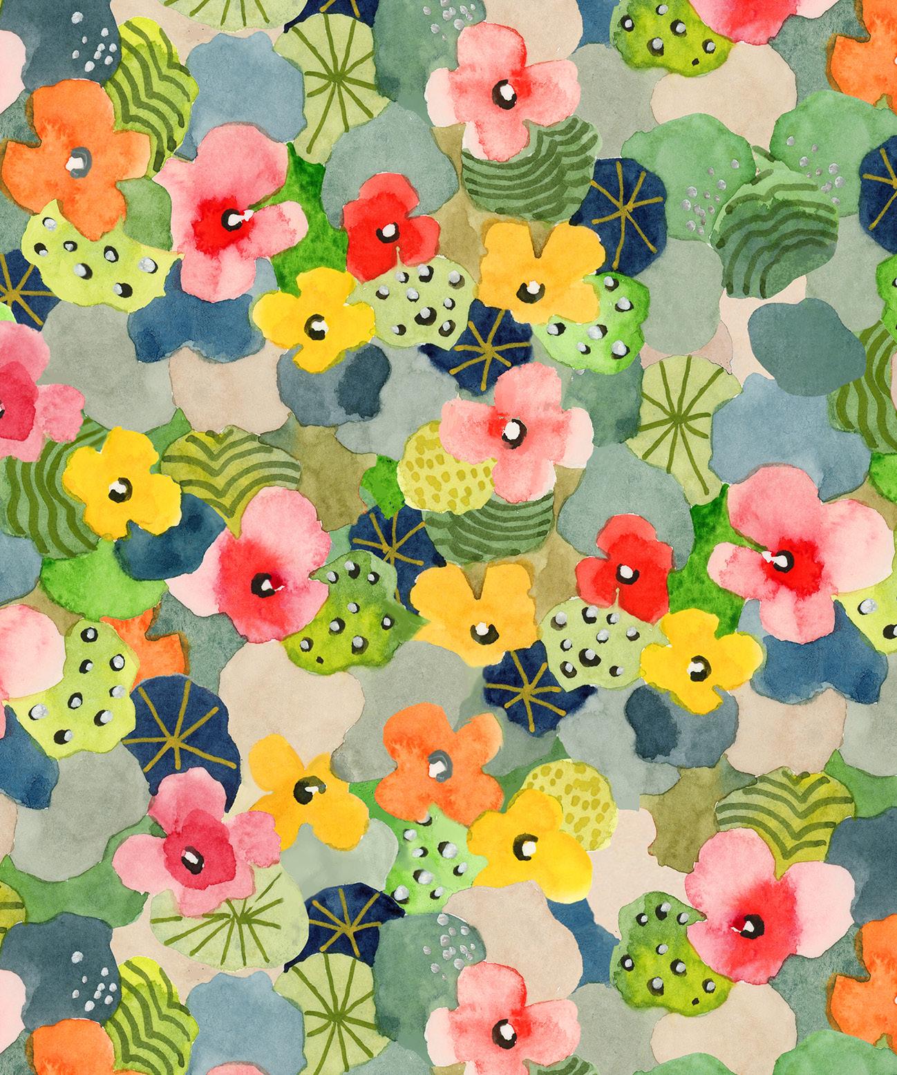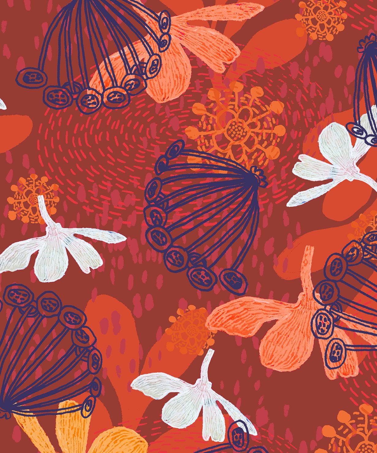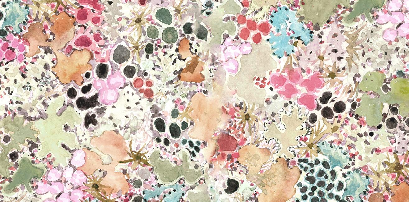 “The artwork in this collection was created by hand, during the long days of Spring, 2020. I had moved with my family to the Catskill Mountains and was recovering from covid. I had not yet shut my studio in Manhattan, thinking that I would return imminently, and had none of my digital drawing tools or equipment with me. I had been considering the idea of creating a fabric collection with hand inked and painted artwork for some time. I was interested in the idea that advances in digitally printed fabric meant that I was not limited to working with solid masses of color. Plot twist! Technology was giving me the opportunity to work by hand!”