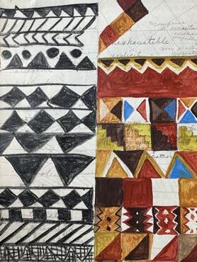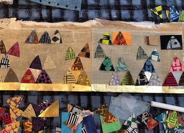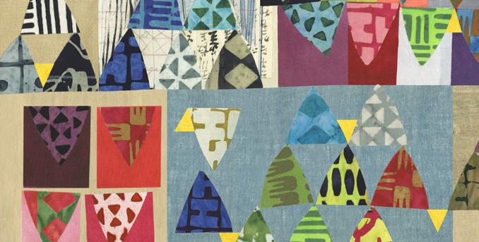 I referenced the triangles in Stenographer’s Notebook designs for the hero fabric and used an accordion book I had made from vintage Japanese papers. The aged papers in the book were so beautiful that the open spaces where they were visible became an important element in the overall design. This fabric became a spot to sneak in favorites that didn’t make the final collection. Little golden triangles are a nod to the gold leaf found on the vintage papers.