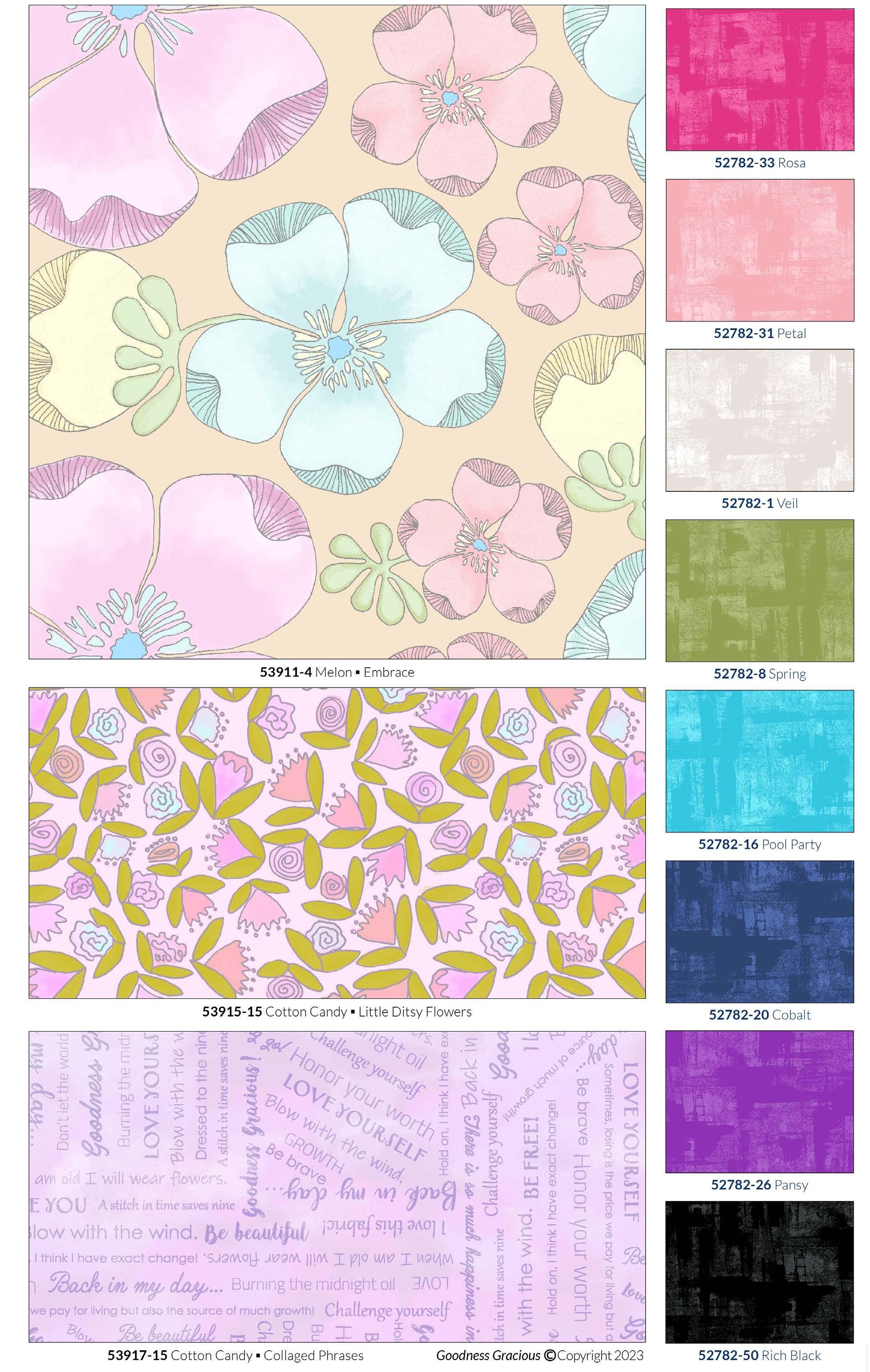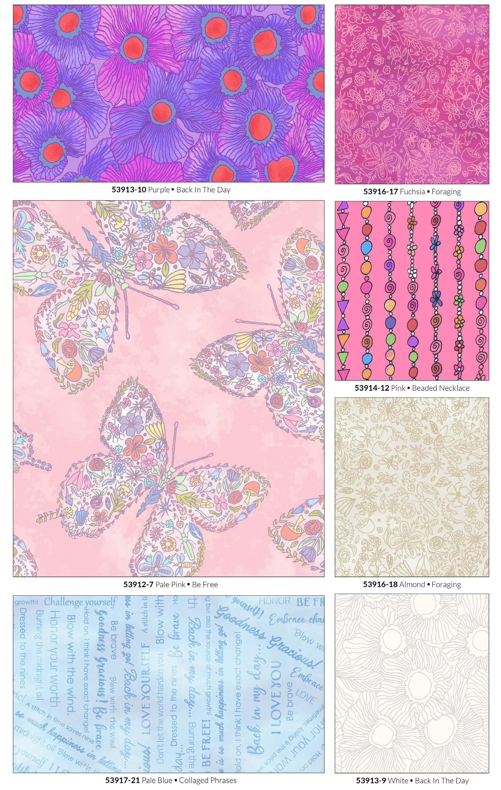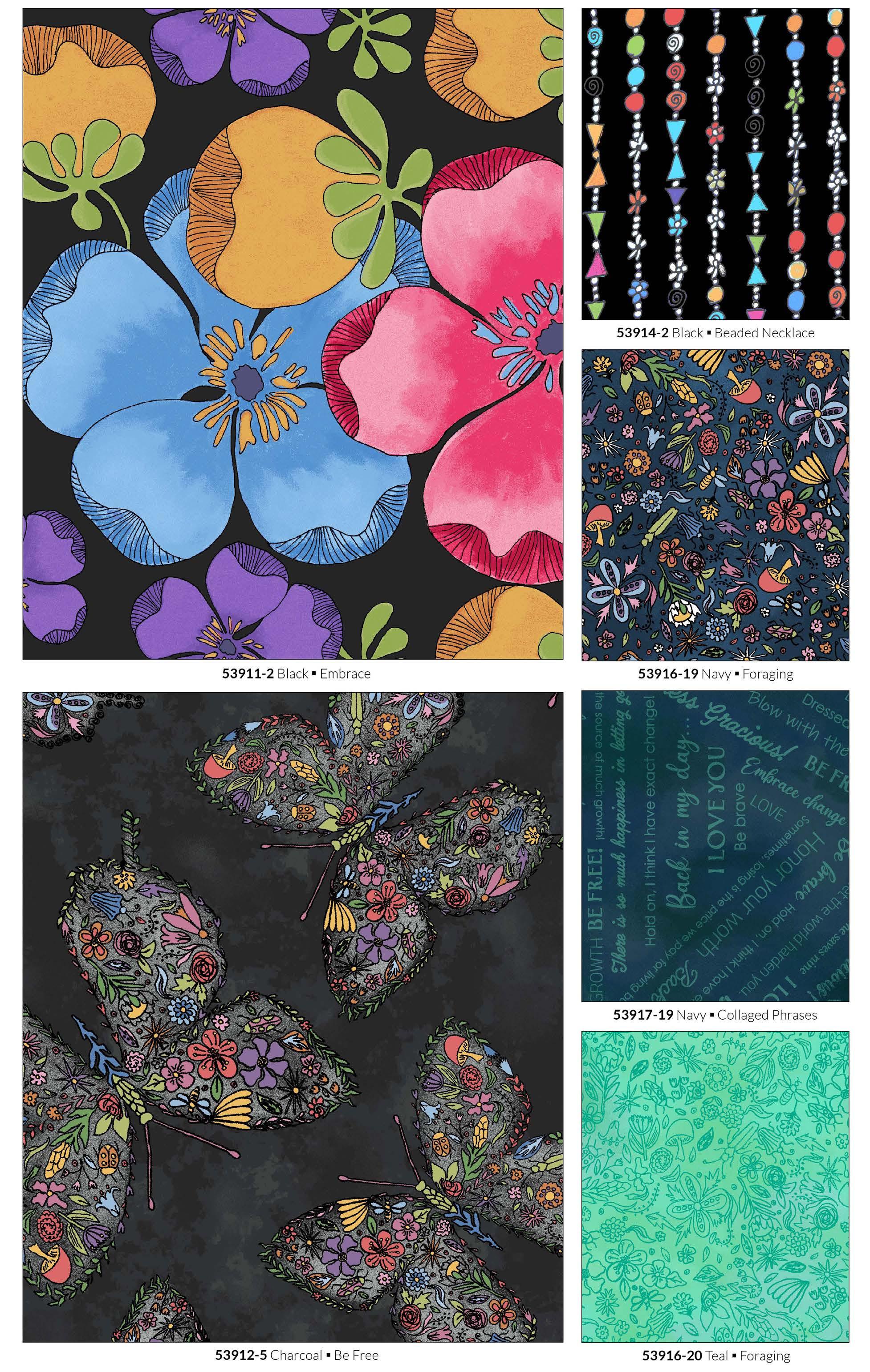 Laura’s love of all things floral has brought life to this collection. Overflowing with modern painterly flowers, butterflies and her signature collage prints, this collection is perfect for a wide variety of quilting and sewing projects. From jewel tones to soft pastels, there is something for everyone.