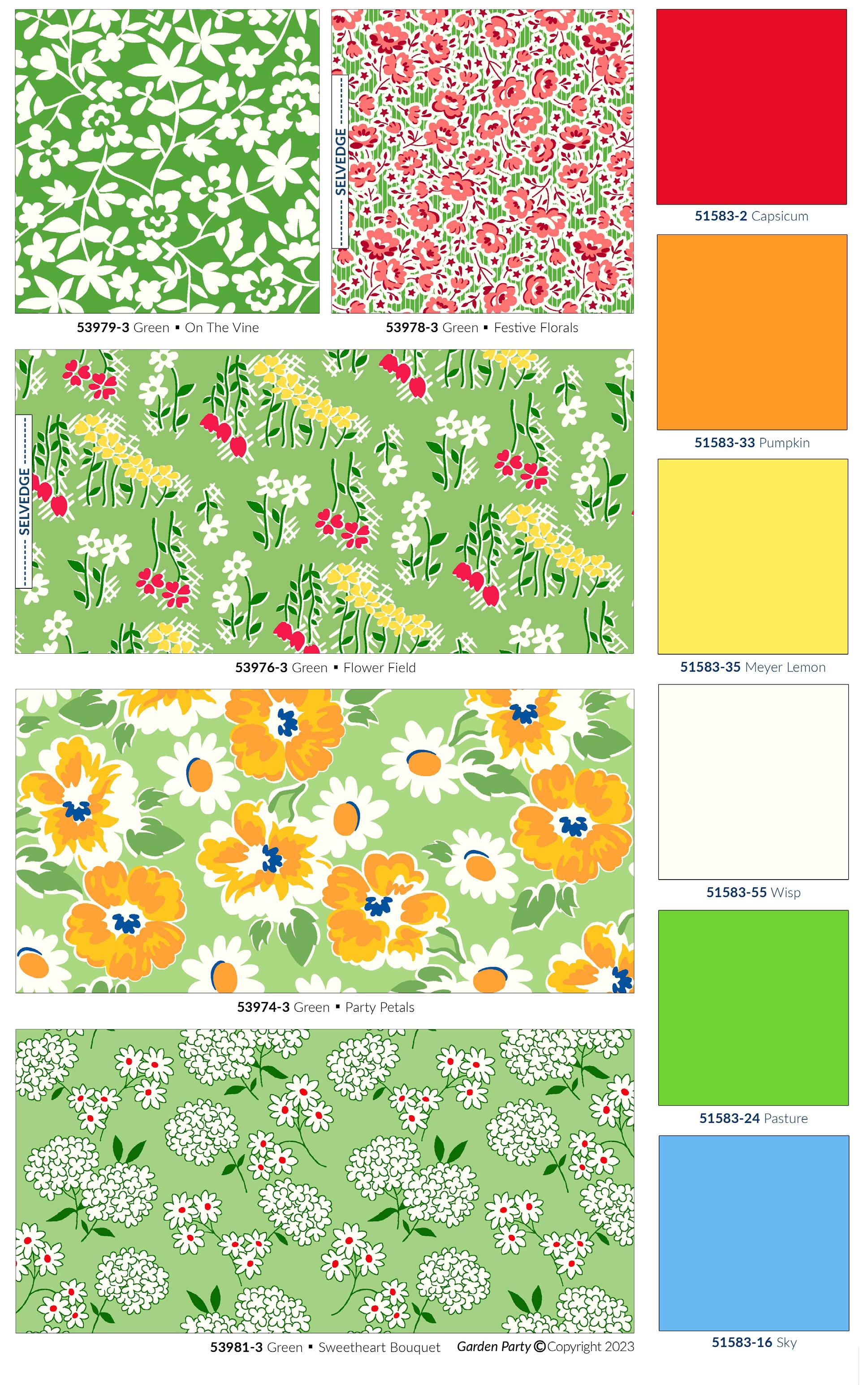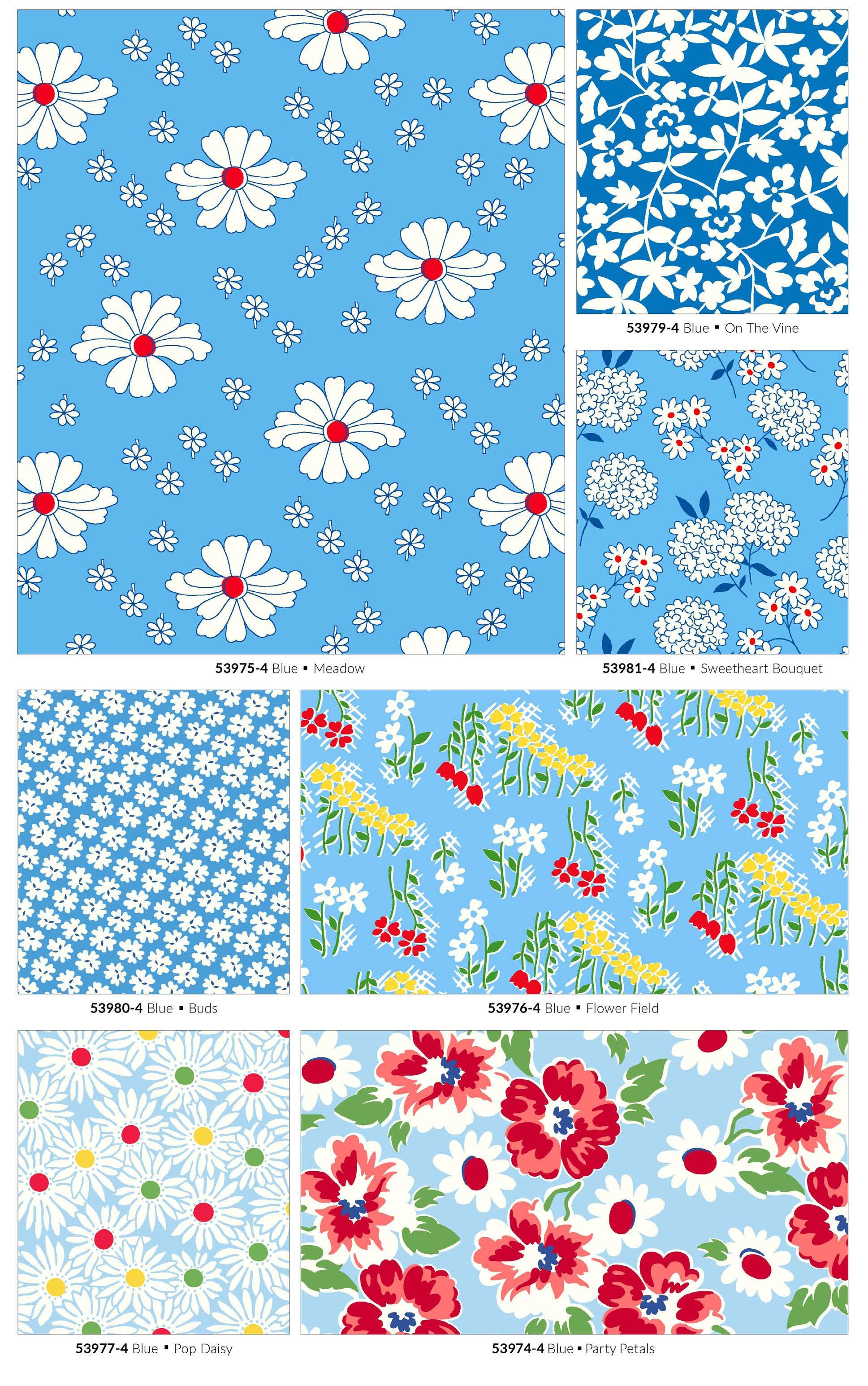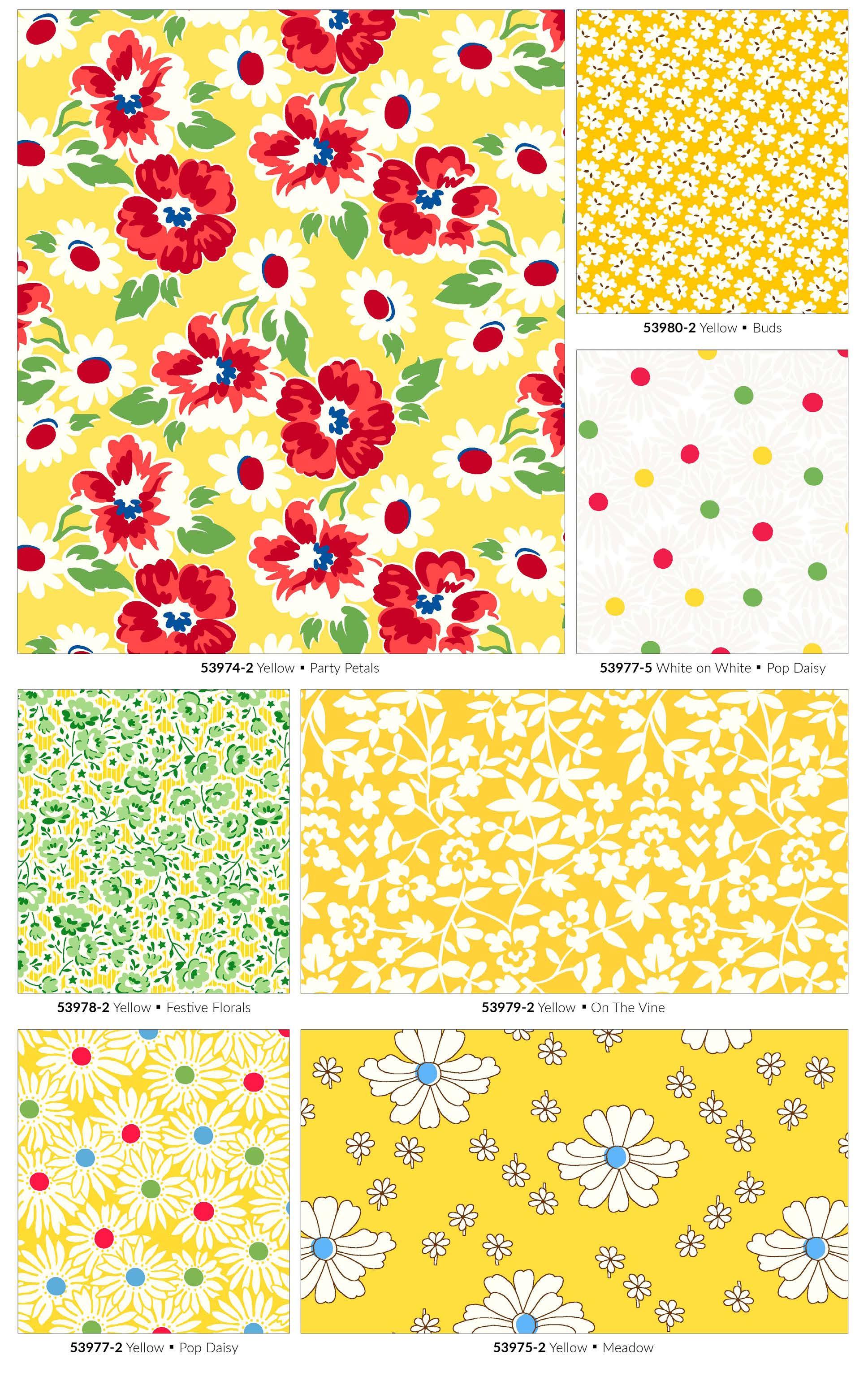 Each design in Garden Party reflects the charming story behind patterns that were popular in the 1930’s. Petite florals, delicate vines and sweet polka dots are available in a retro palette of cherry red, sunshine yellow, leaf green and cornflower blue. Create whimsical, handcrafted treasures that will be cherished and passed down through the generations.