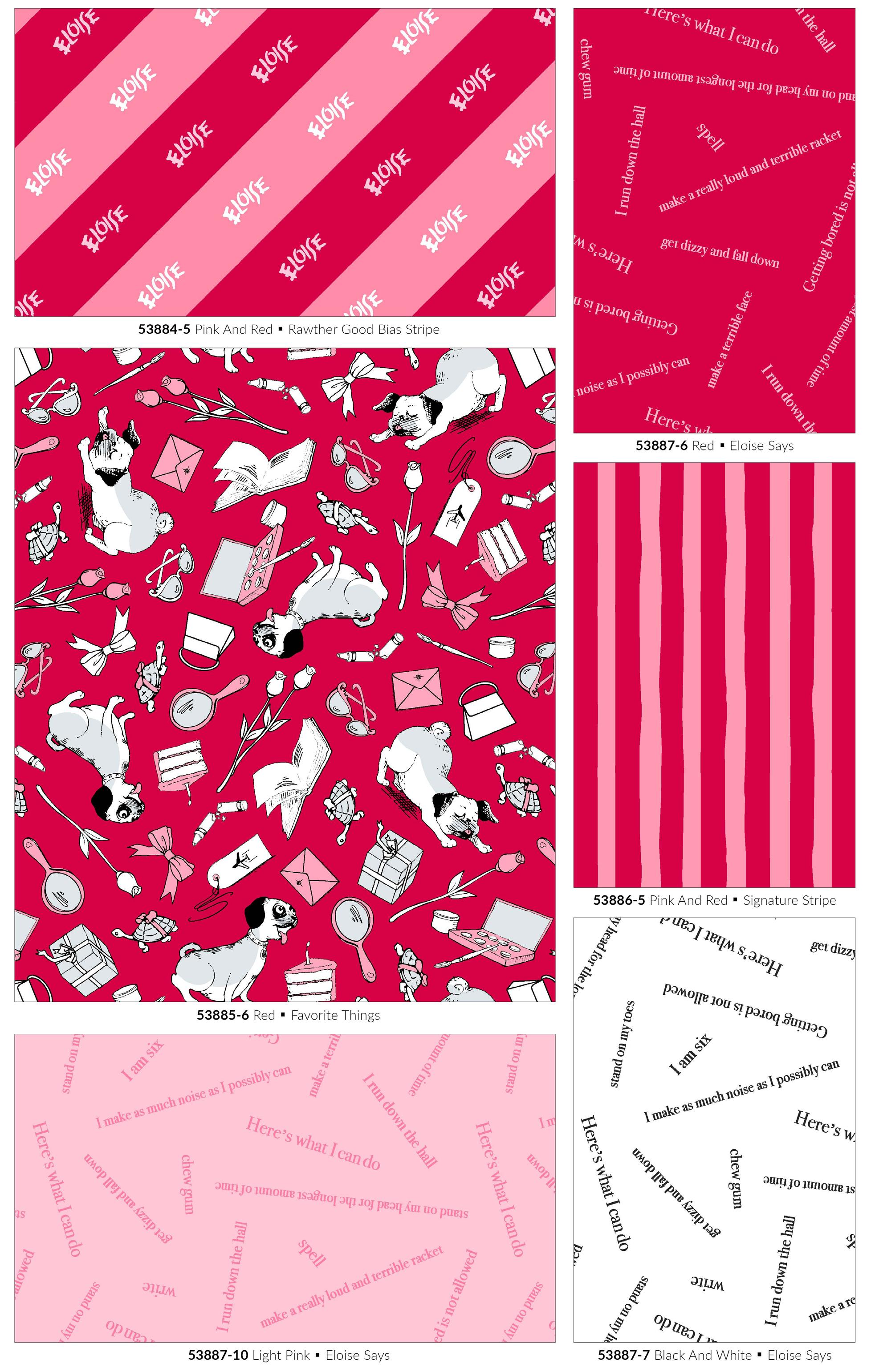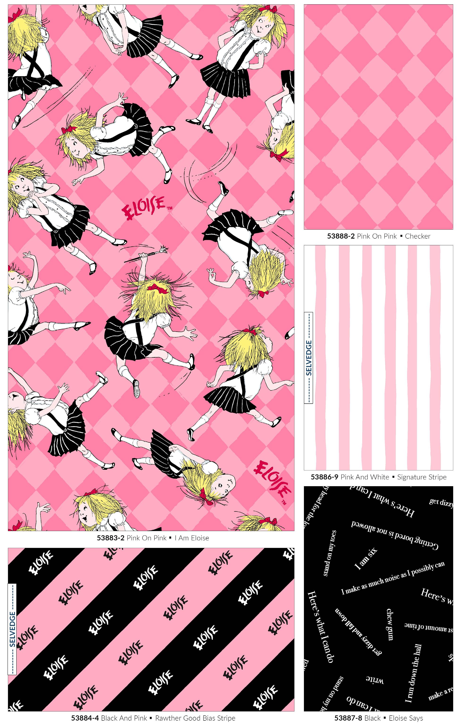 Based on the popular children’s books, the Eloise fabric collection will amaze and delight! Eloise is a plucky and precocious young girl who lives in the “room at the tippy-top floor” of the Plaza Hotel in New York City with her nanny, her pug, Weenie, and her turtle, Skipperdee. This classic bubble gum pink, cherry red, black and white collection will add charm to any kid’s accessories or garments!