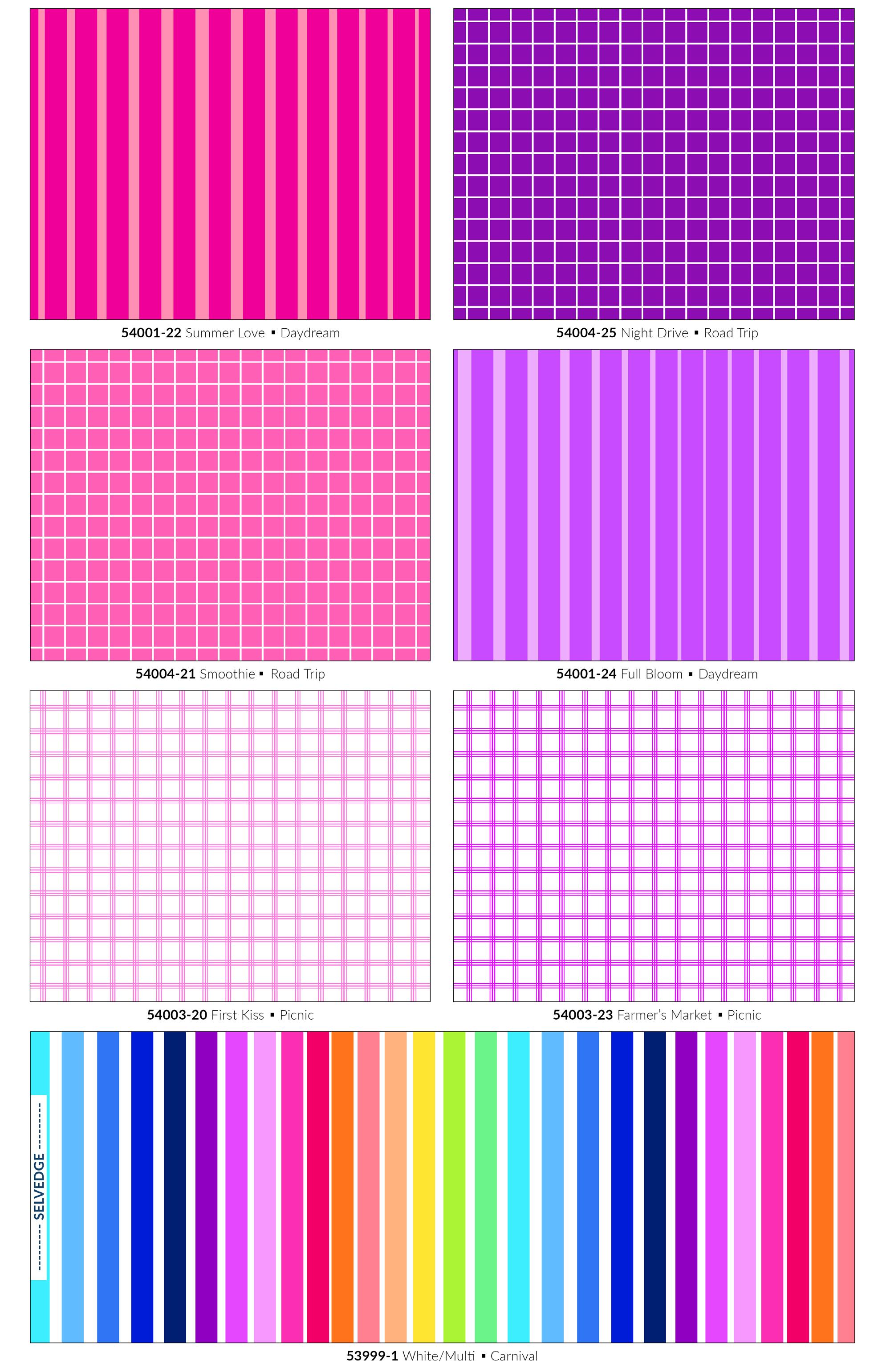 Picture yourself lounging on a hammock, sipping a fresh lemonade, and soaking up the warmth of a summer breeze. With its delightful assortment of stripes, checks and plaids, this collection captures the essence of carefree summer days. In a bright, rainbow color palette, get ready to sew your way into a world where every day feels like a Summer Friday!