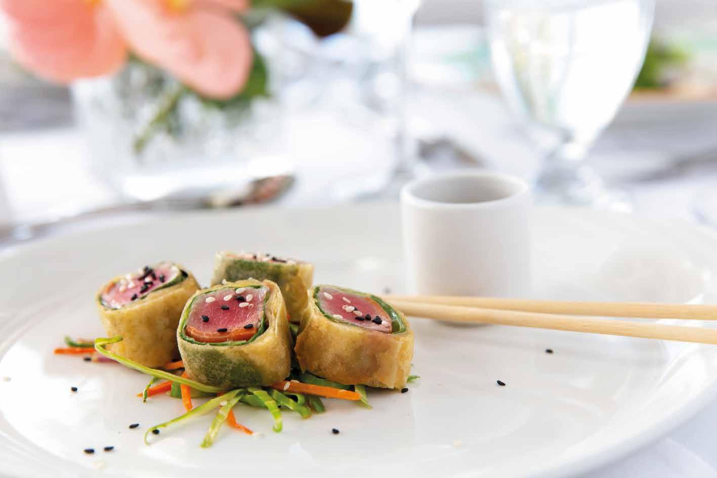 Vegetarian California Roll: Cucumber, Red Pepper, Avocado with Wasabi, Prosciutto and Melon