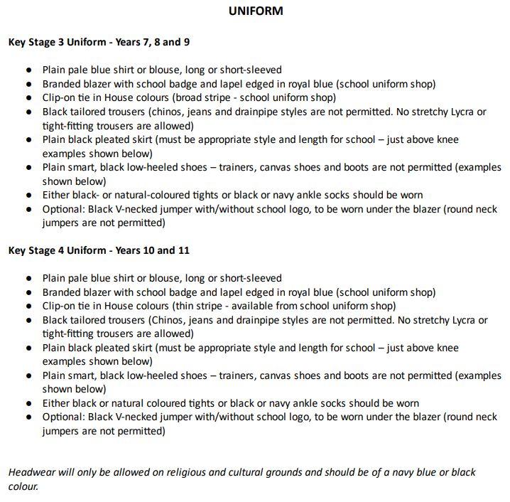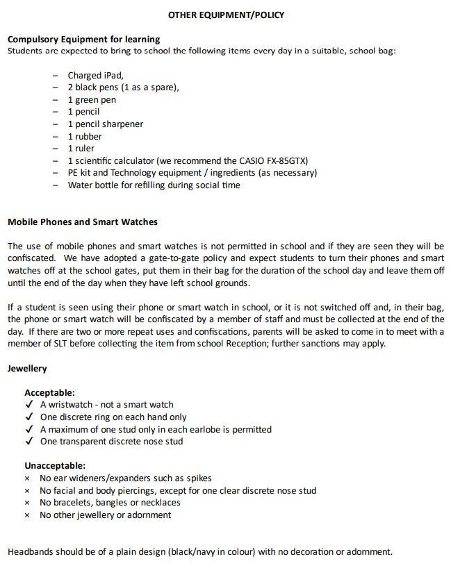 Therewerenosignificantchangestoouruniformpolicythisacademicyear.Wearecompliantwiththe DfE’sdesiretokeepbrandeditemstoaminimum.Thefullupdatedpolicyispublishedonourwebsite.