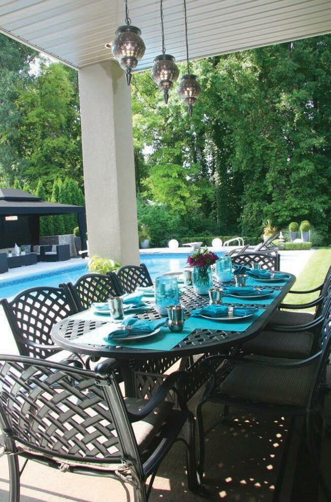 It is understandable that turquoise was chosen for the décor’s accent colour, considering how much thought the couple put into selecting the brilliant blue pool liner accented with a faux mosaic tile border. “We knew it would be such a focal point and it was hard to decide from a small sample,” says the wife. “I wanted the blue, blue, blue look of a resort.” ▼
