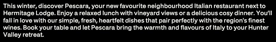 PH 4998 7776 OPEN Lunch Fri, Sat & Sun, Dinner Fri & Sat E info@huntersquarter.com.au W www.huntersquarter.com.au