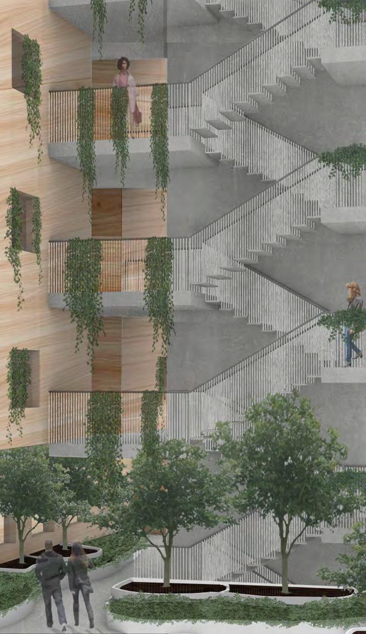 A common practice of Puerto Rican housing revolves around shipping containers. A shipping container unit maintains the height and width of 9.5 feet, and several options of depth including 10 feet, 20 feet, 30 feet, and 40 feet. The housing typologies in this project add and stack shipping container units to create functional and enjoyable spaces. There are 89 total units; 22 studios, 22 one-bedrooms, 24 twobedrooms, and 21 three-bedrooms.