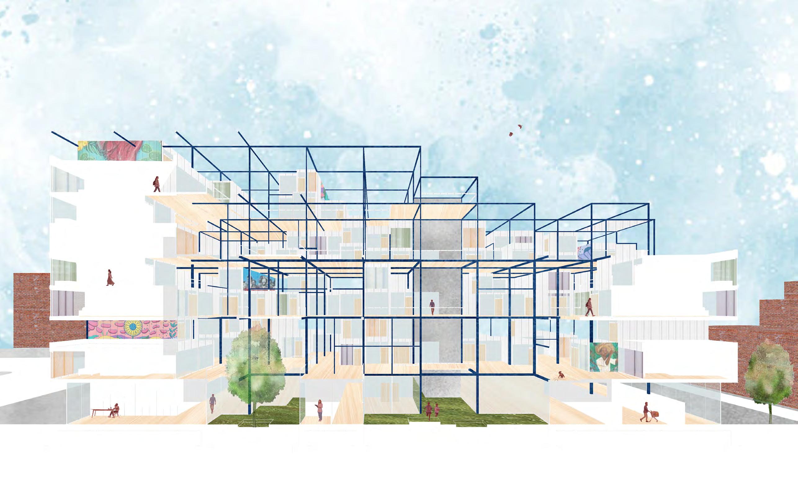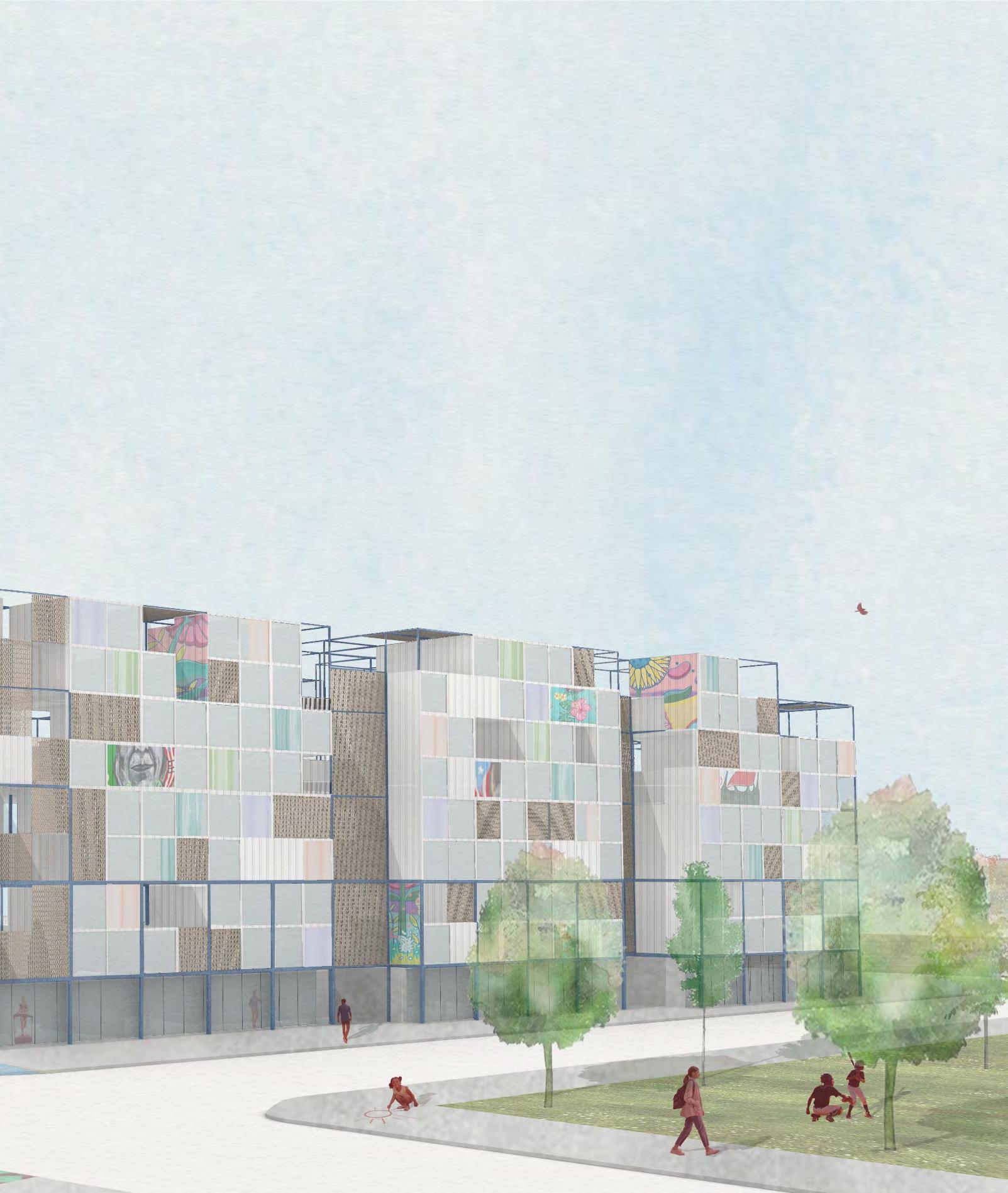 The scaffolding does not just frame the project - but its relationship to the neighborhood as well. The pockets of solid wall between pixelated facade creates a canvas for murals and artist interaction with the space - carrying on the vibrant nature of the Puerto Rican neighborhood.