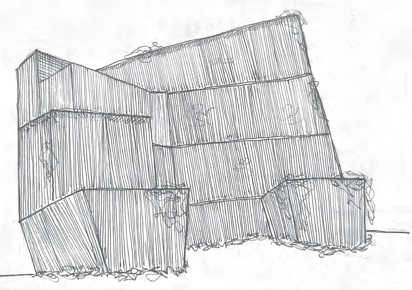 The complex structure of the tower is made up of two concrete massesone central and one peripheral - connected with large beams in tension. The structure allows for an open plan with no columns, providing office space which can be manipulated by the user, the central core houses the main circulation of the building, such as the stairs and elevator. The exterior mass contains punctuated holes for windows - these manipulate the tension points of the structure, increasing the complexity.